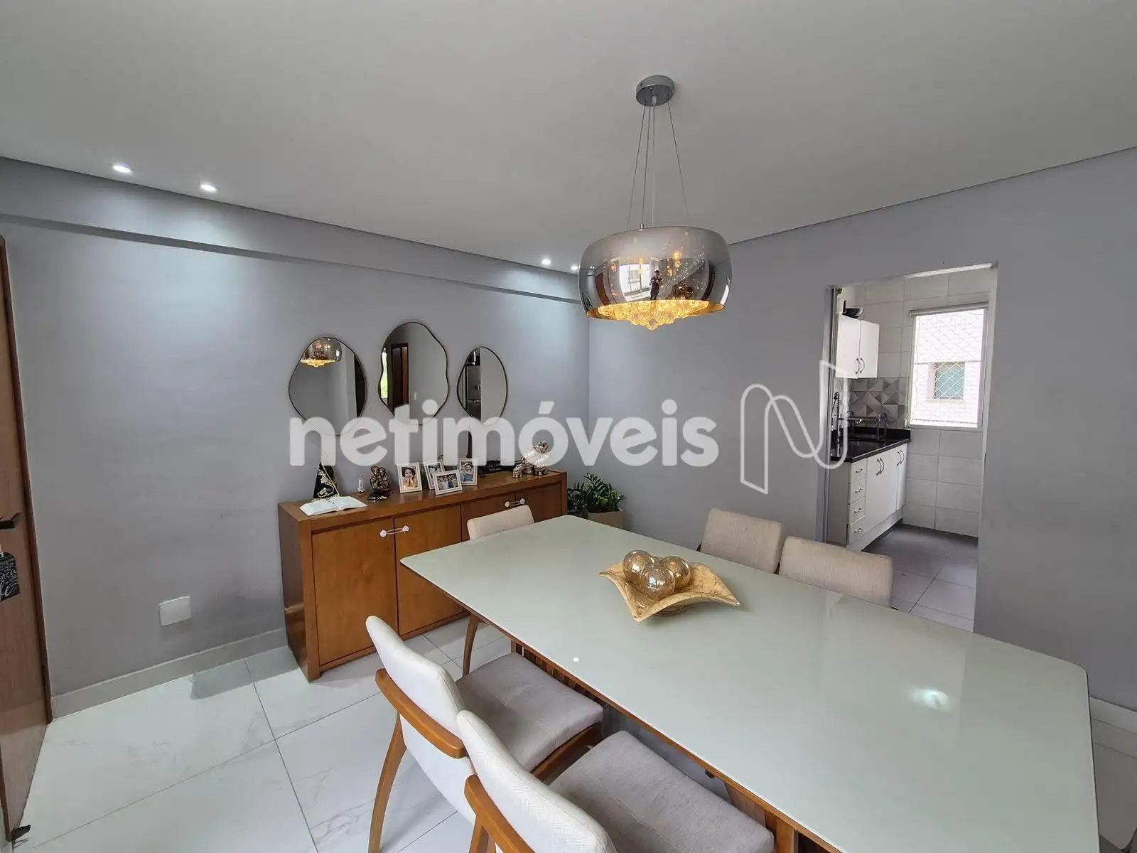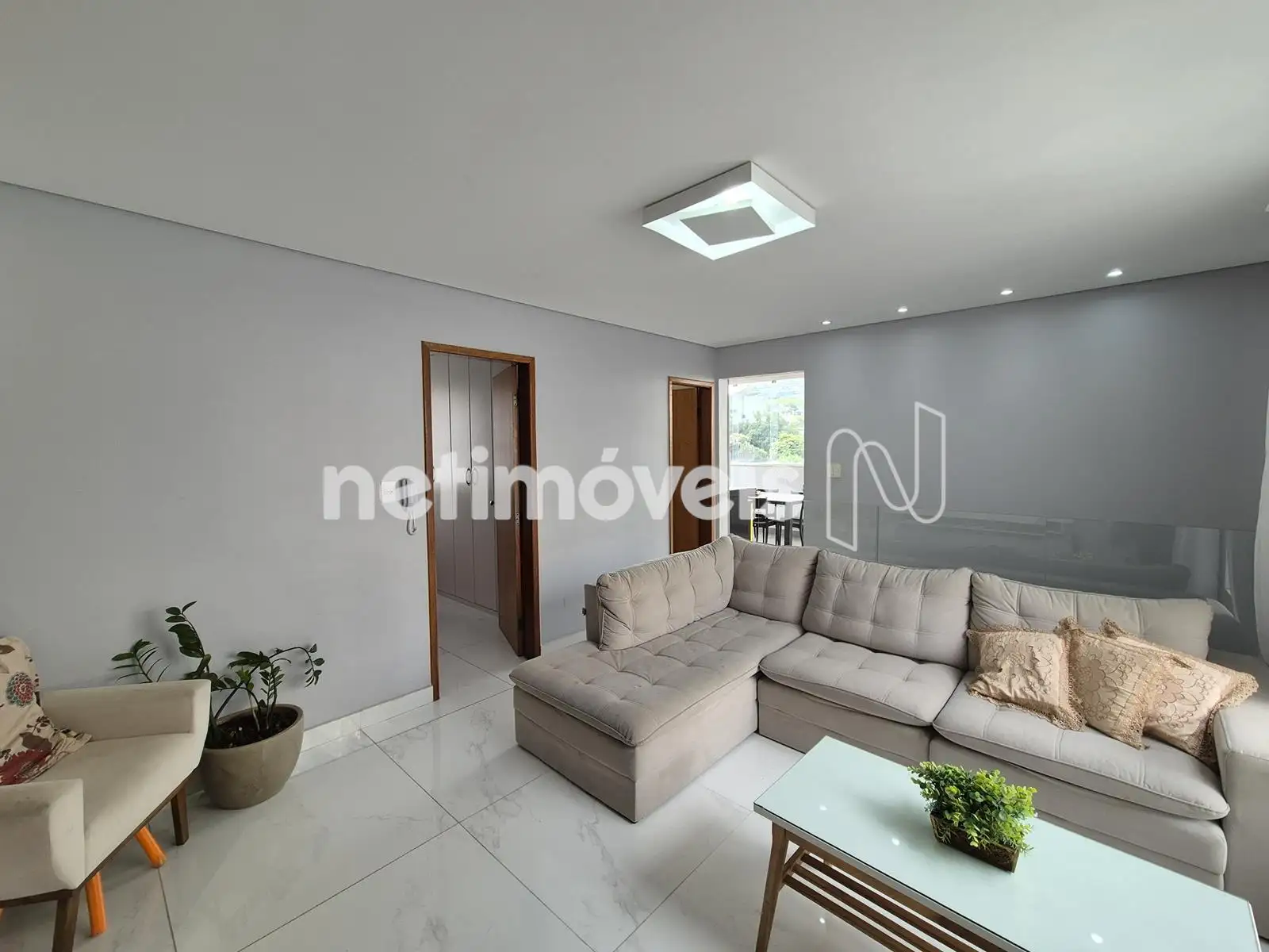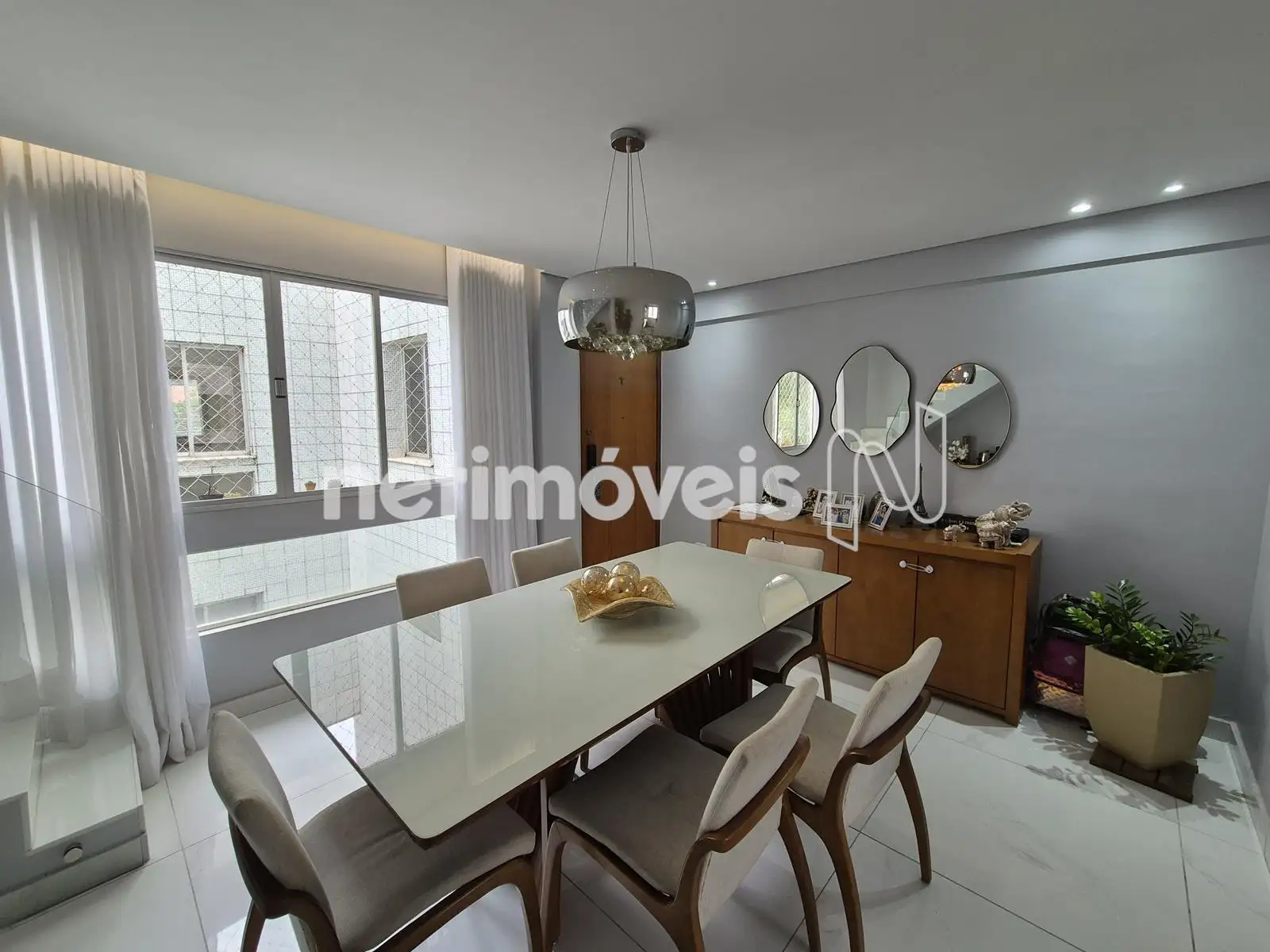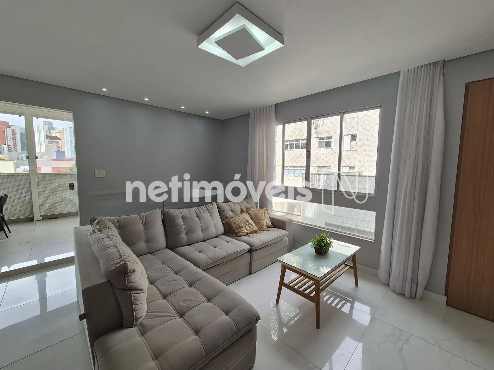 - Sala ampla para dois ambientes, cortinas, iluminação, piso de porcelanato, espelho