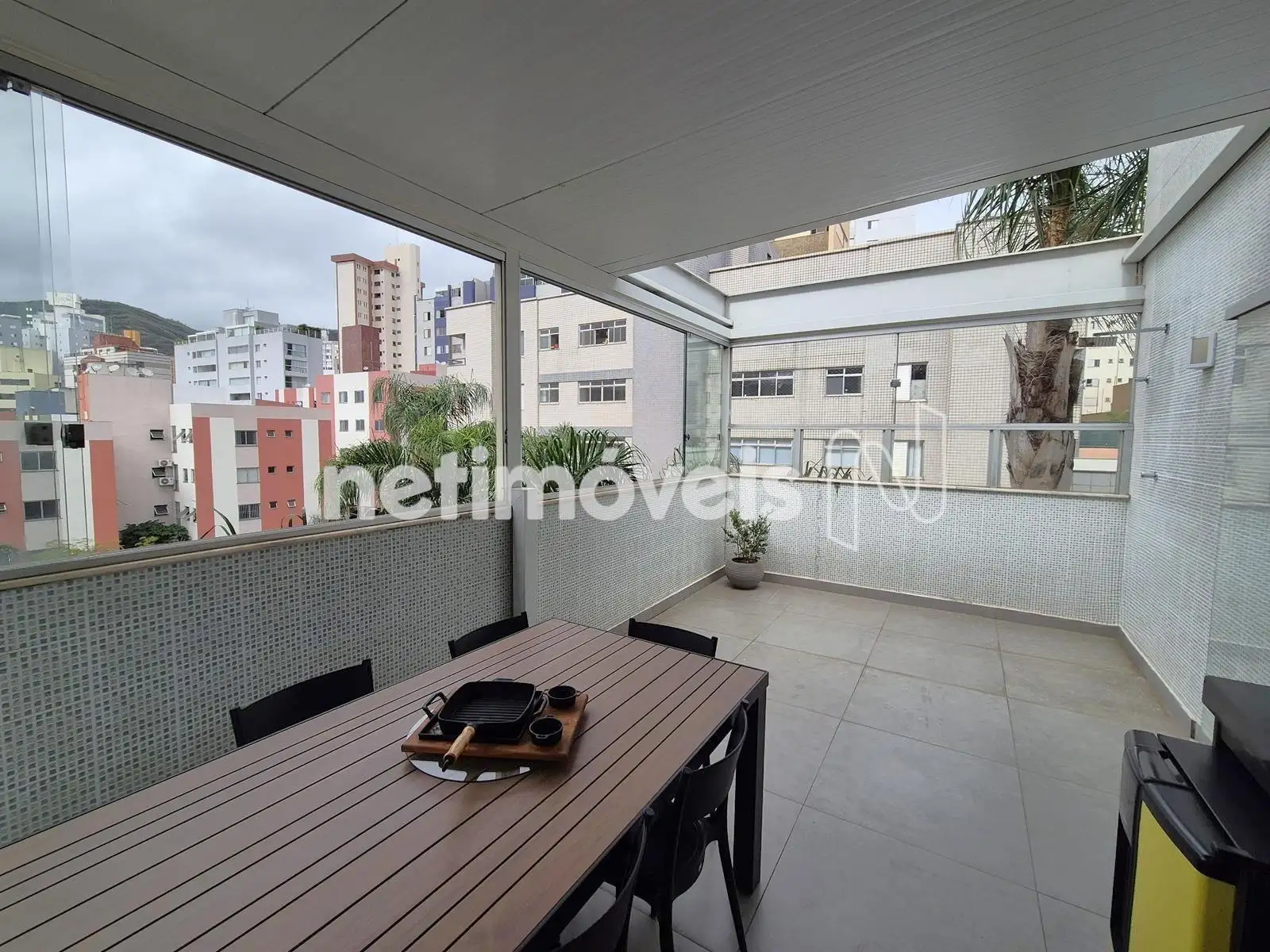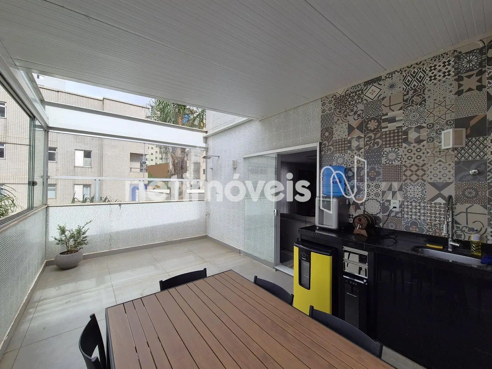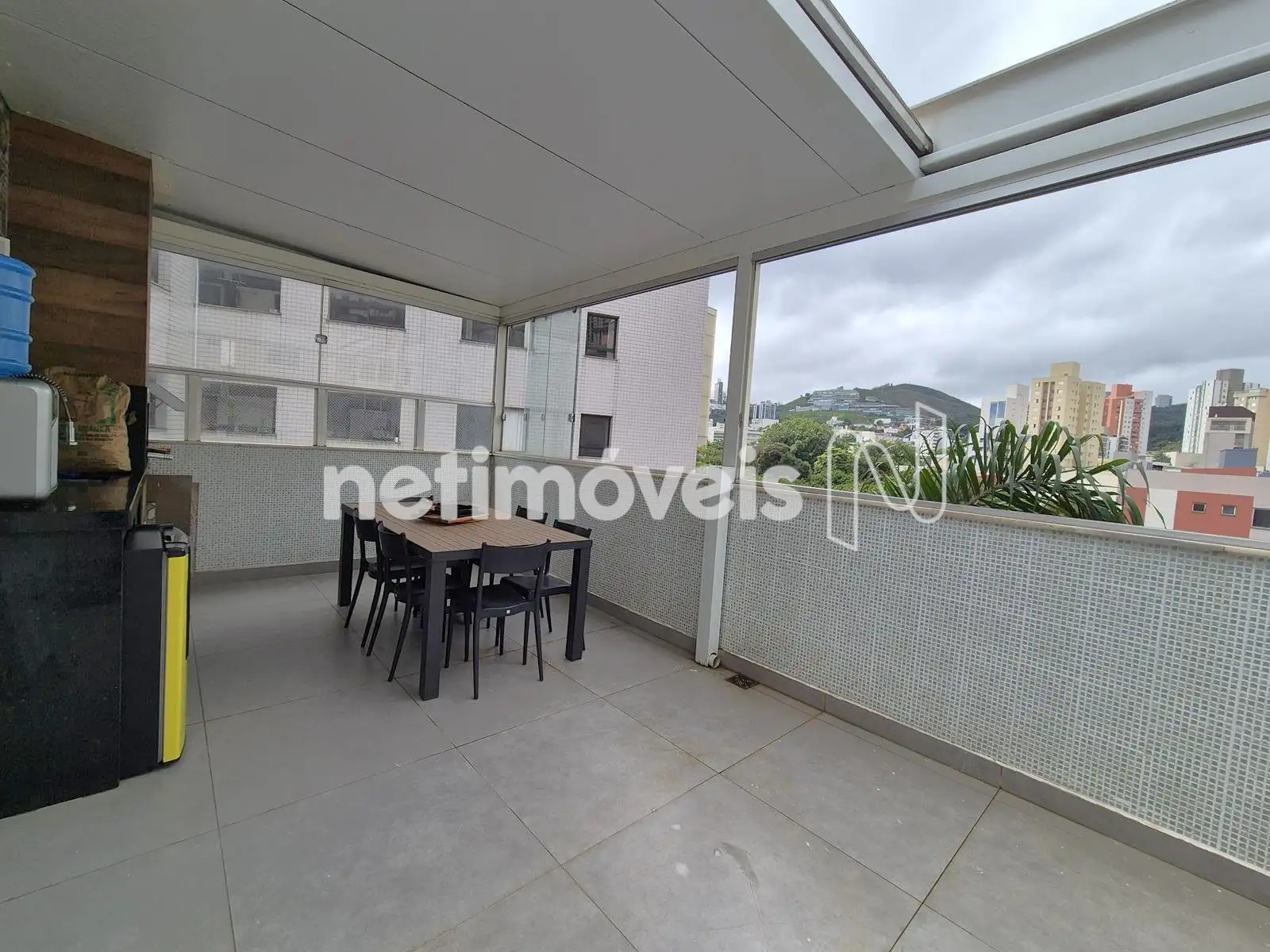 - Área Externa com espaço gourmet, cobertura de telhada sanduíche parte retrátil, bancada de granito, armários, churrasqueira, fechamento em blindex
