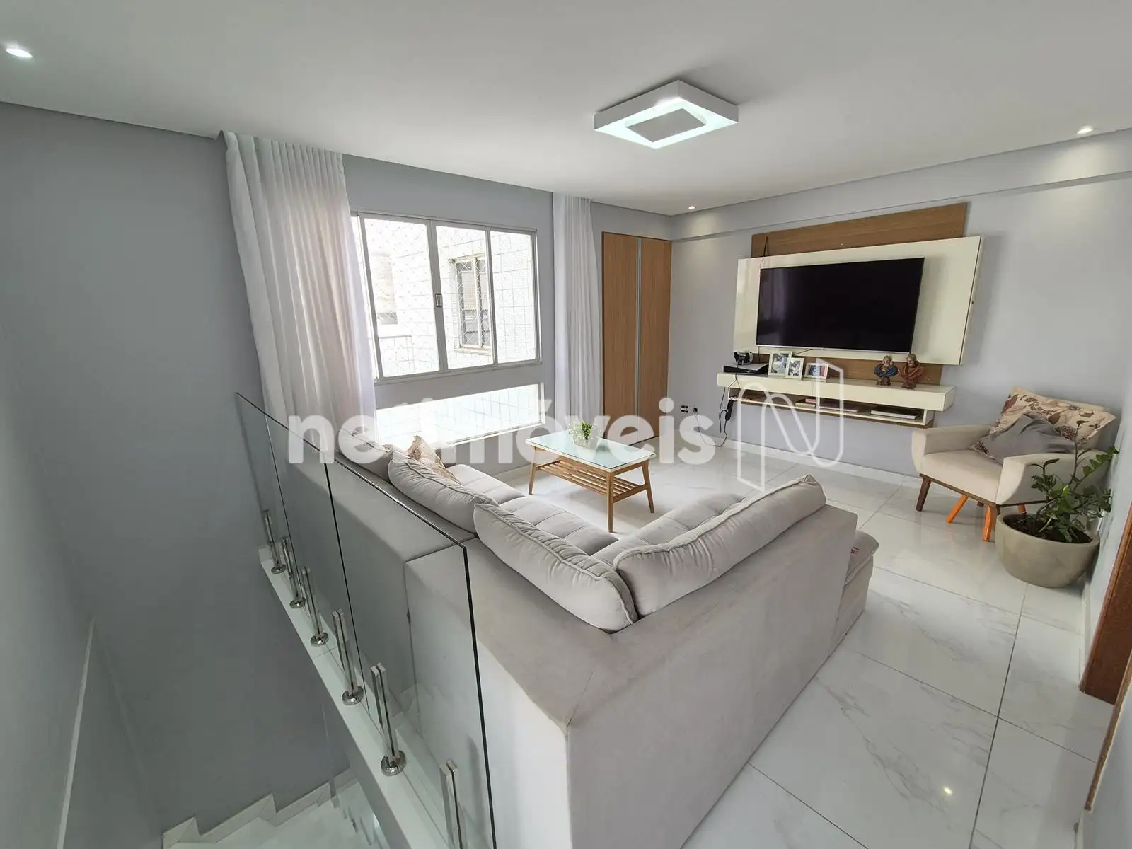 - Sala de TV com piso de porcelanato, painel, cortinas