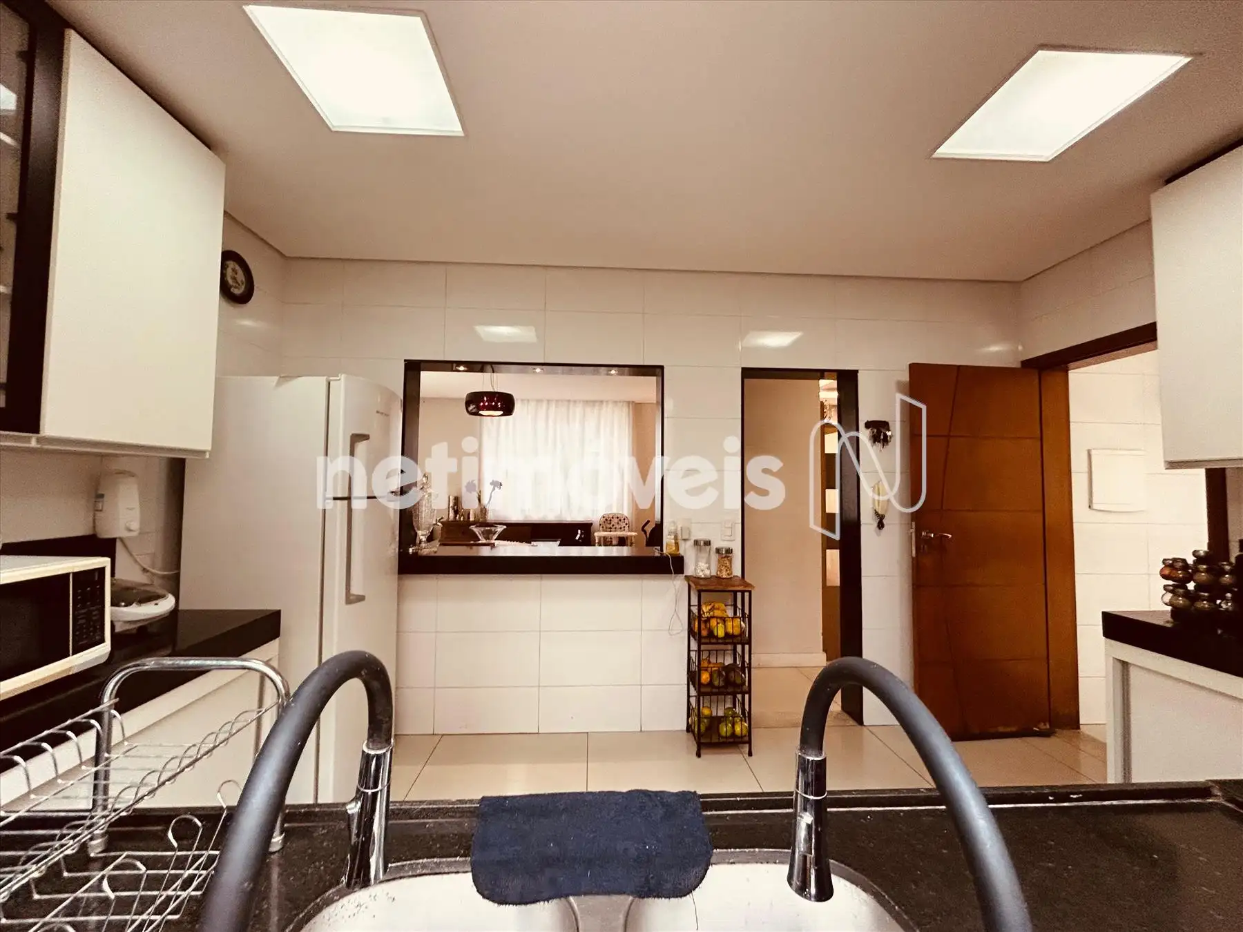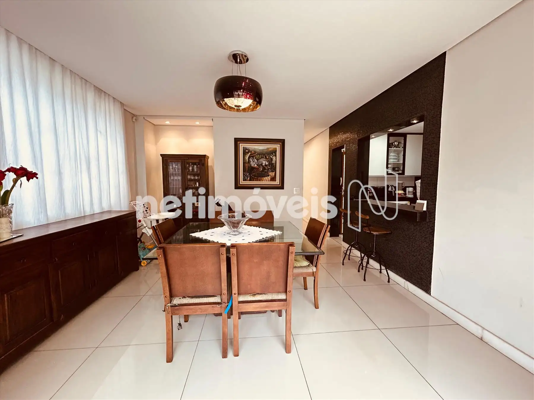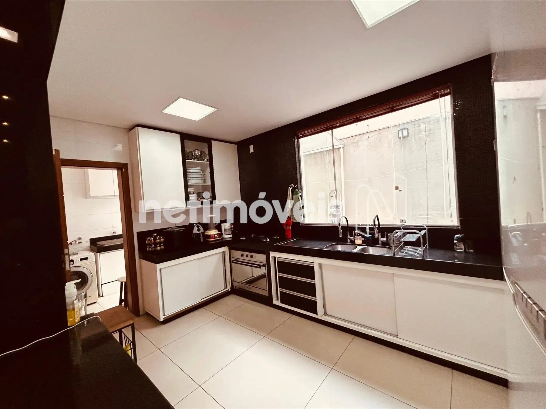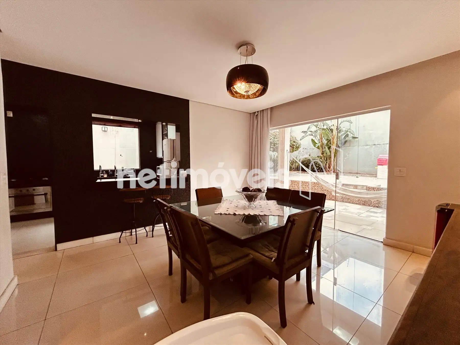 * Cozinha ampla com bancadas em granito, cooktop e forno a gás, conectada à sala de jantar.