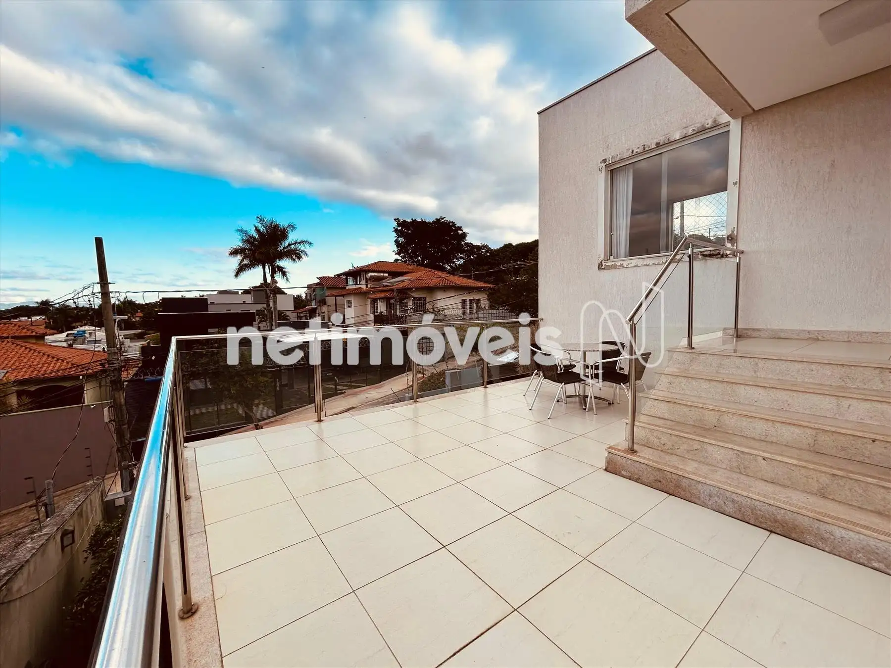 * Escada de acesso ao segundo pavimento em granito com guarda corpo em inox.