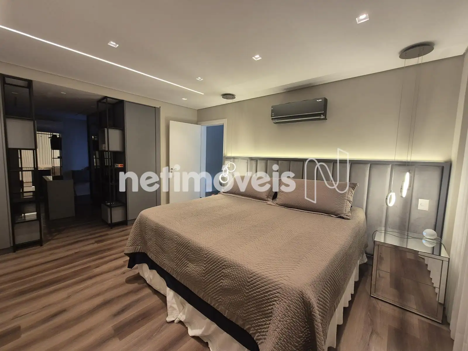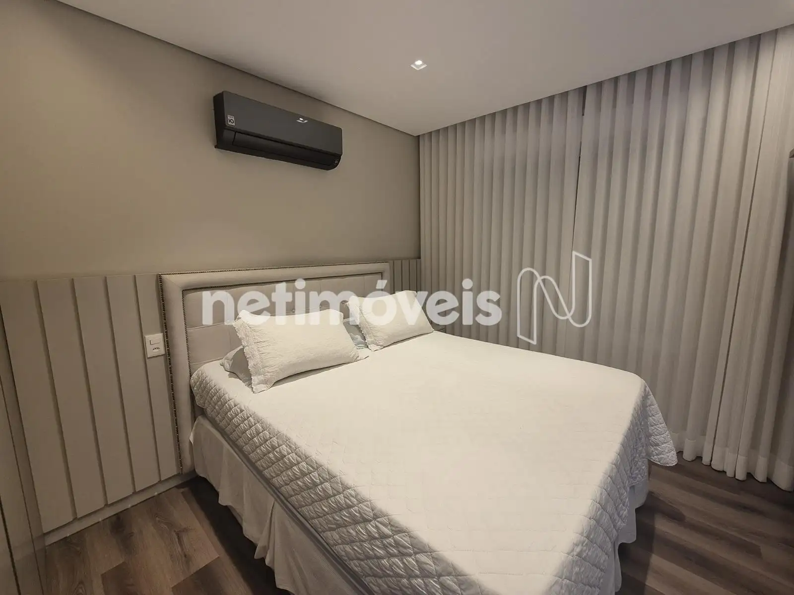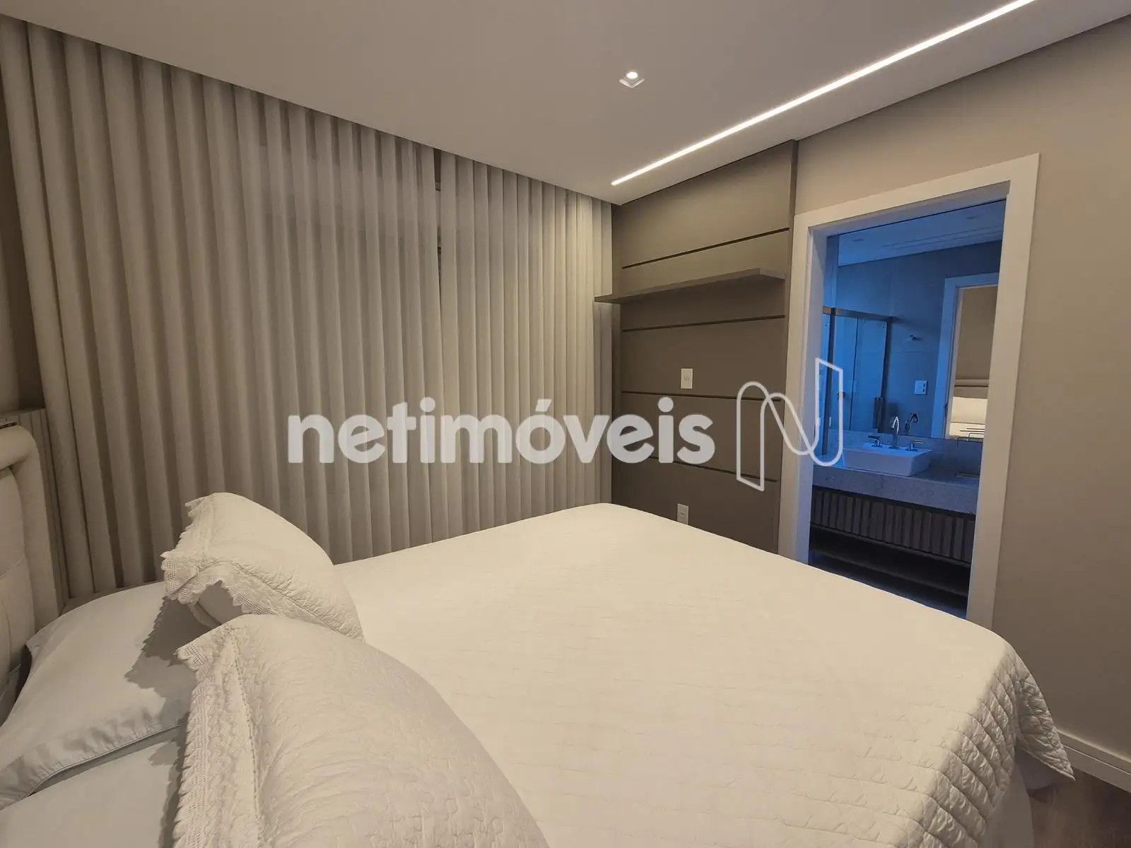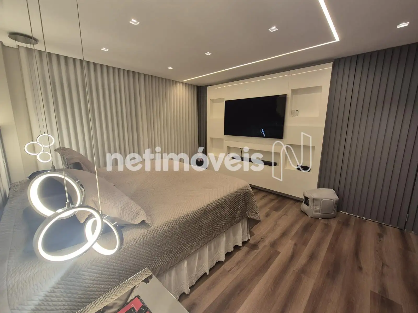- 04 Quartos com suíte, sendo 01 suíte máster com closet e varanda, piso em Paviflex, venezianas automatizadas, cortinas automatizadas, ar-condicionado, iluminação especial, cortinas, armários,