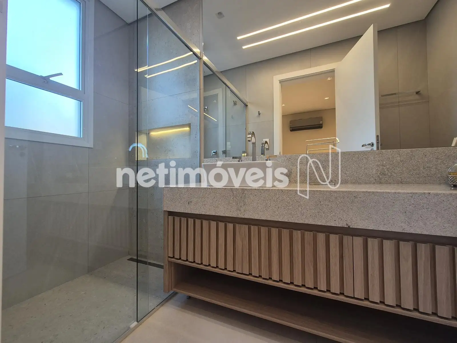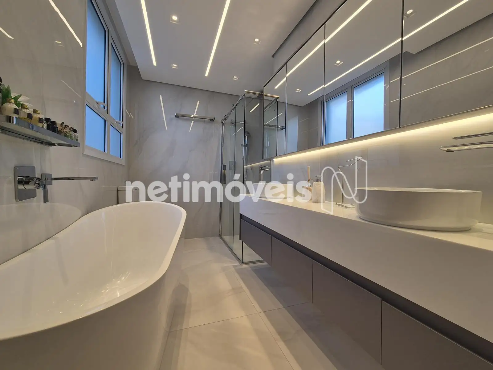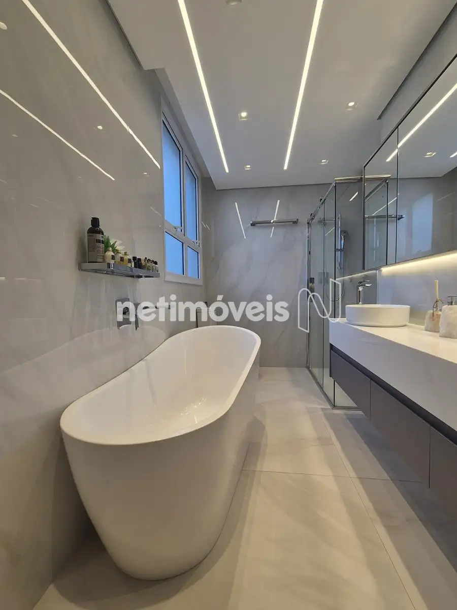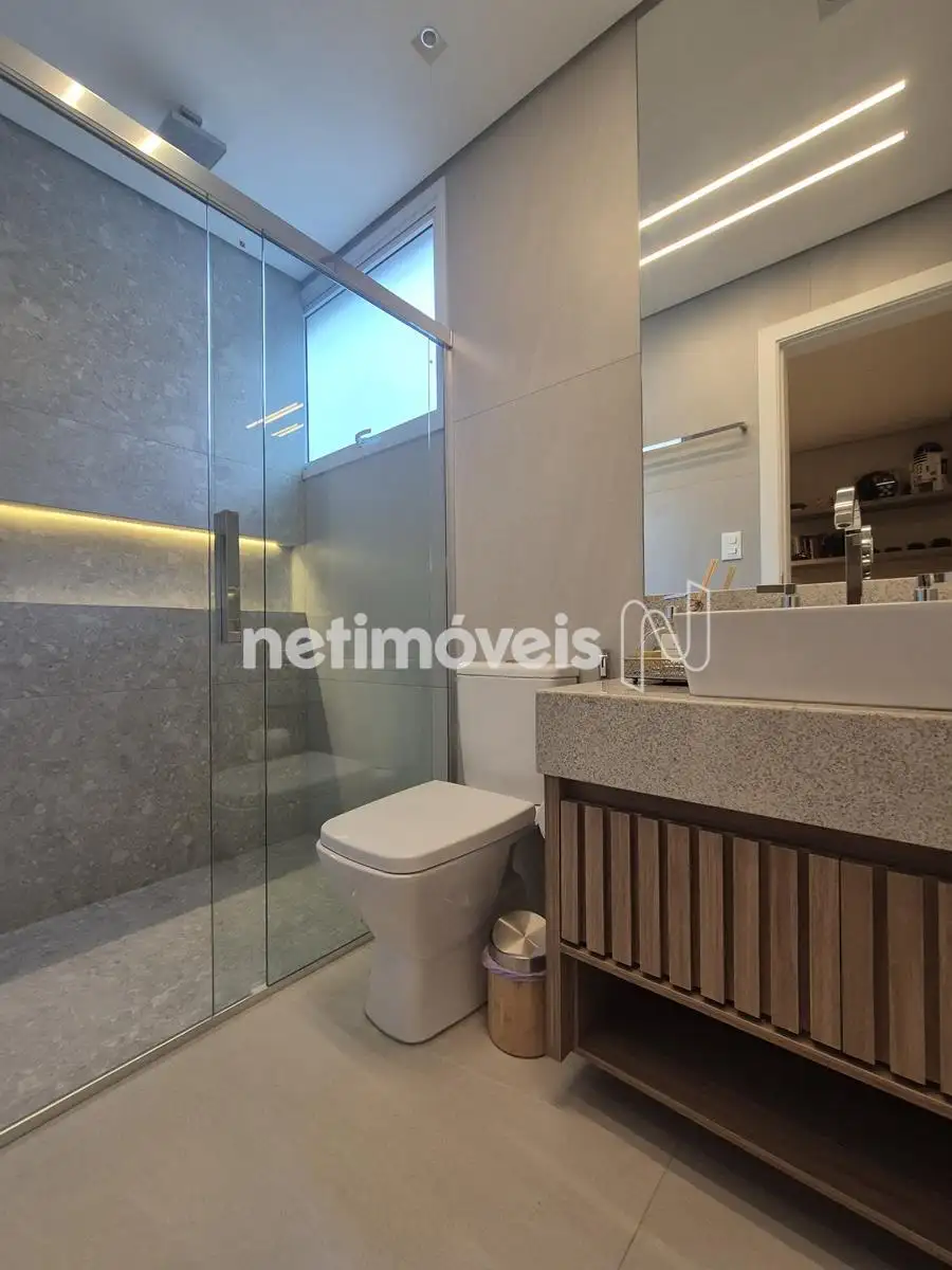 - Banhos com piso e revestimento de porcelanato de luxo, bancadas em nanoglass, box, iluminação especial, pias em cuba
