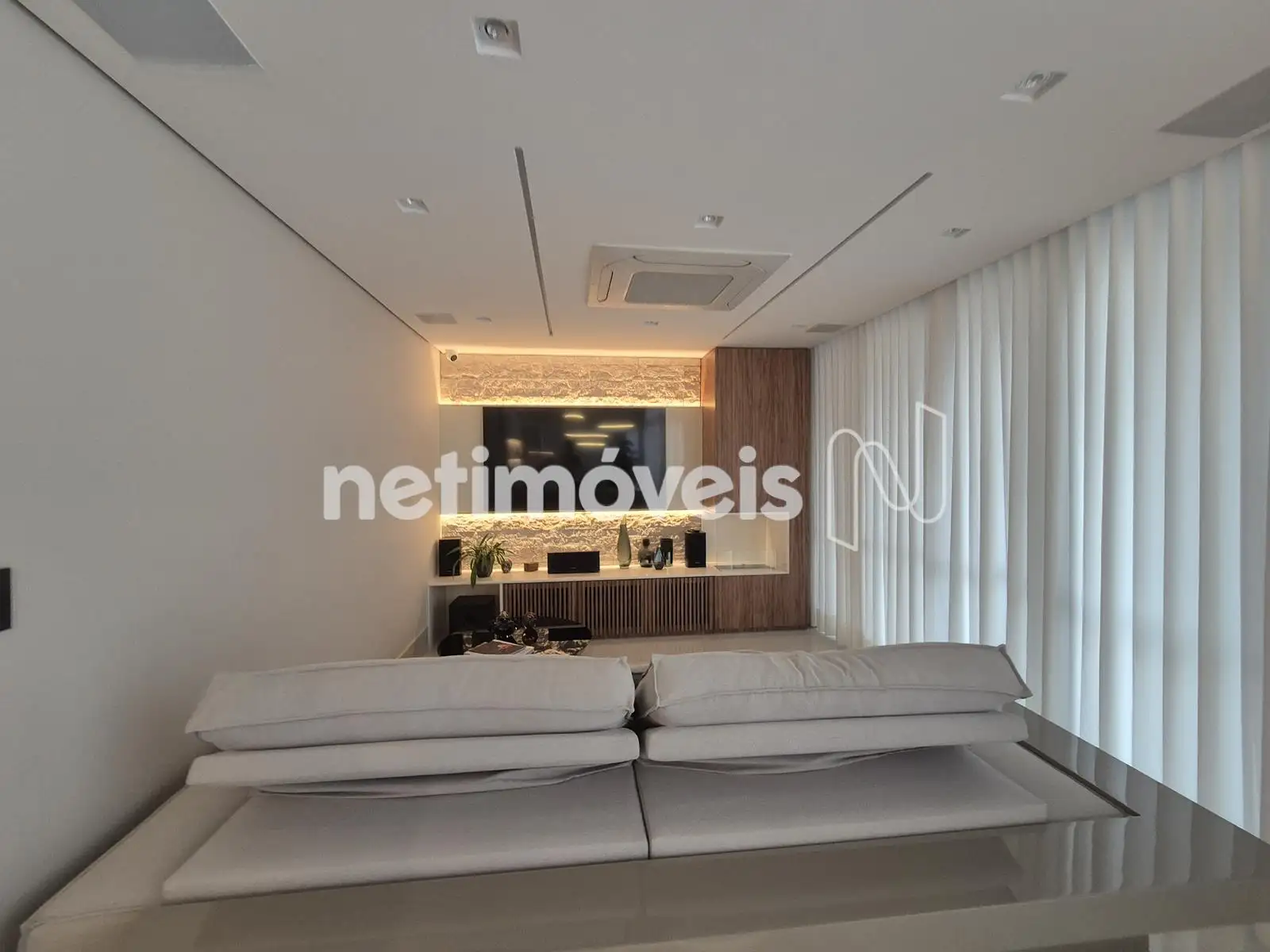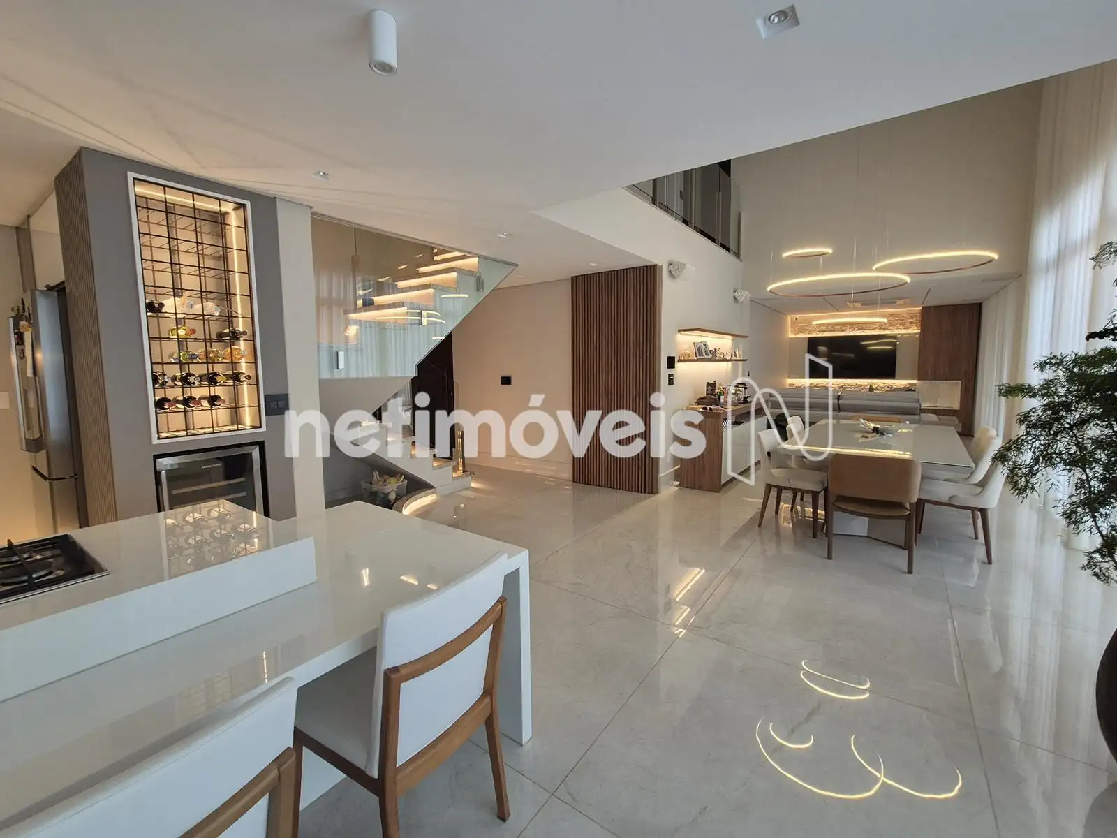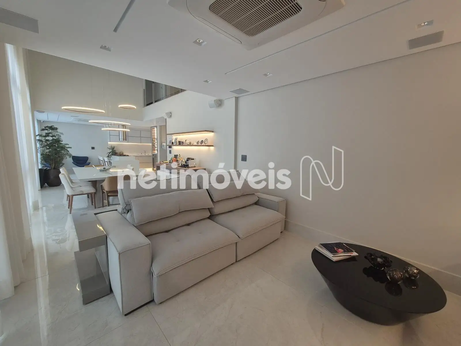 - Sala ampla para 03 ambientes com pé-direito duplo, piso em porcelanato, lustres, sistema home Theather, ar-condicionado, adega, lareira, cortinas automatizadas