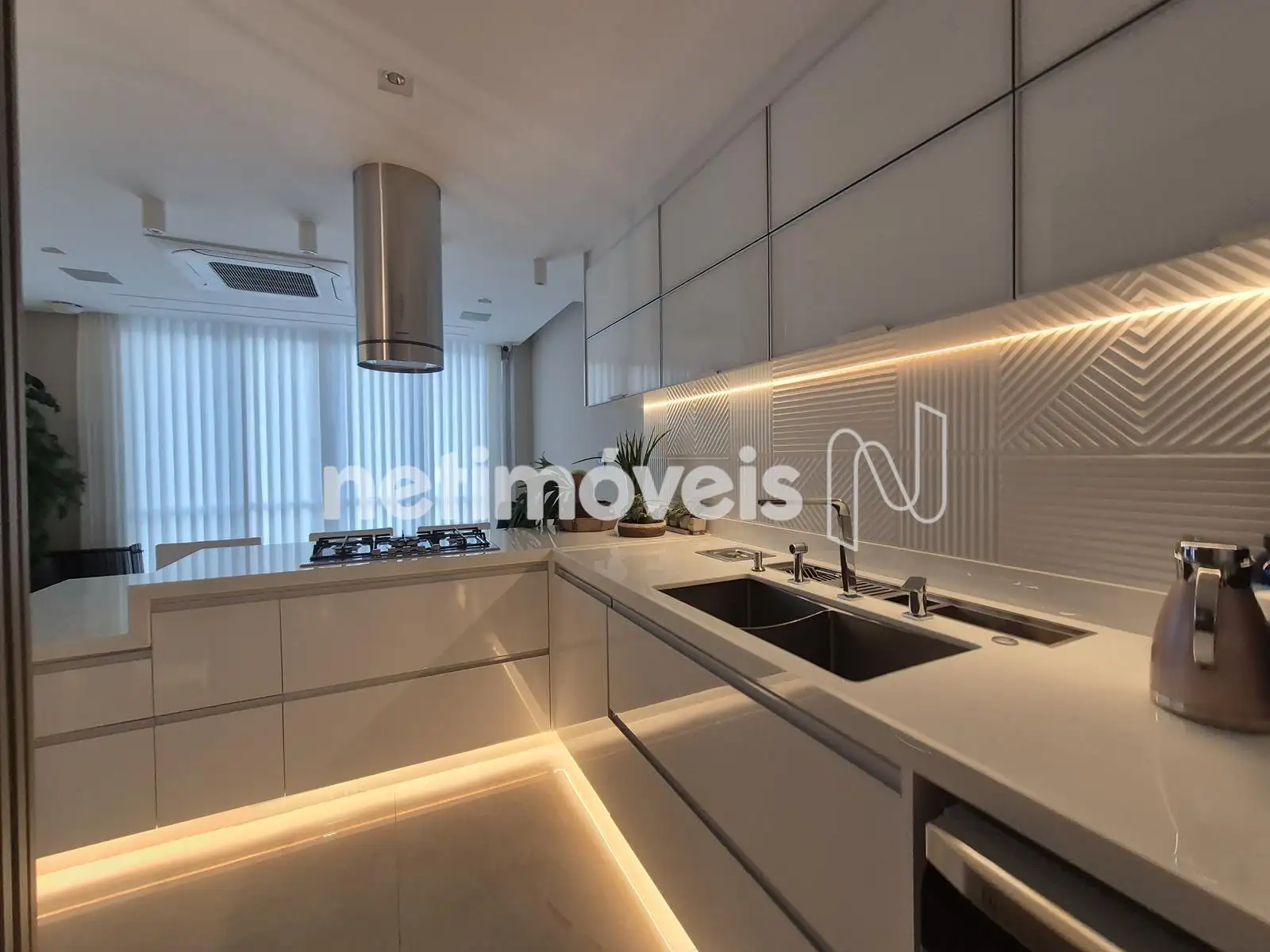 - Cozinha americana com bancadas em nanoglass, coifa, armários sob e sobre pia, bojo em inox, fogão cooktop, forno