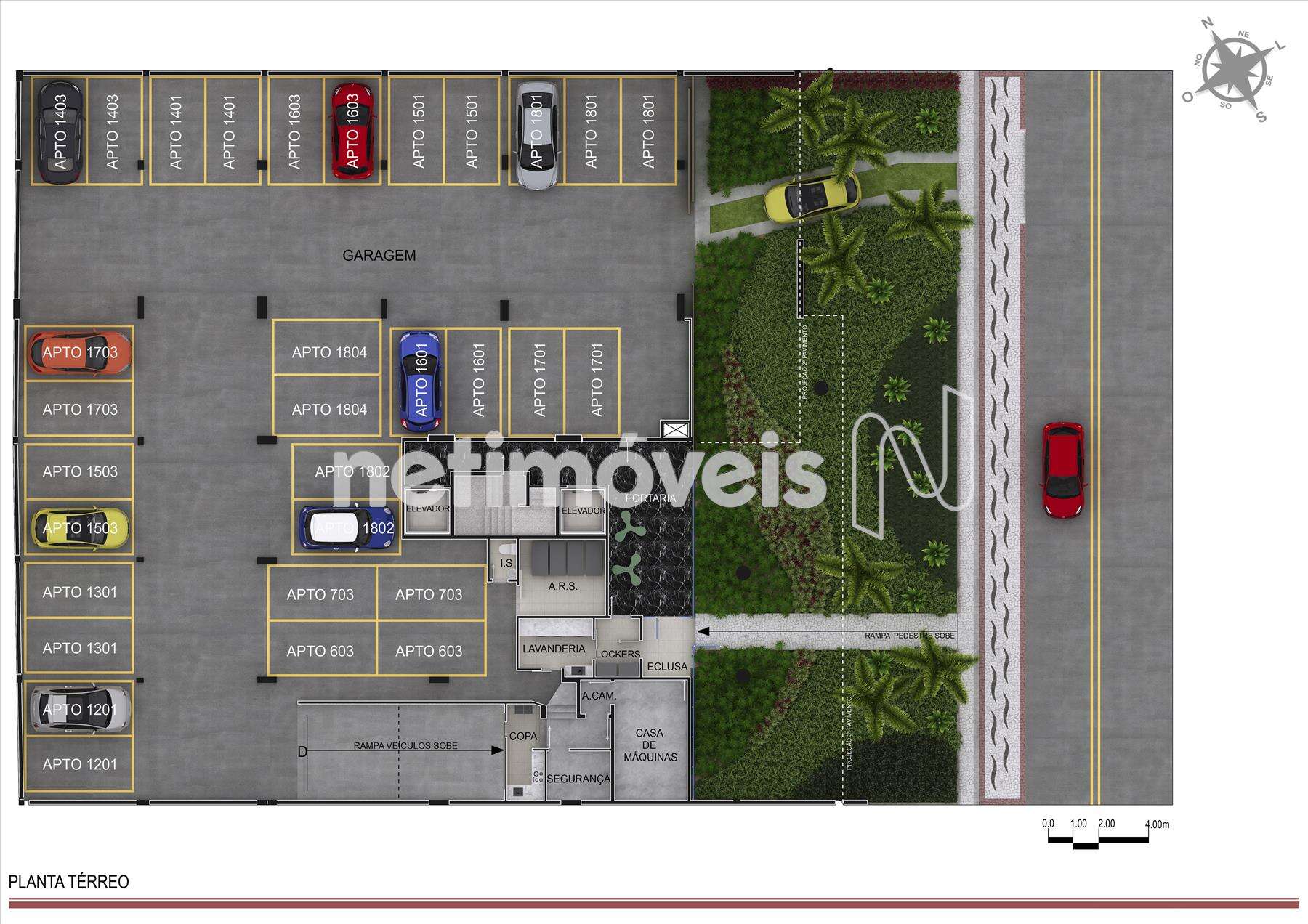 Fachada: Arte na fachada. Tela perfurada em alumínio na frente do prédio. (Transparência na parede do apartamento de 3 quartos) Arte faz o acabamento dos andares de garagem.