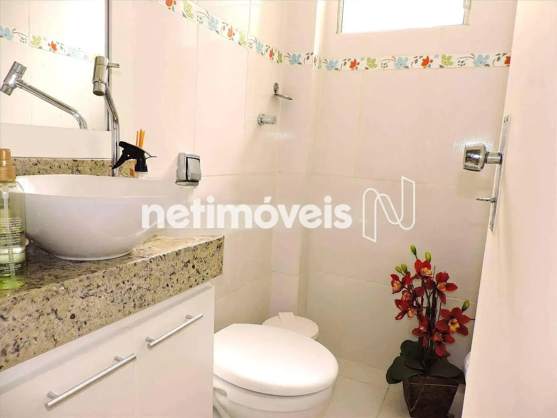 Banho social com cuba sobreposta e armário sob a pia.