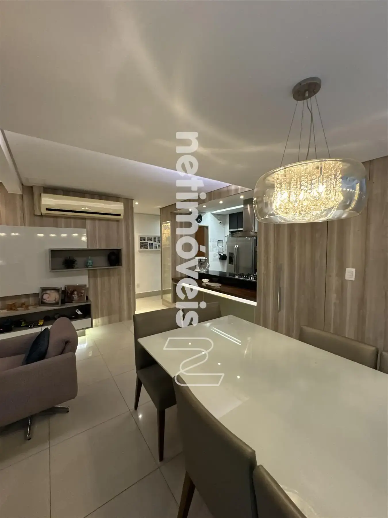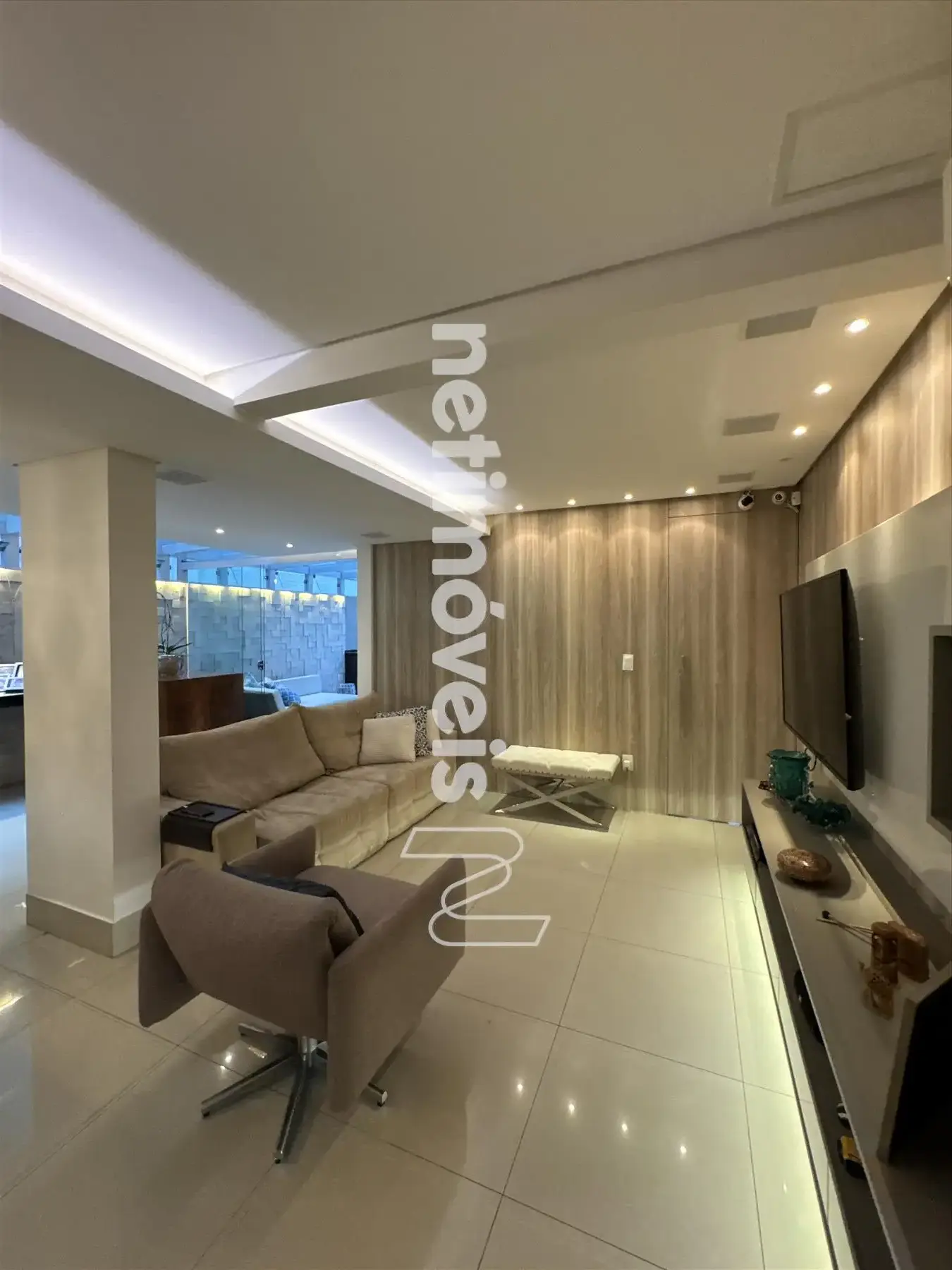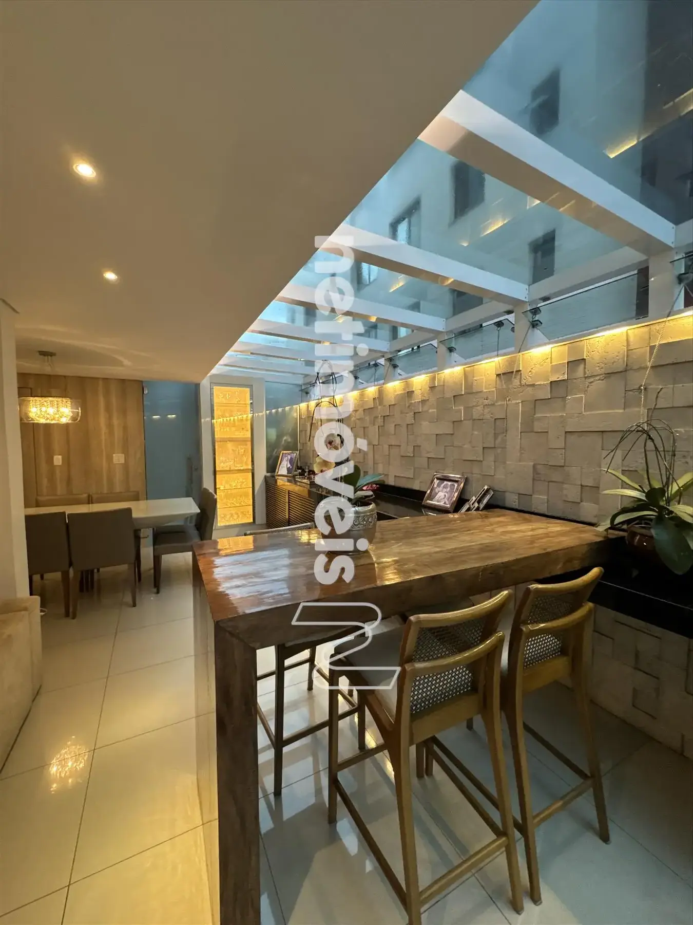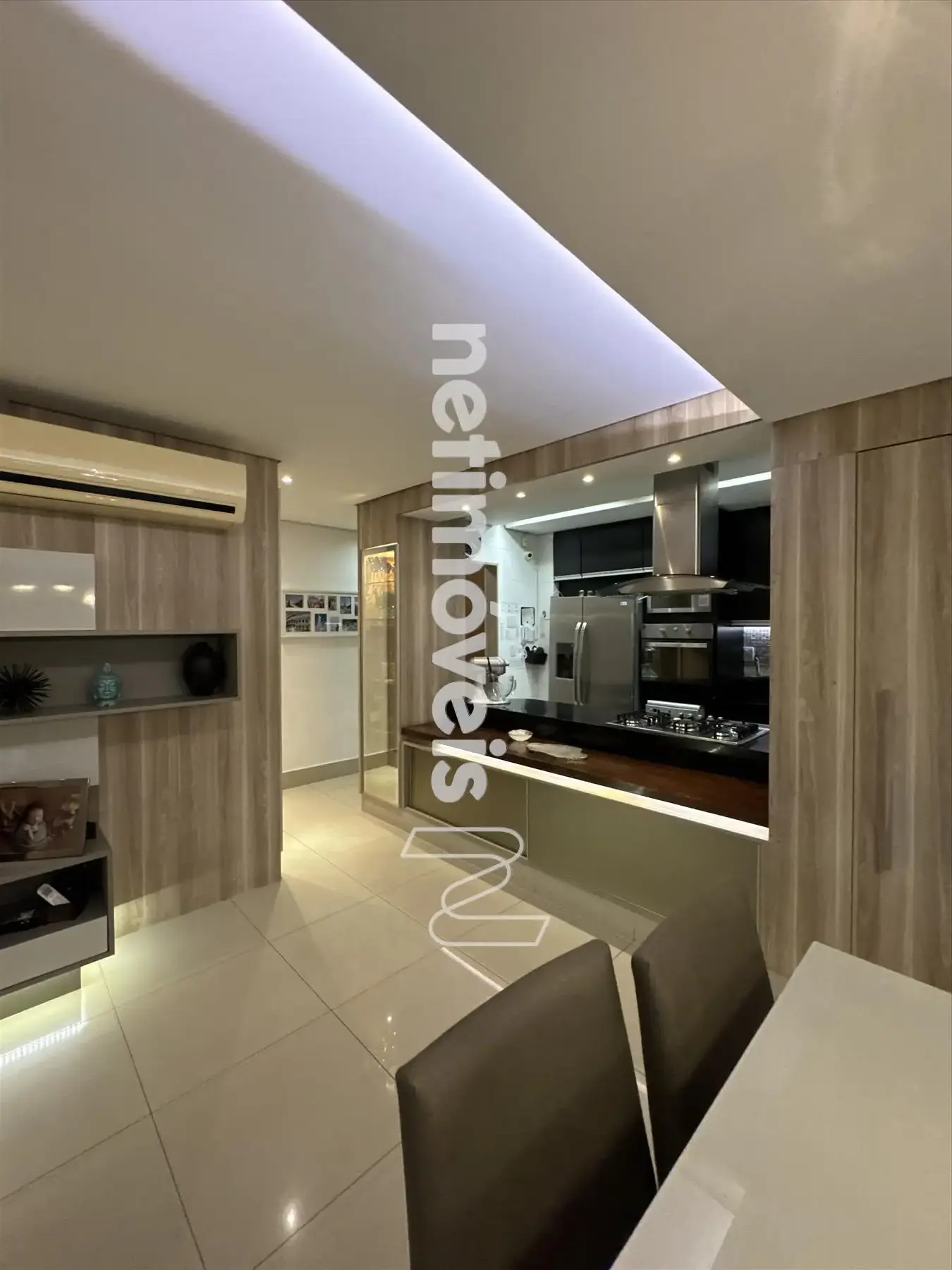 * Ampla sala, conceito aberto para 03 ambientes teto rebaixado com iluminação indireta sendo: sala de jantar, sala TV e sala com fechamento parcial do espaço gourmet.