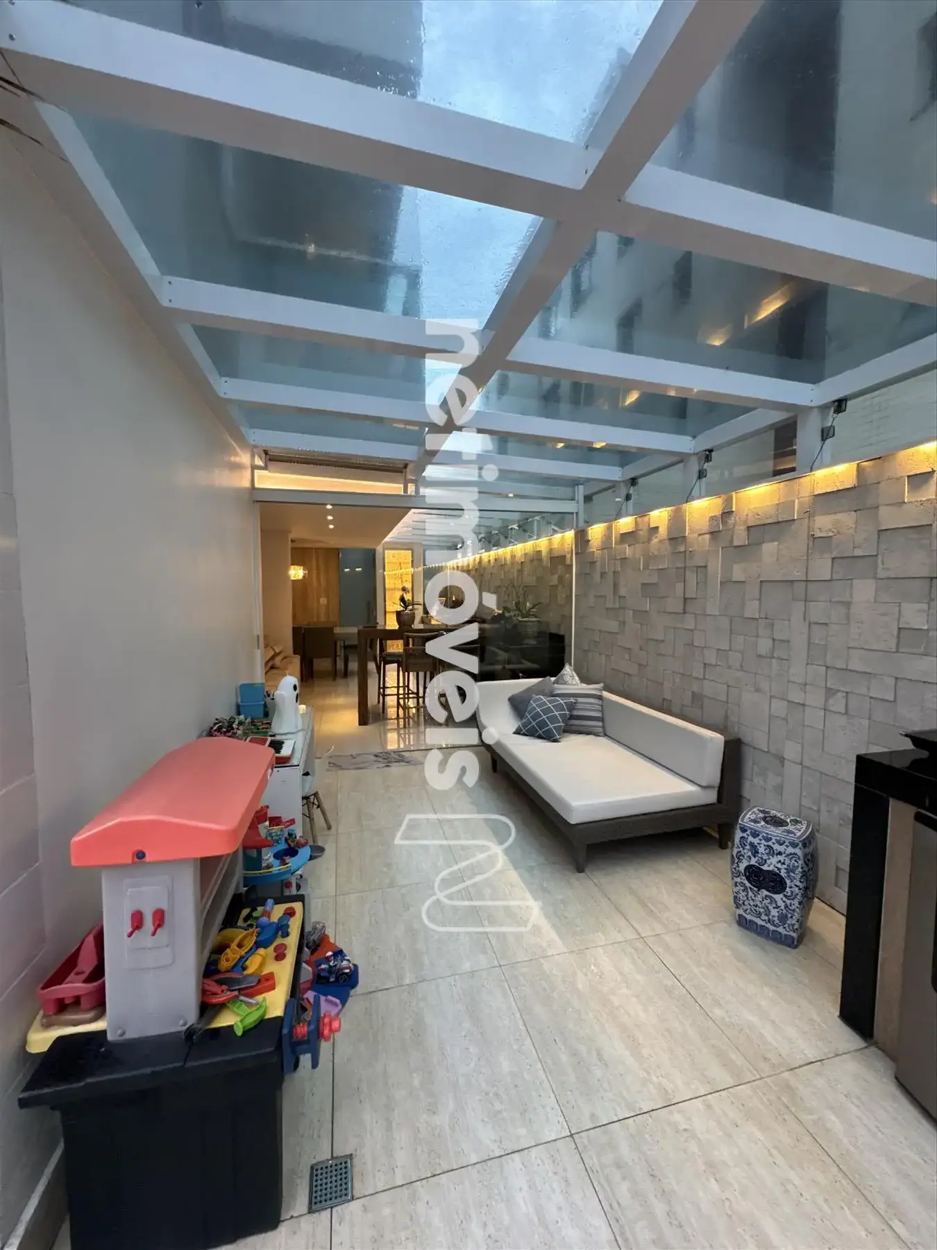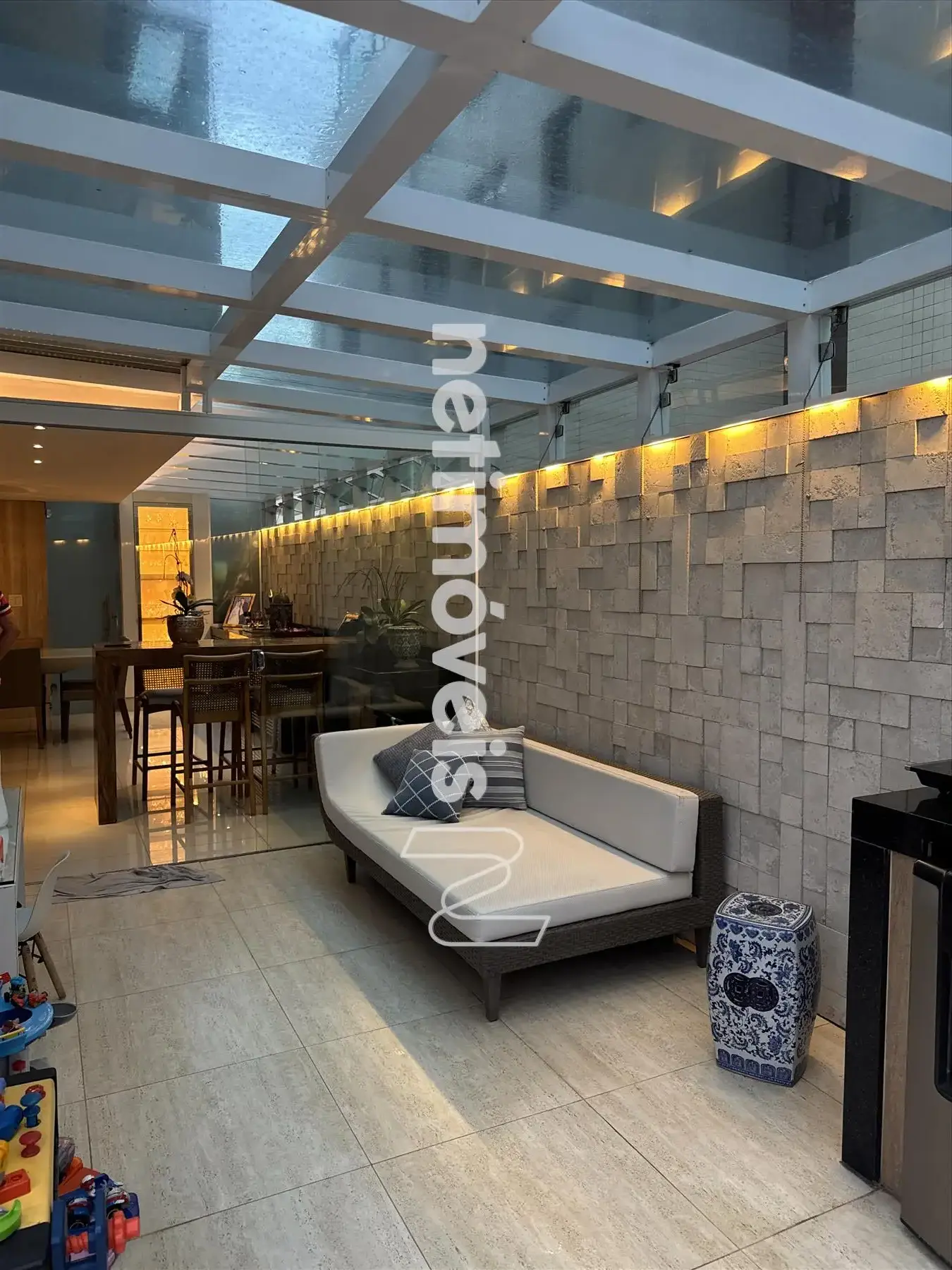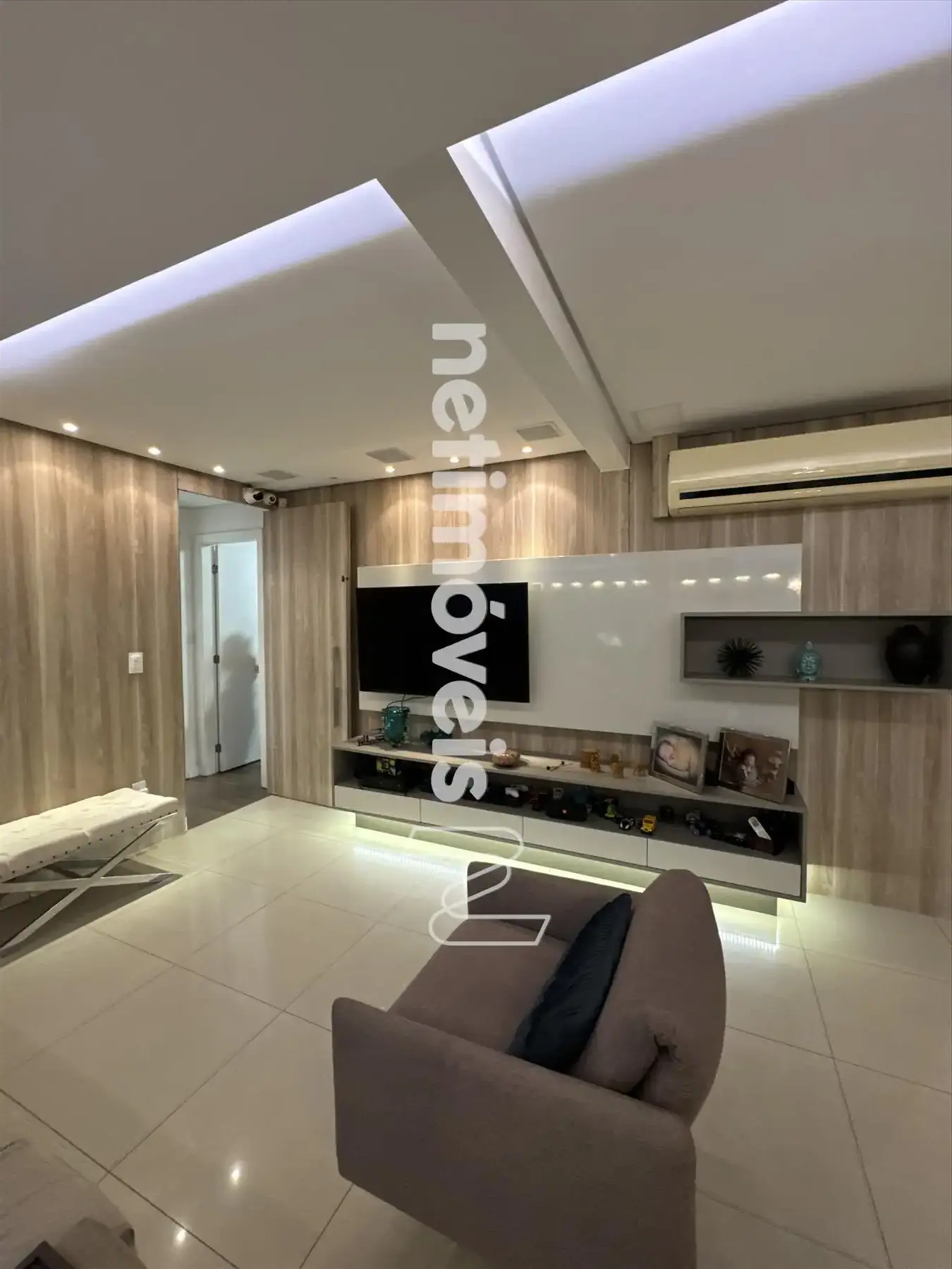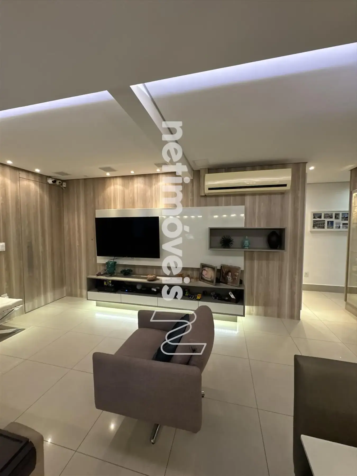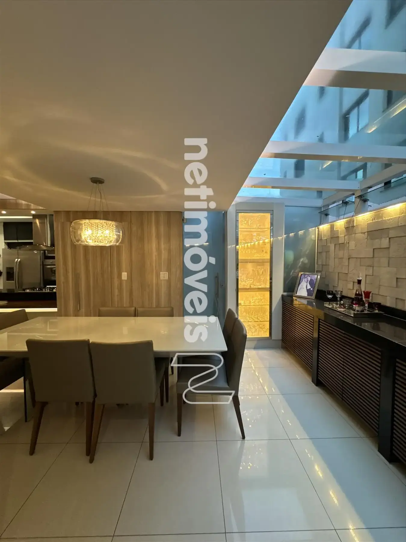 * Ampla sala, conceito aberto para 03 ambientes teto rebaixado com iluminação indireta sendo: sala de jantar, sala TV e sala com fechamento parcial do espaço gourmet.