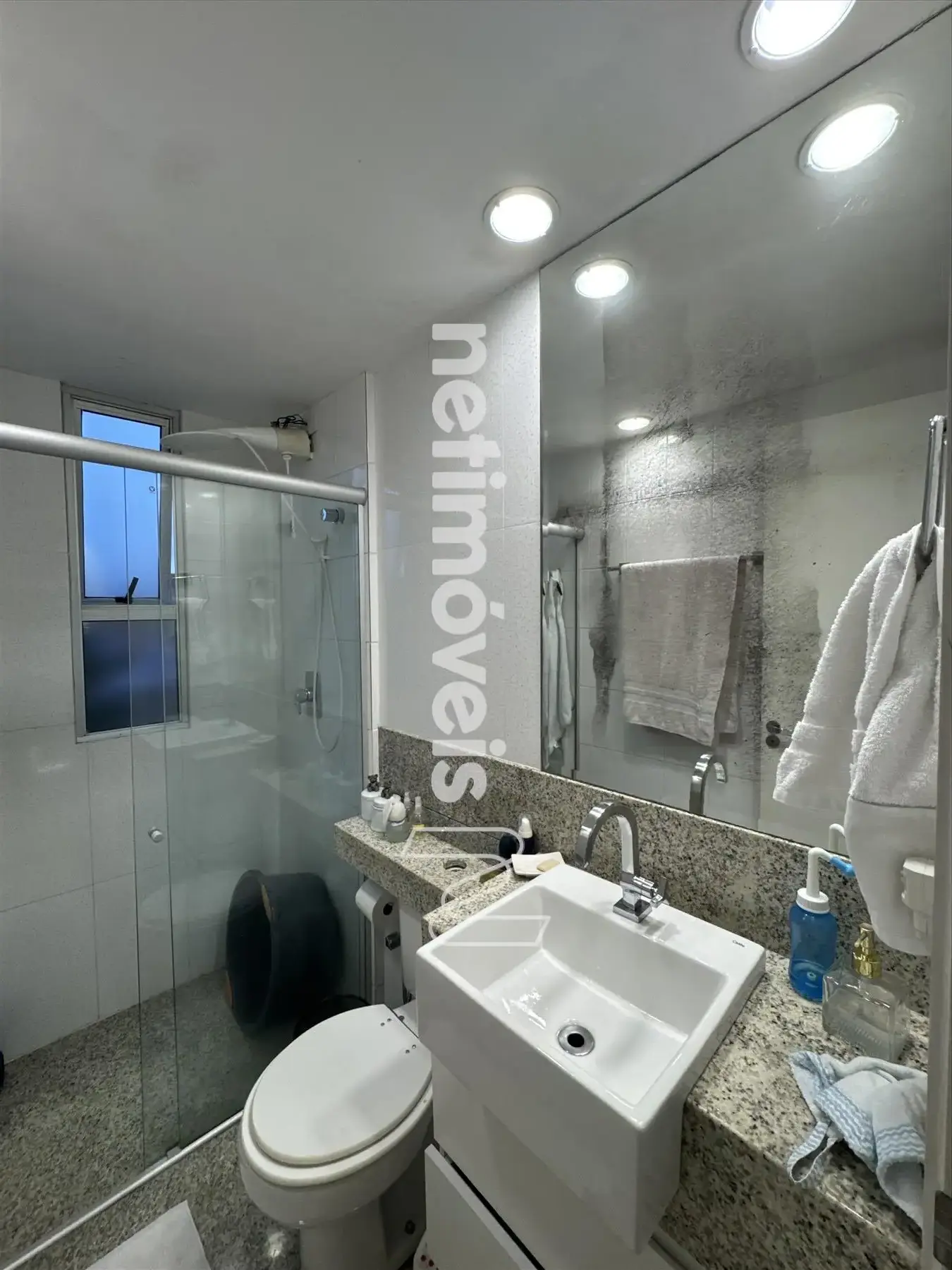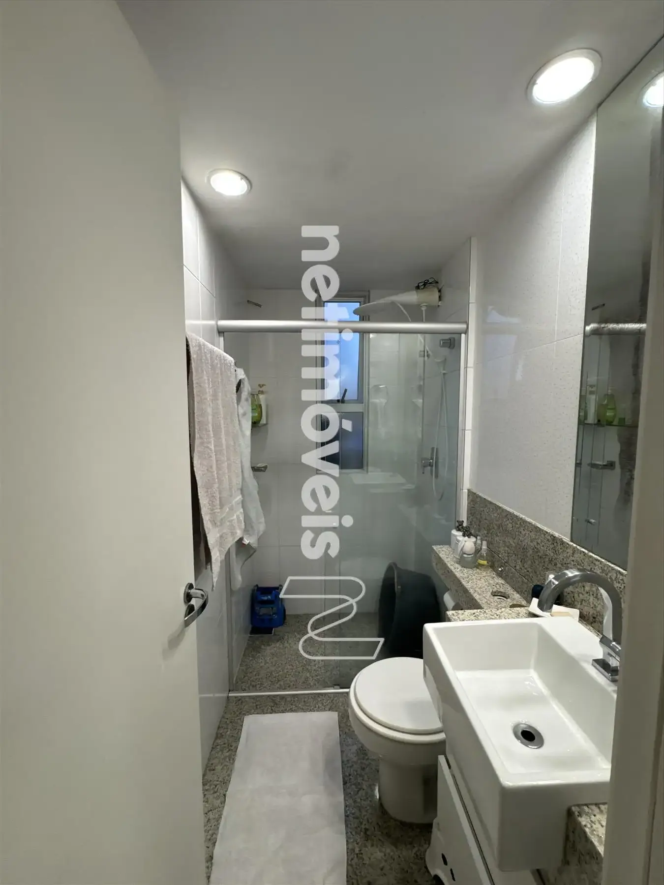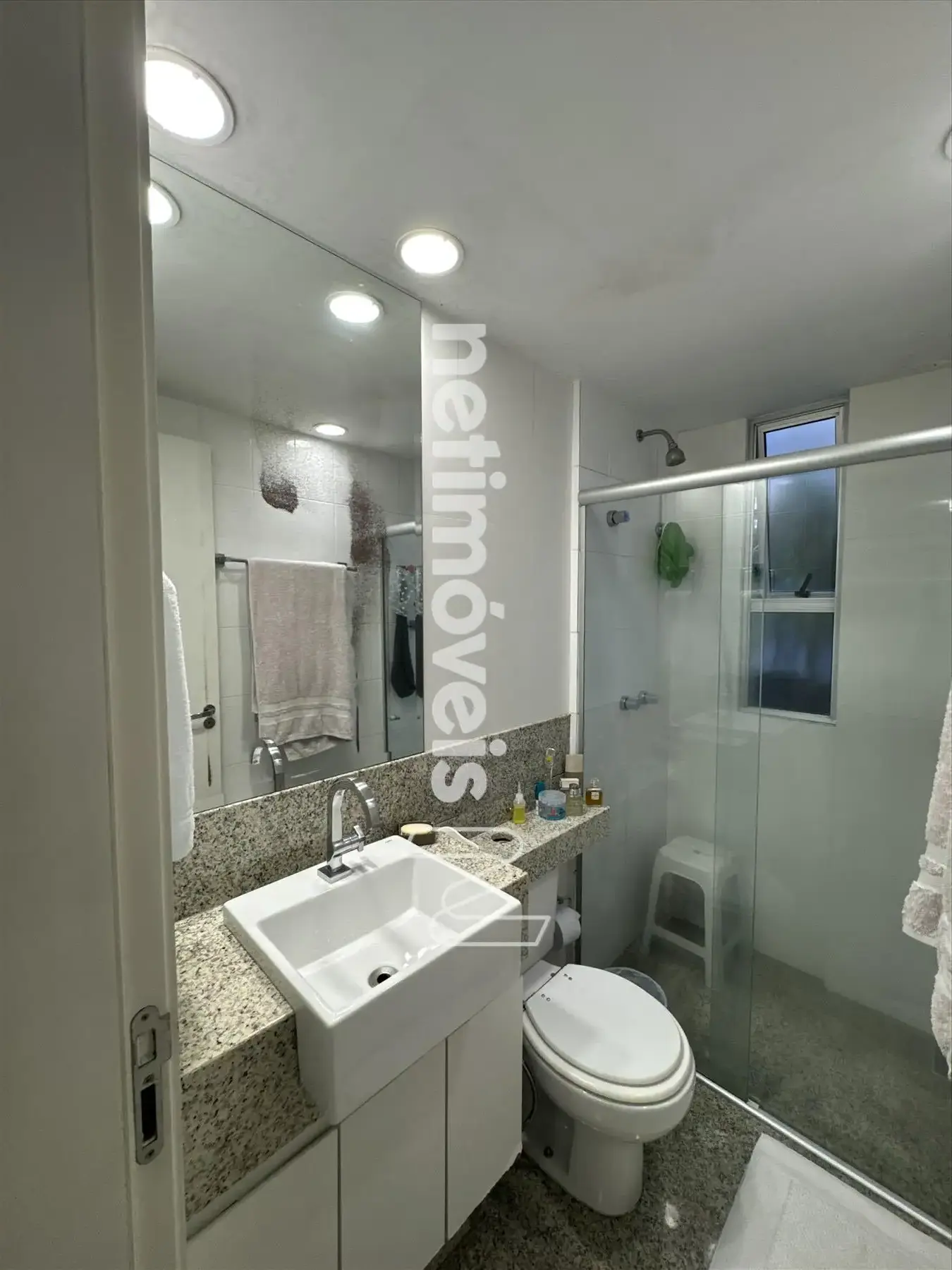 * Banho Social e Suíte com bancada e piso em granito, armários, box blindex;