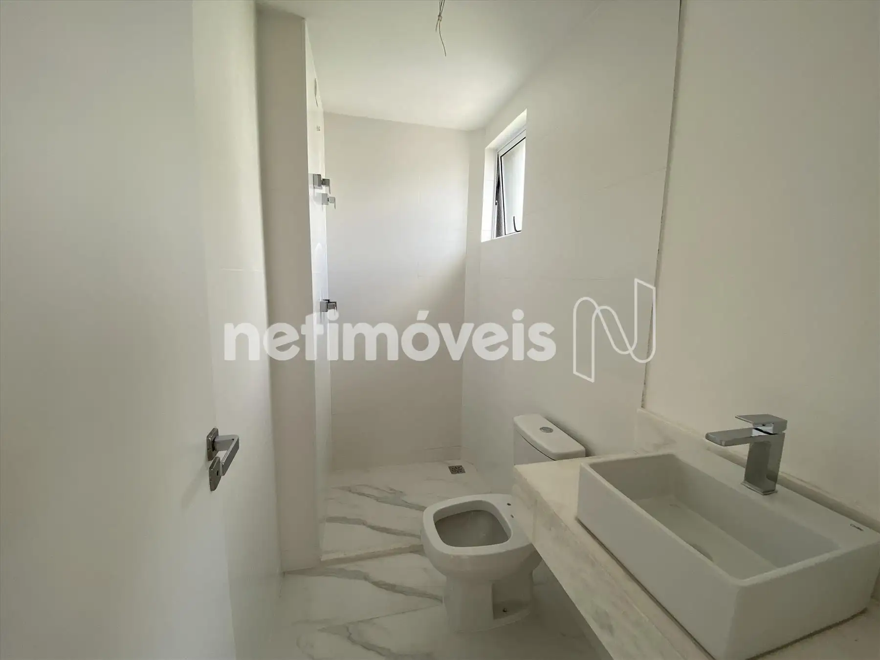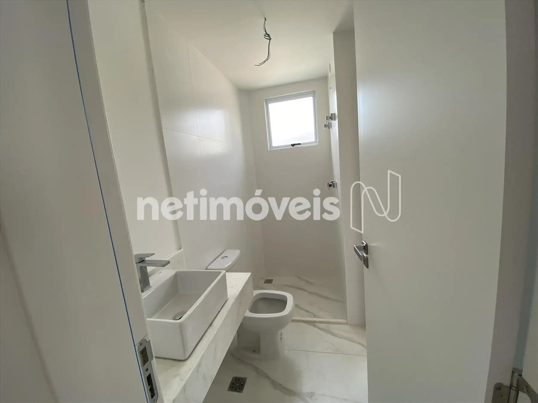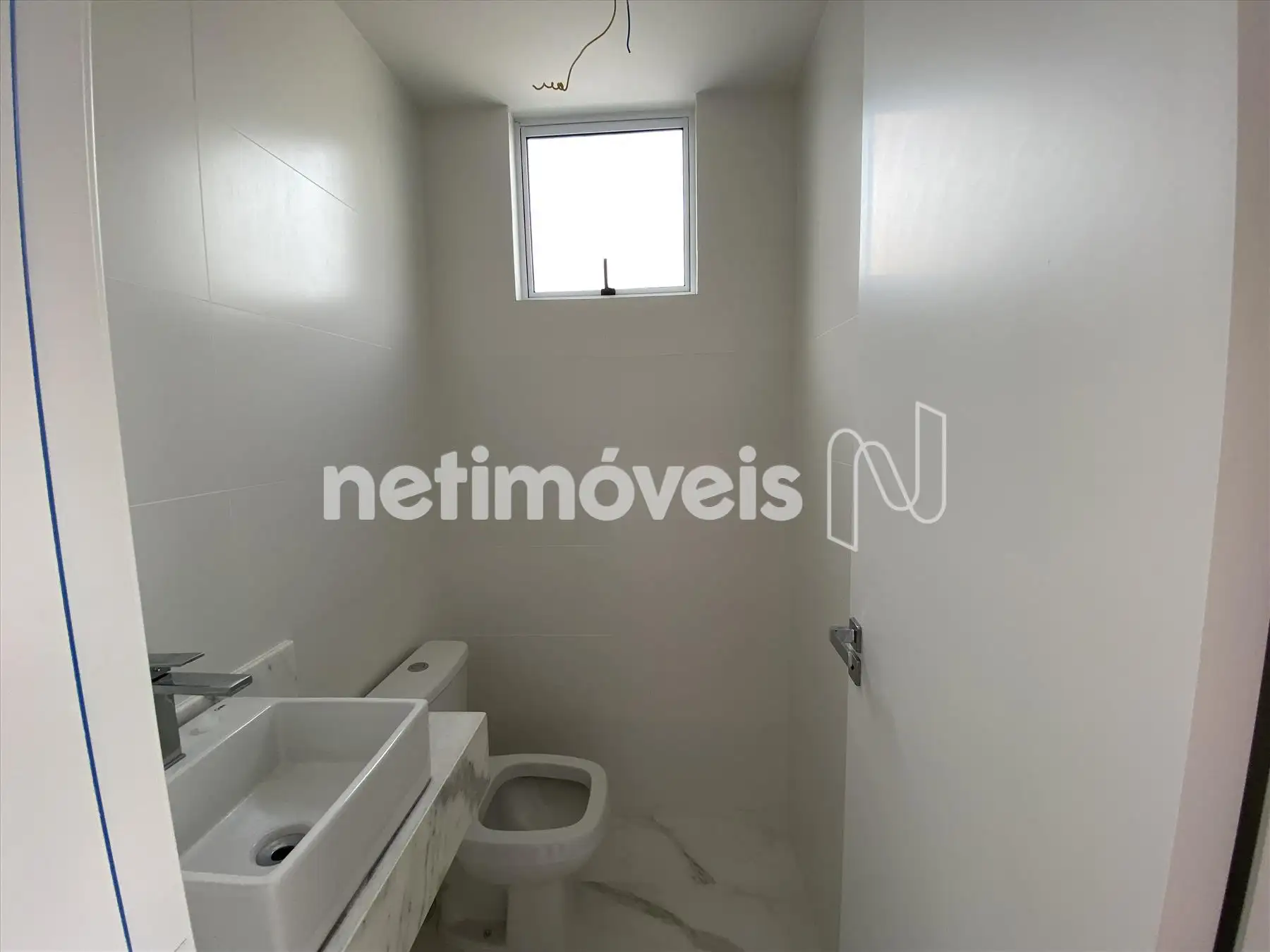 Banho social, com piso porcelanato e bancada em granito;