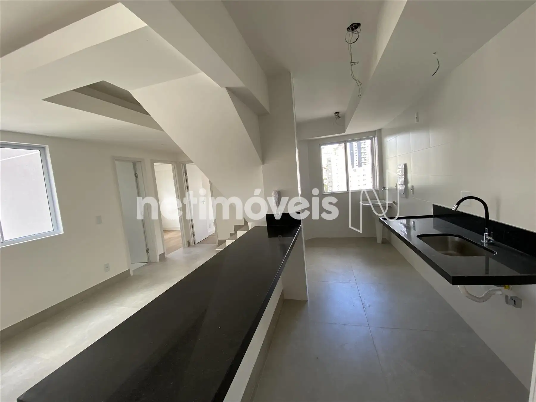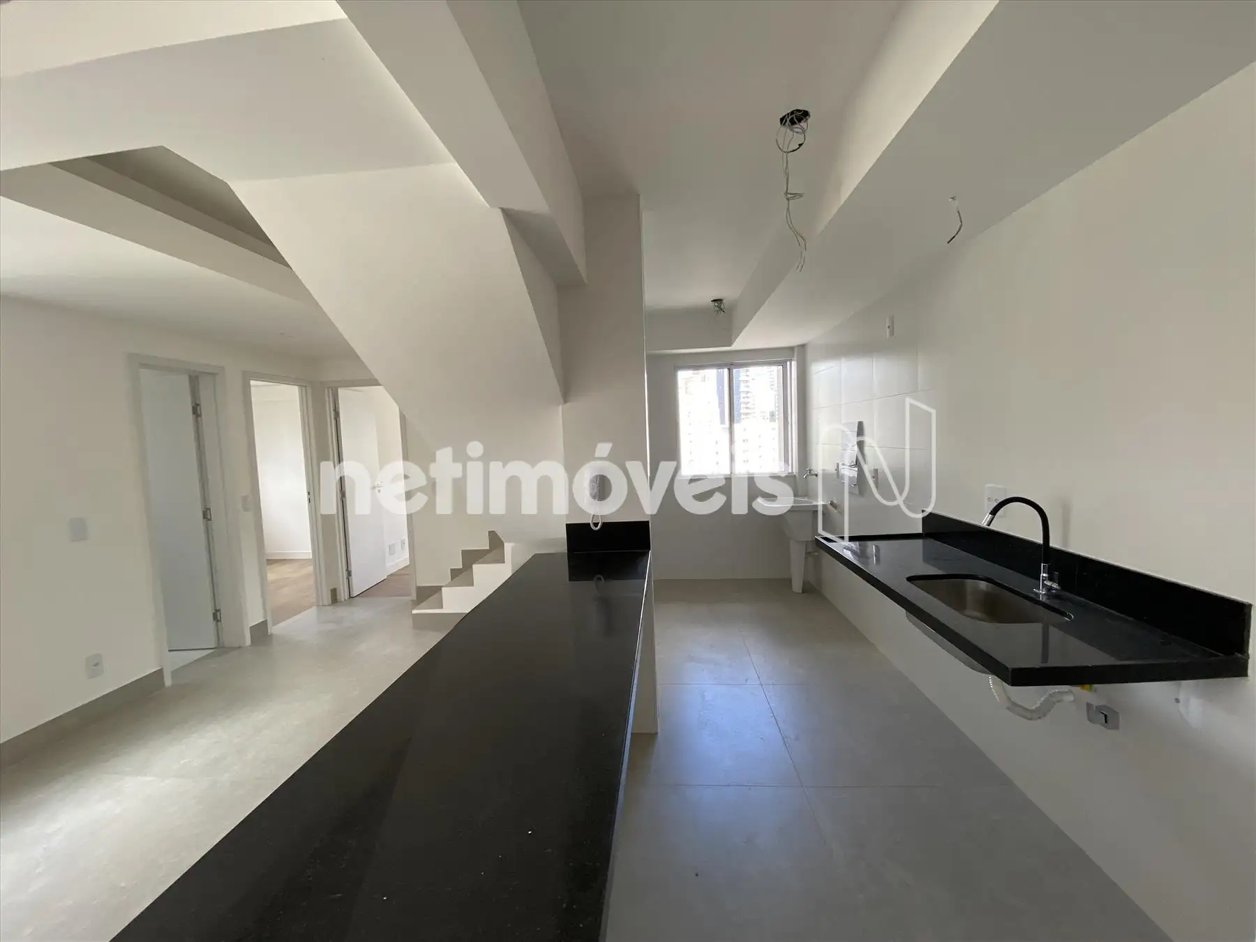 Cozinha, conceito aberto, bancada em granito, piso porcelanato e área de serviço conjugada;