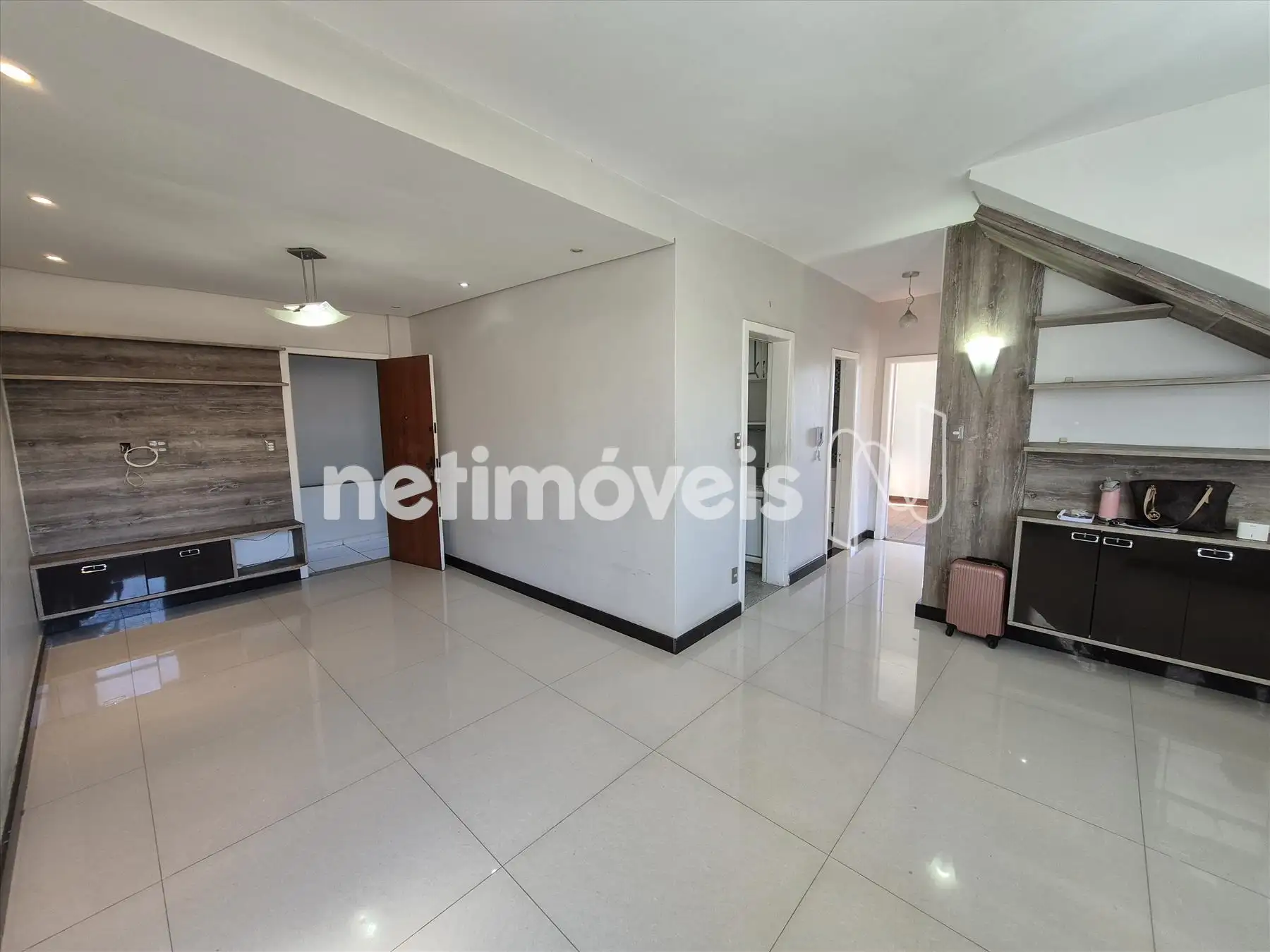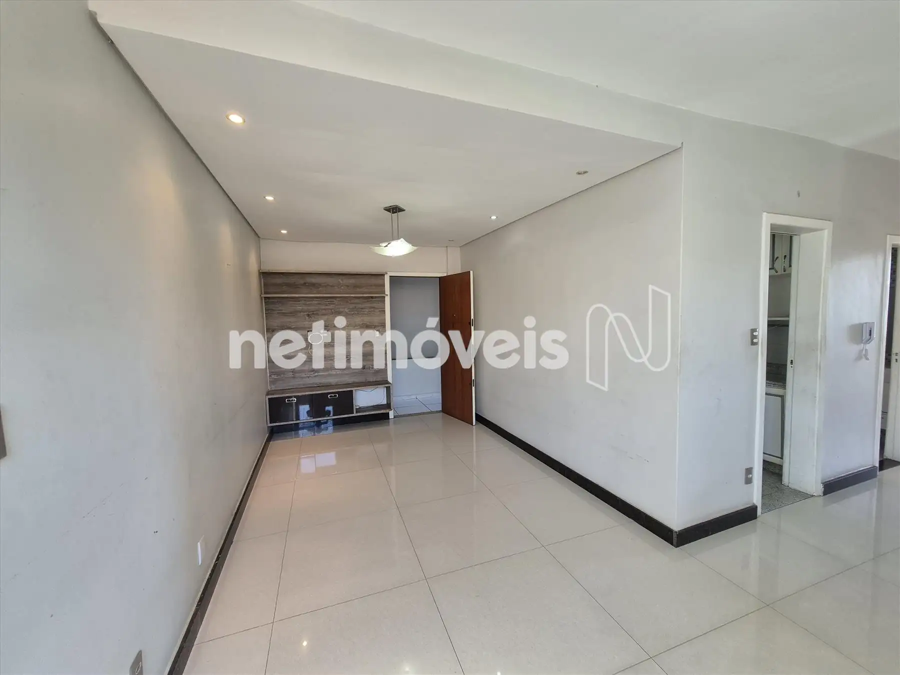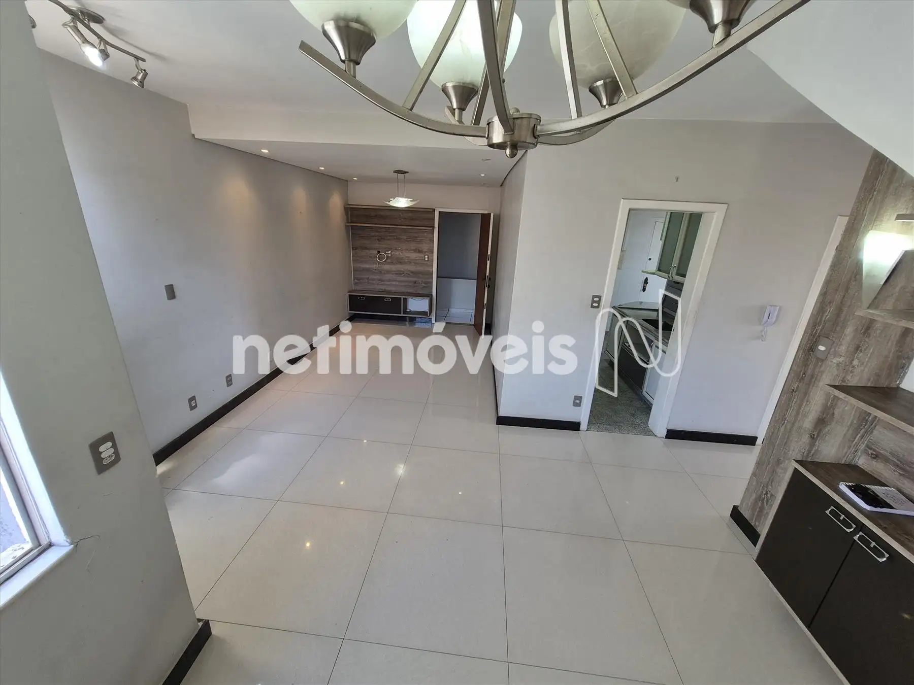 - uma charmosa sala espaçosa para três ambientes com piso em porcelanato ;