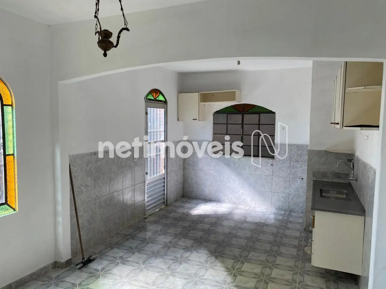cozinha com piso em cerâmica com armários sob e sobre a pia,