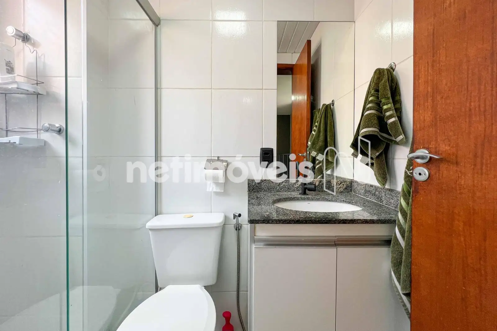 · Banho social completo, todo revestido, com box, armários e pia em granito
