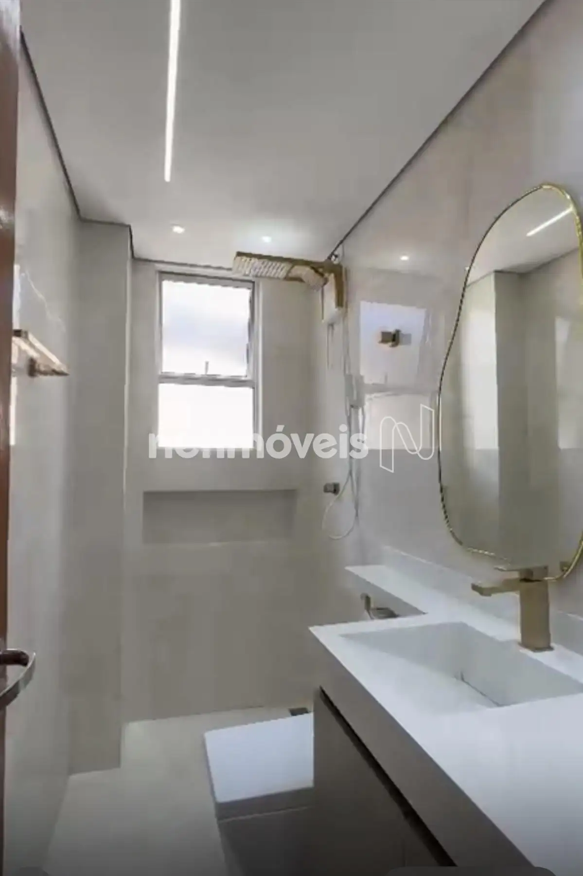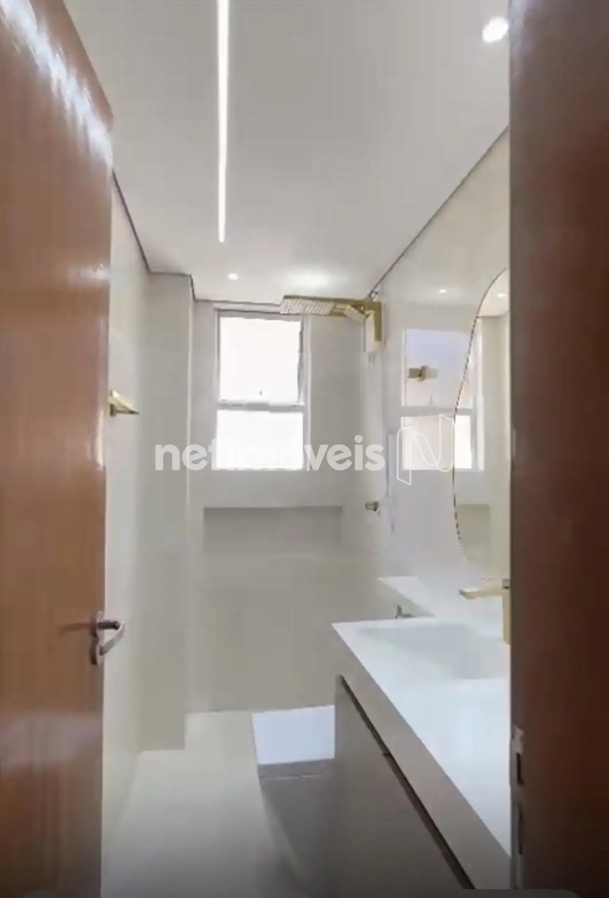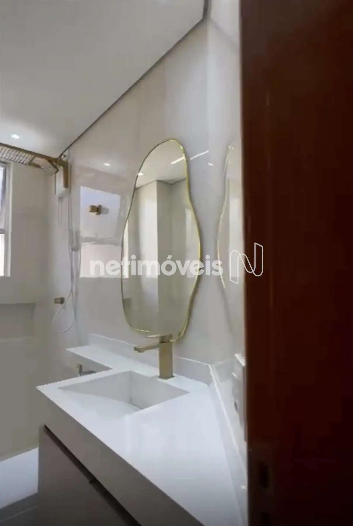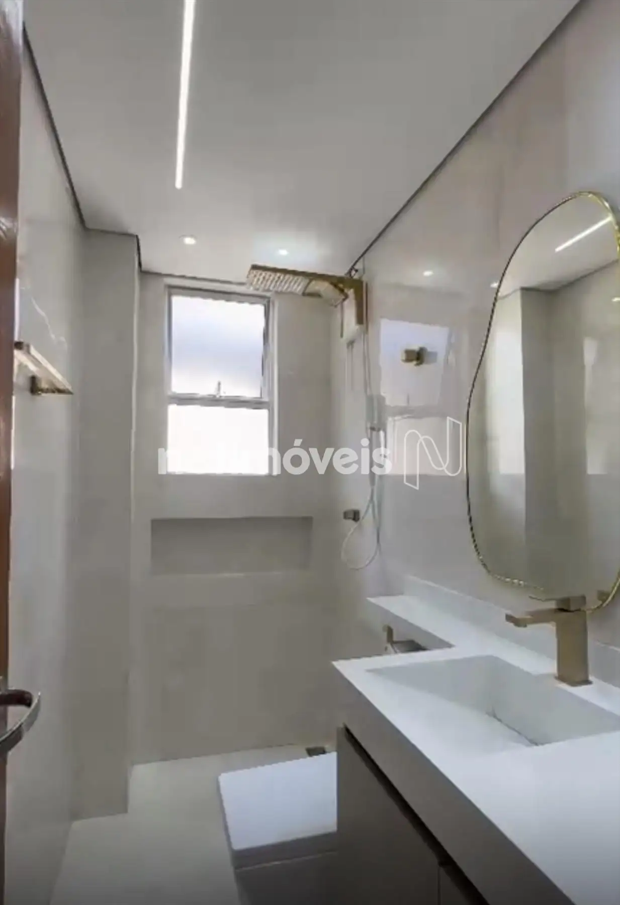 Banho social com piso porcelanato, box em vidro temperado e armários sob bancada;