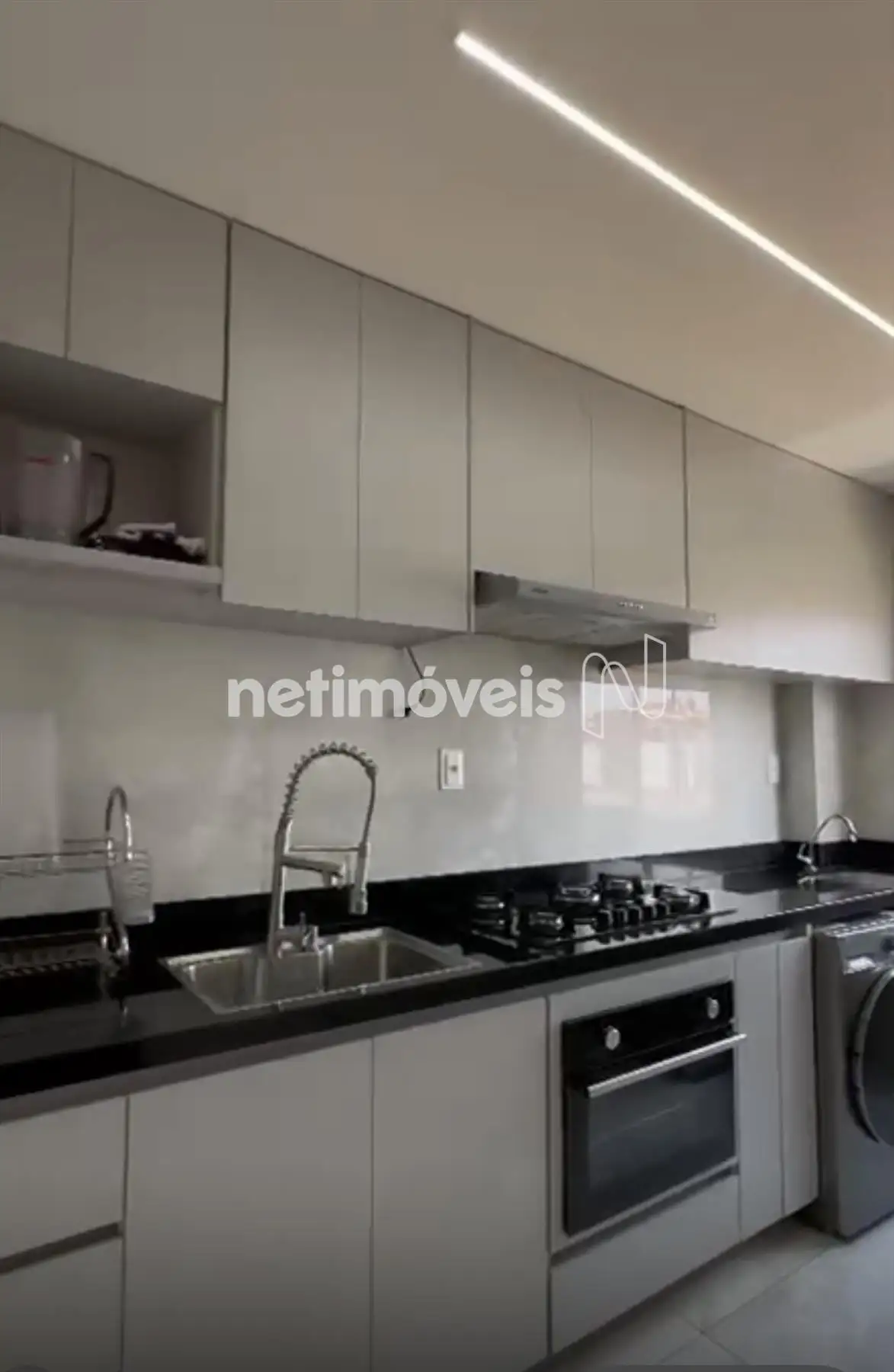 Cozinha clara arejada, rica em armários, todos de alto padrão;