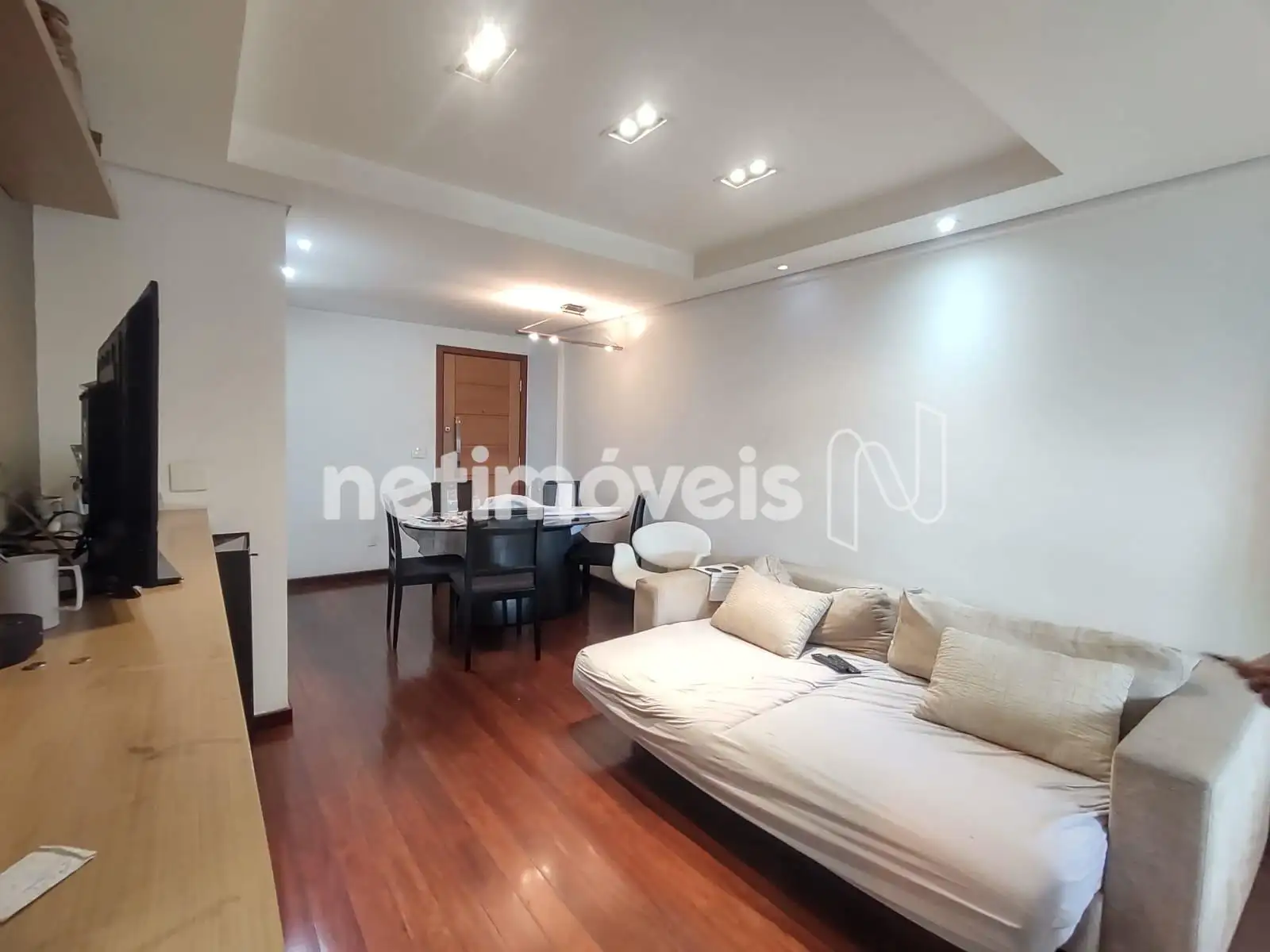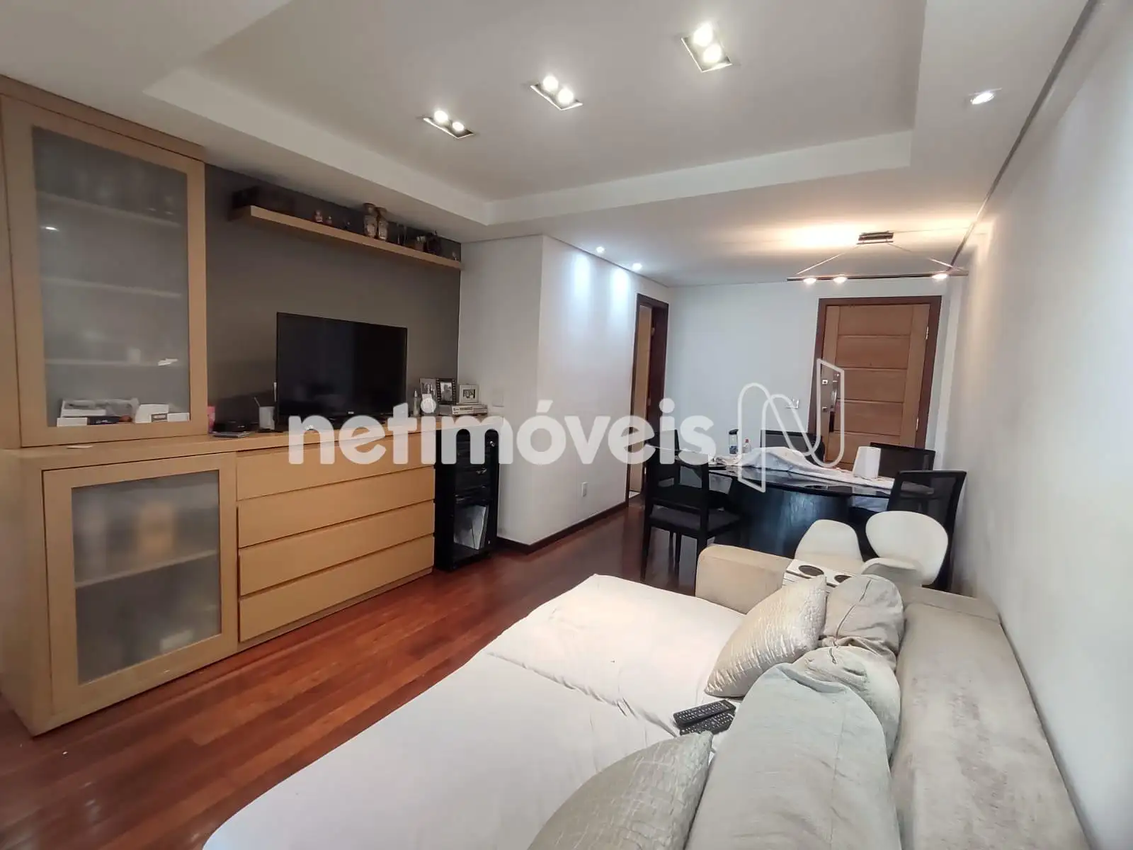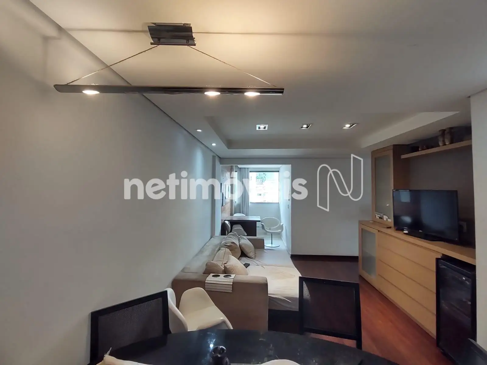 - 01 Sala revestida em piso tábua corrida teto rebaixado em gesso projeto luminotécnico, painel e varanda incorporada revestida em piso cerâmica;