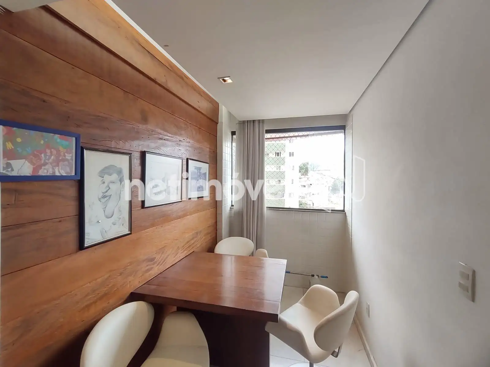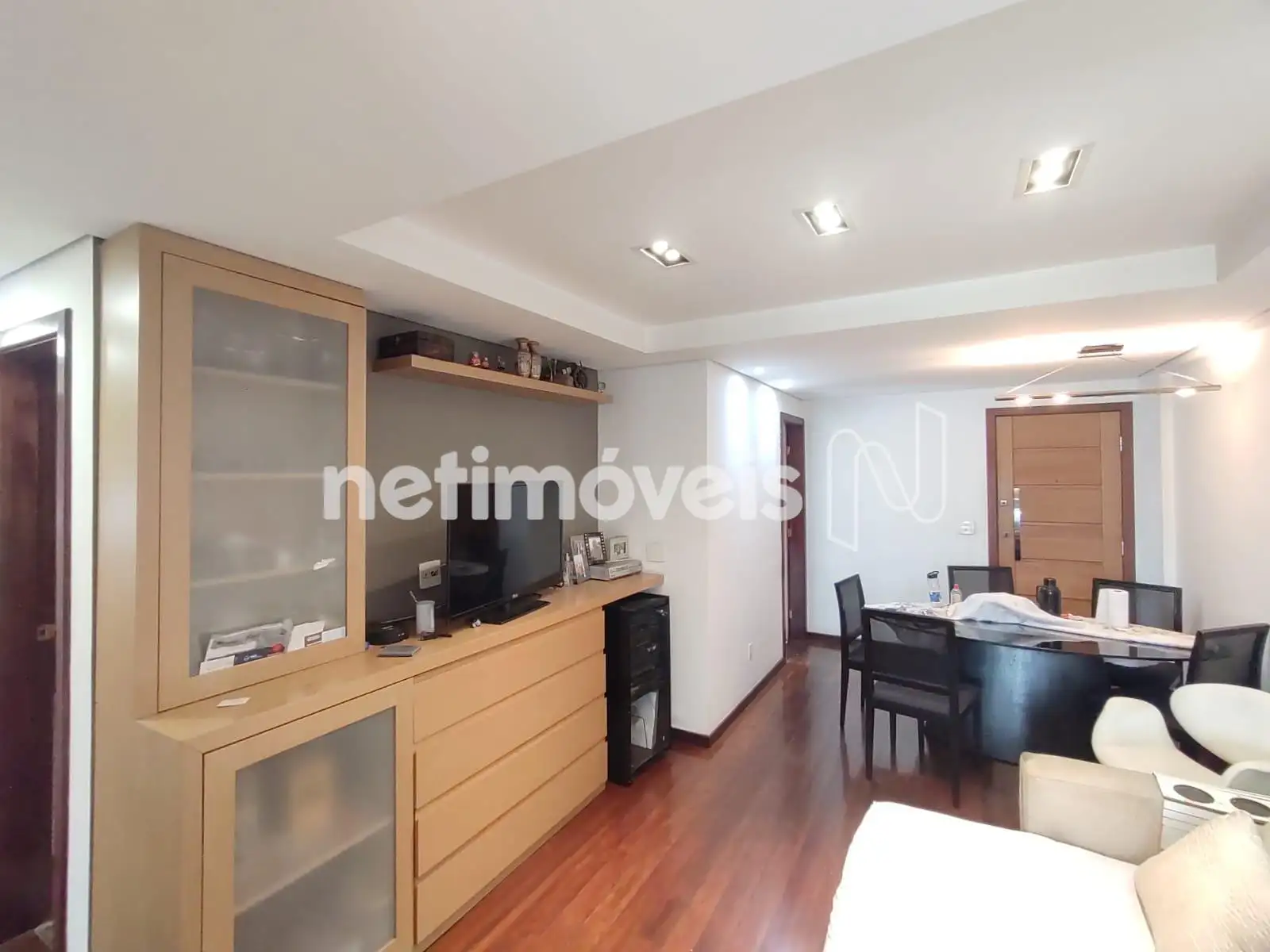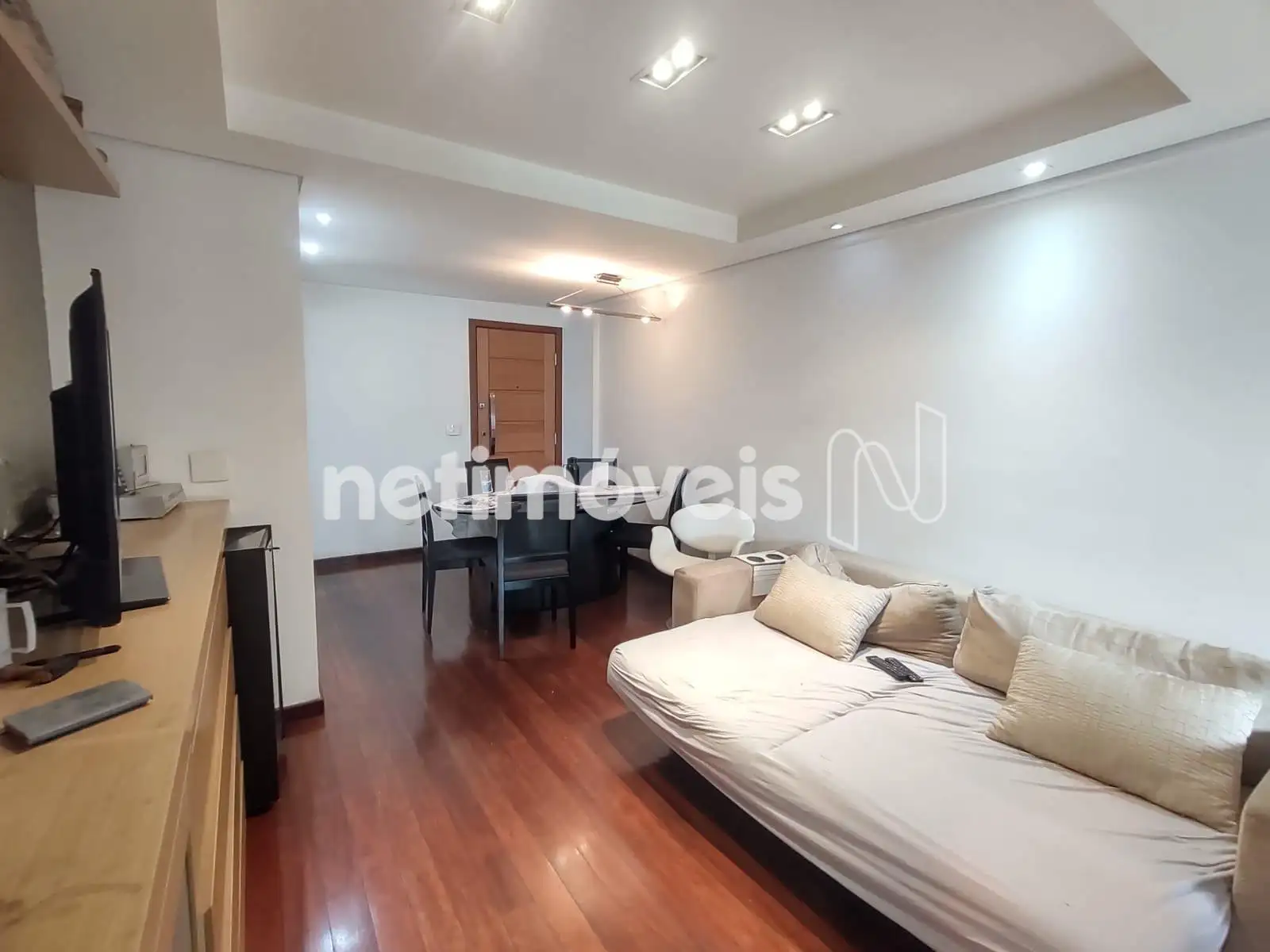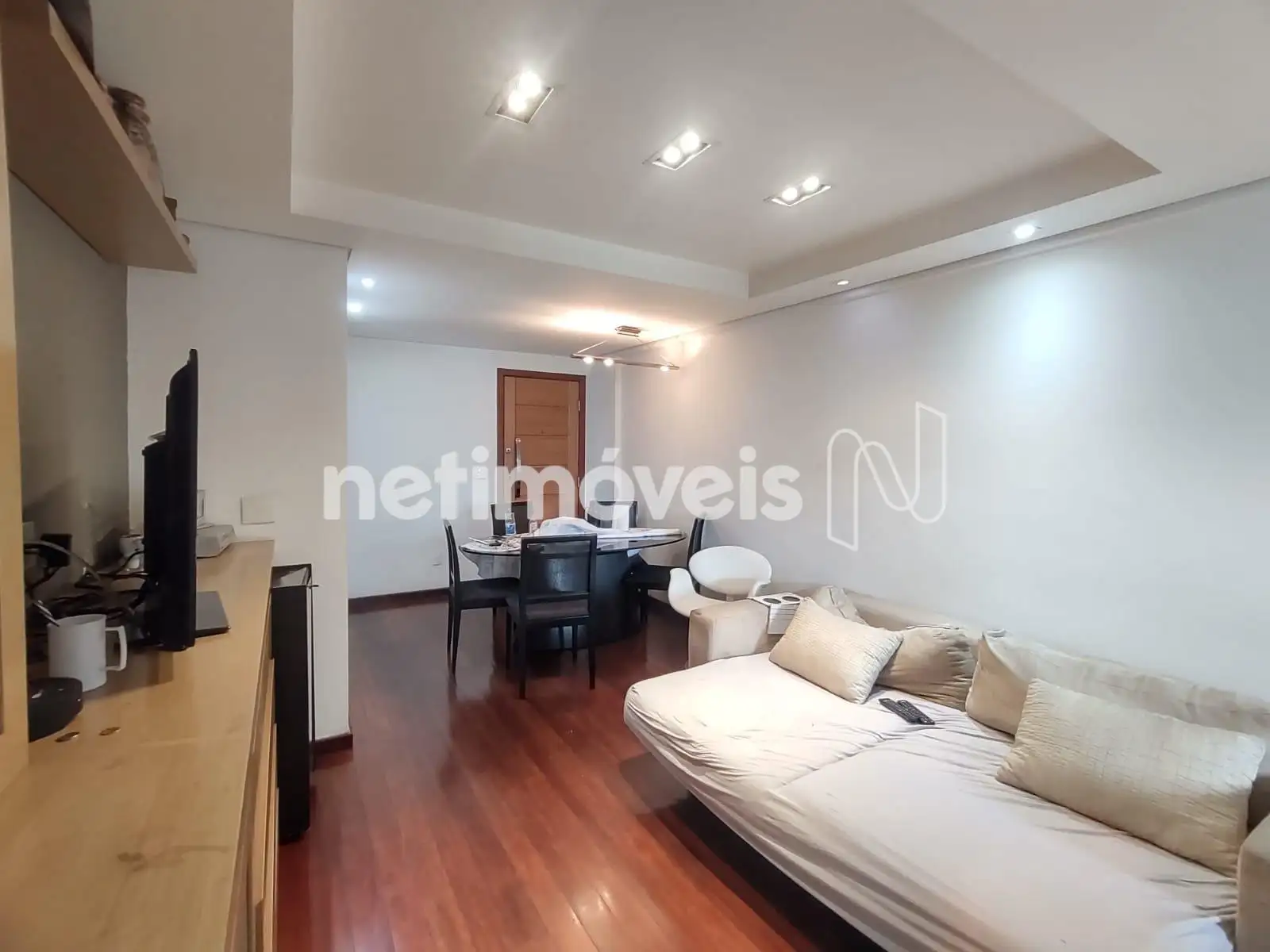 - 01 Sala revestida em piso tábua corrida teto rebaixado em gesso projeto luminotécnico, painel e varanda incorporada revestida em piso cerâmica;