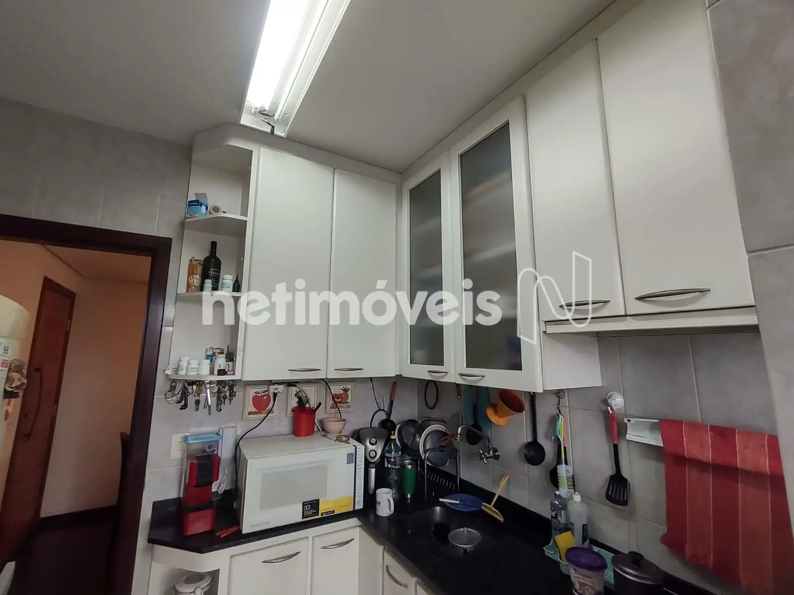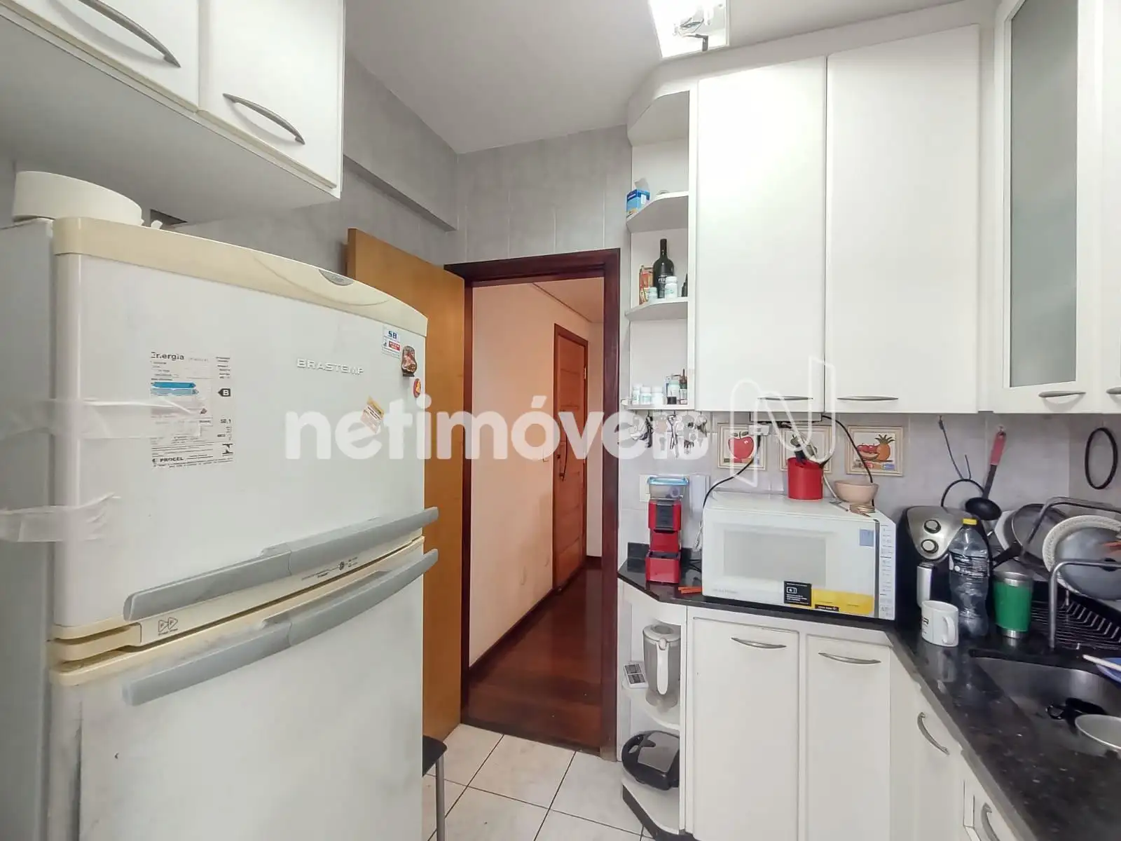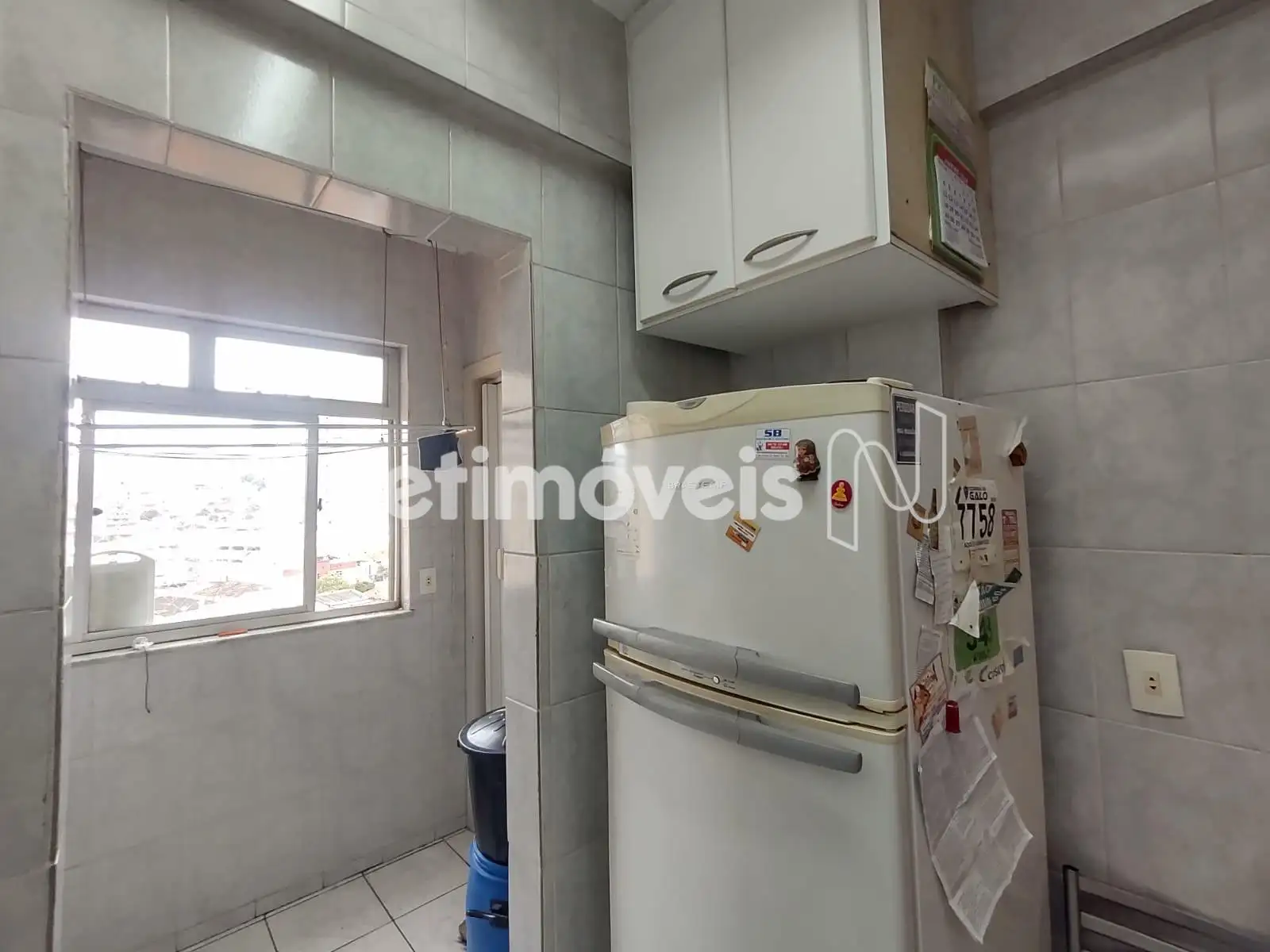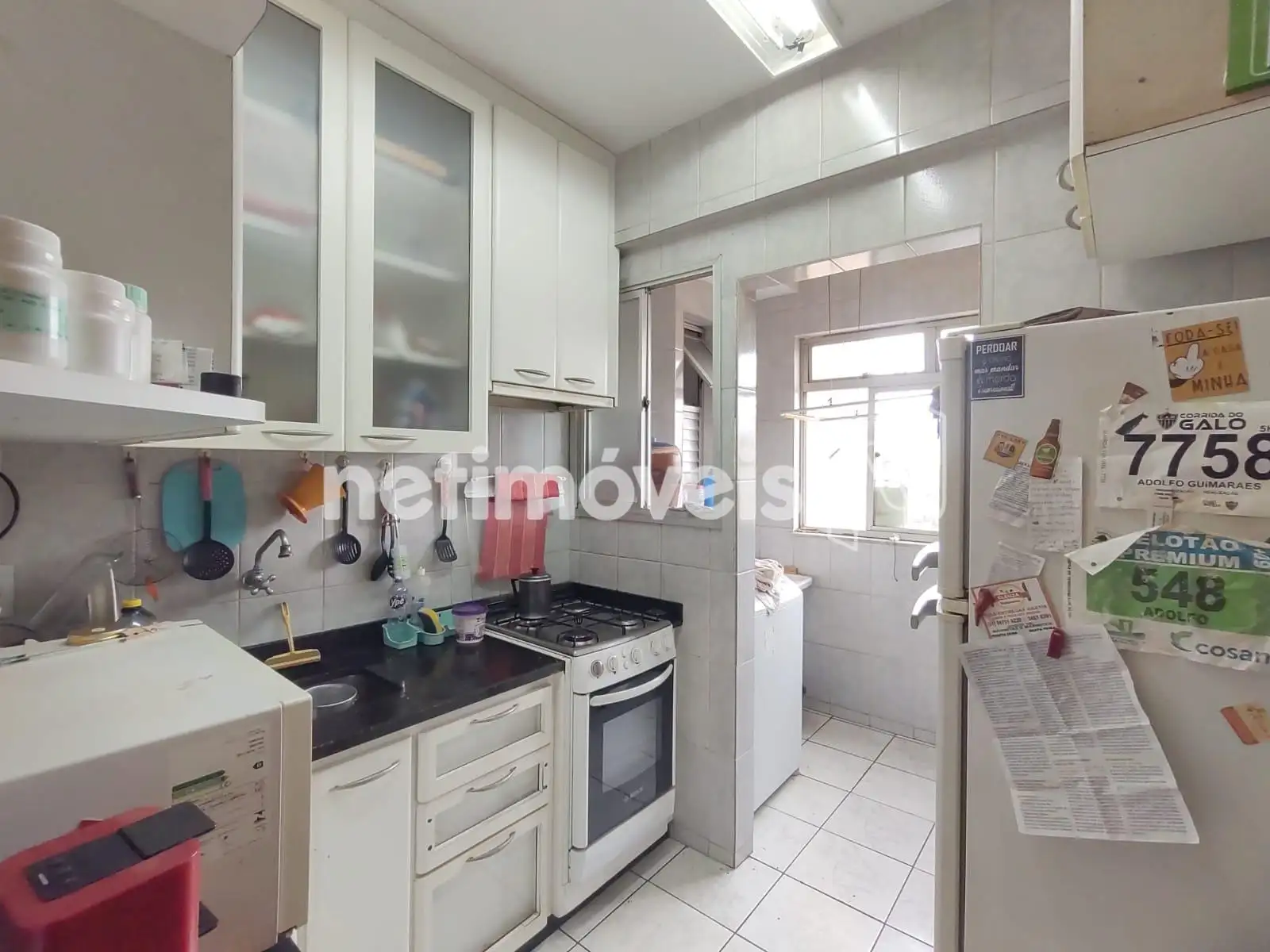 - 01 Cozinha revestida em piso cerâmica com armários sob e sobre a bancada;