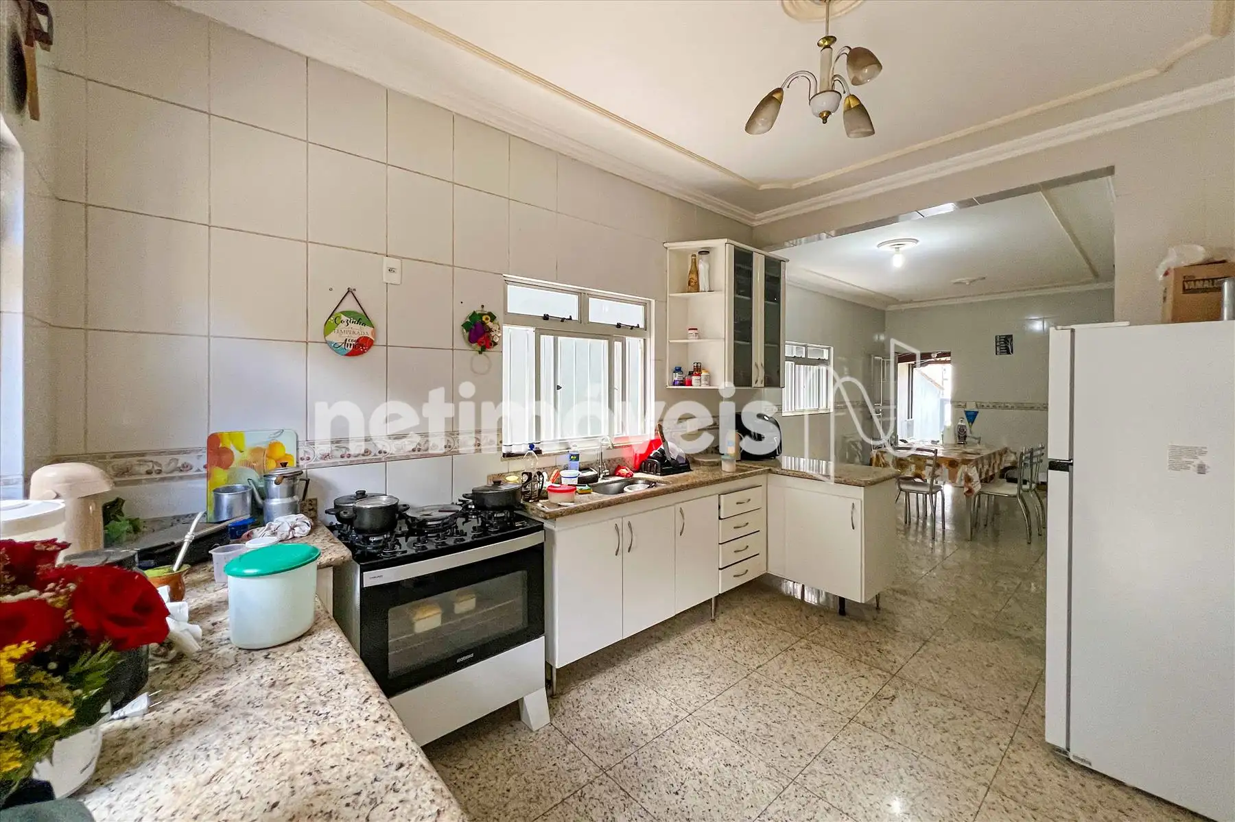 Cozinha espaçosa, com armários planejados e integrada à sala de jantar