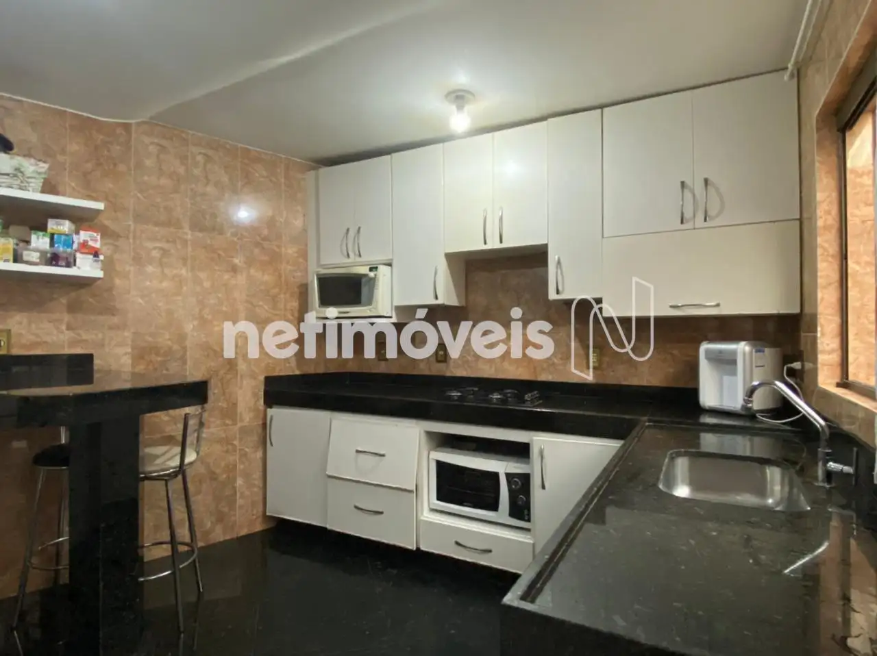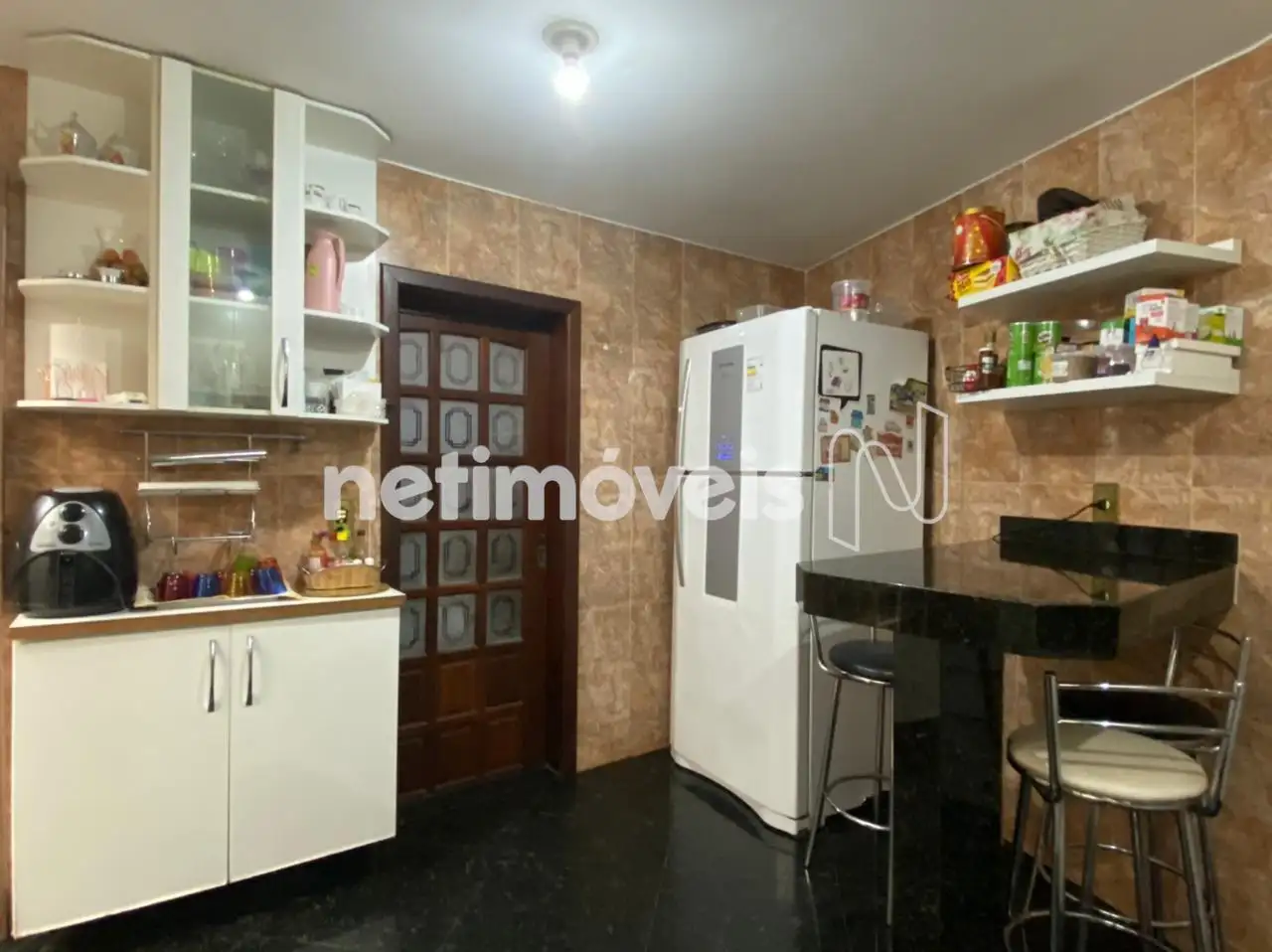 Cozinha com piso e bancada em granito, armários planejados