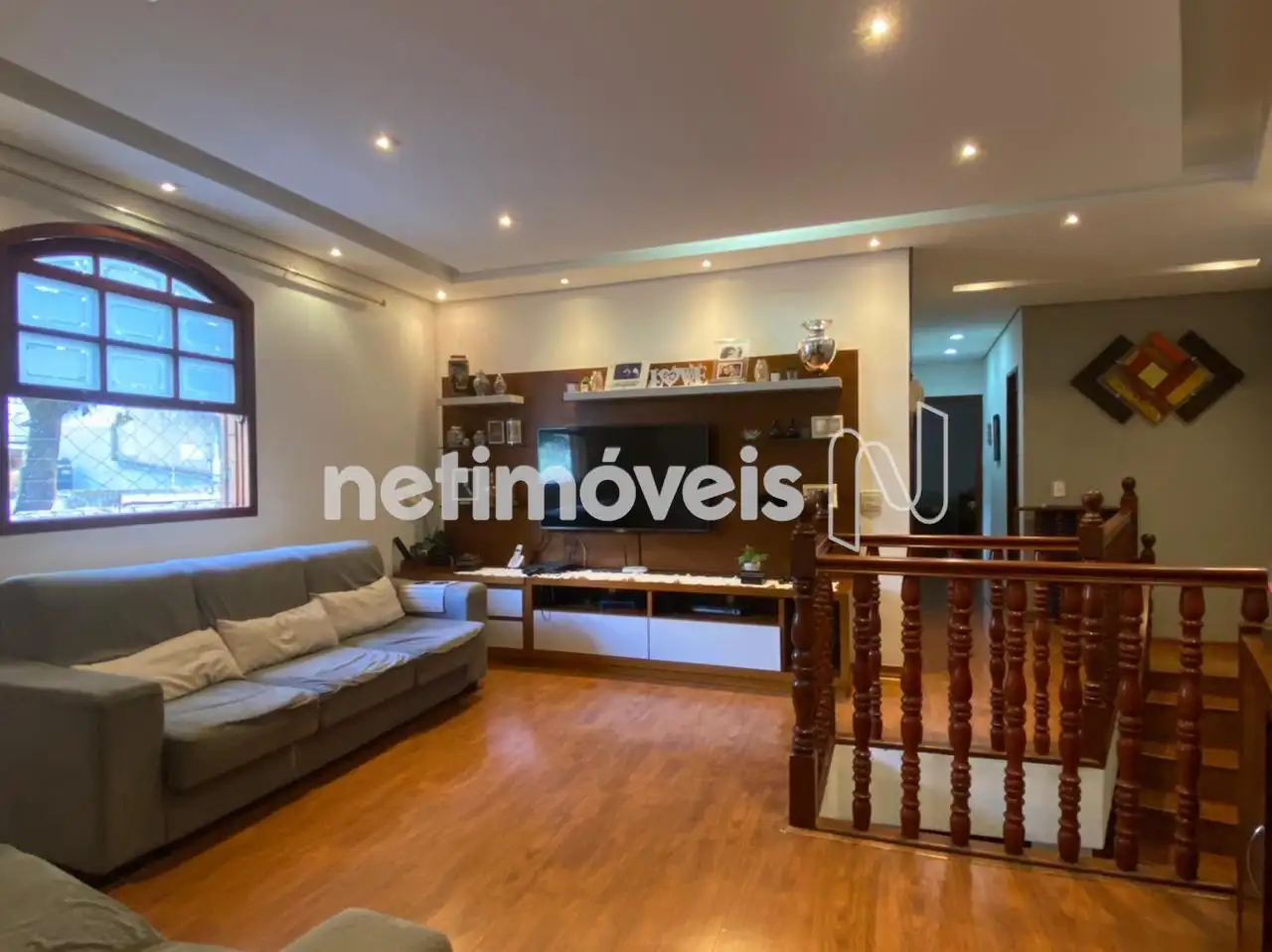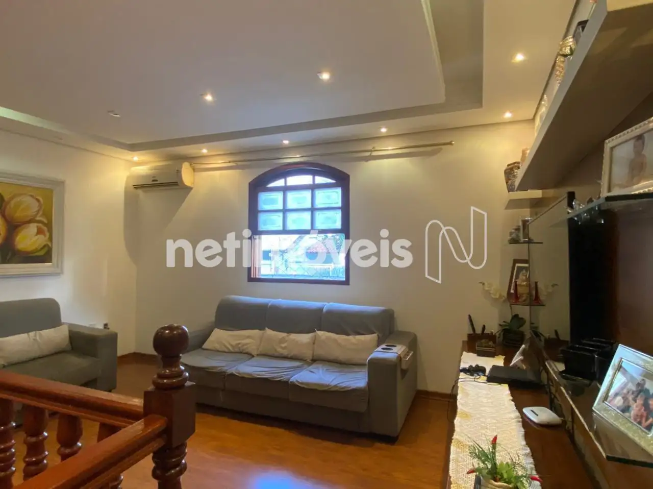 Sala de TV com teto rebaixado em gesso, iluminação indireta e ar-condicionado