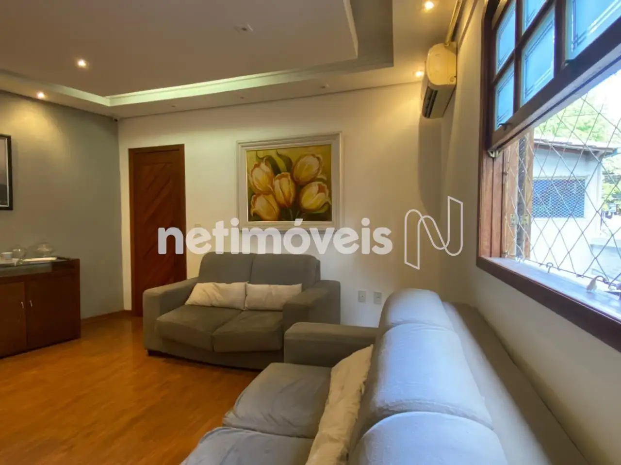 Sala de estar com teto rebaixado em gesso, iluminação indireta e ar-condicionado