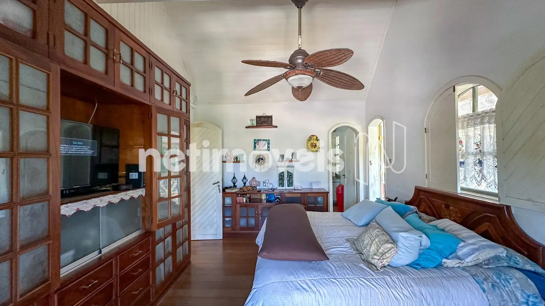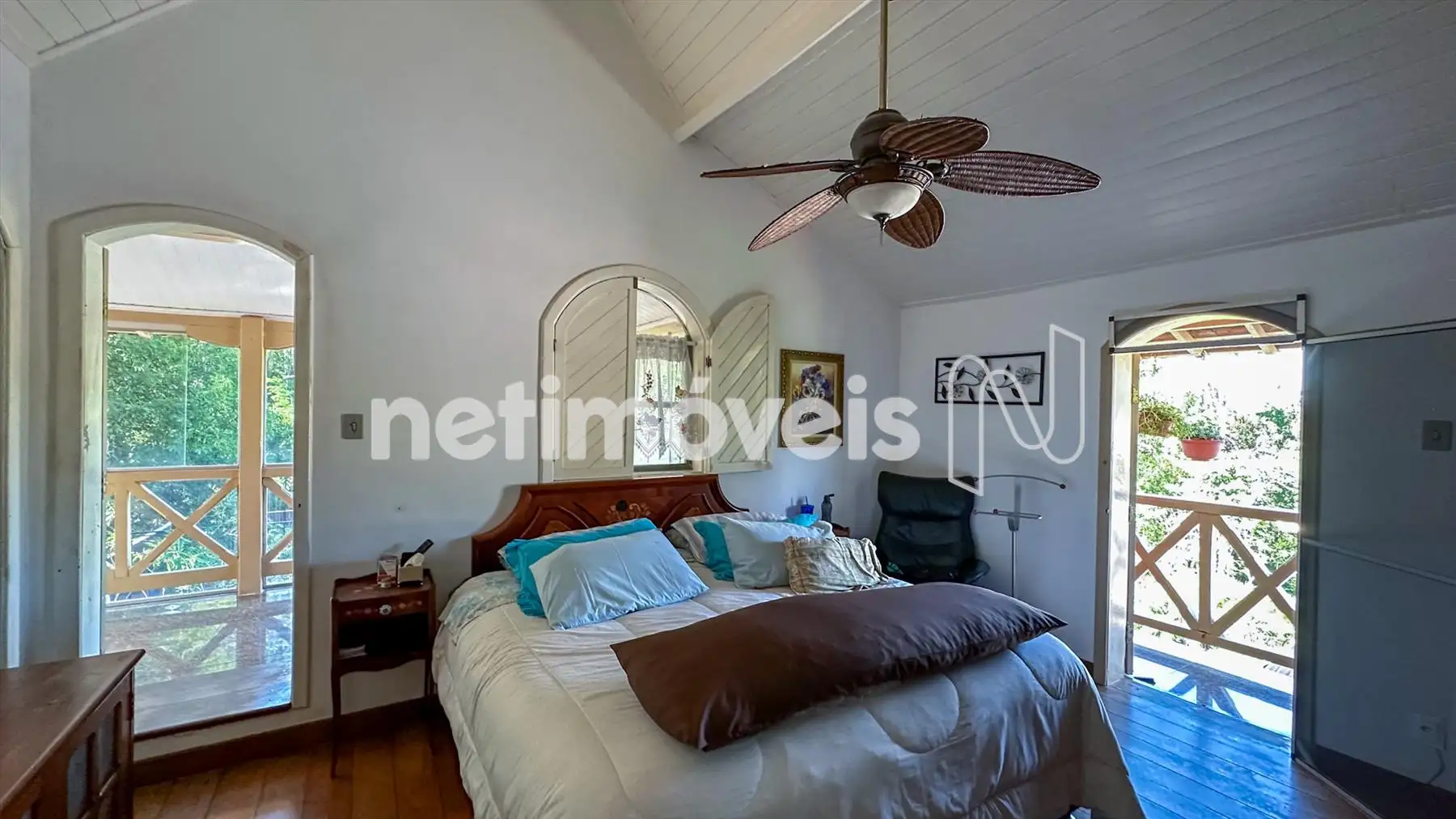 1º quarto: Suíte grande c 2 varandas grandes c vidros temperados formando ambiente agradável a mais na suíte, c a vista p a natureza própria do local, além de deixar o ambiente mais ventilado. O quarto da suíte possui armários, piso em tábua corrida, banheiro c armários, box c blindex e pia em granito.