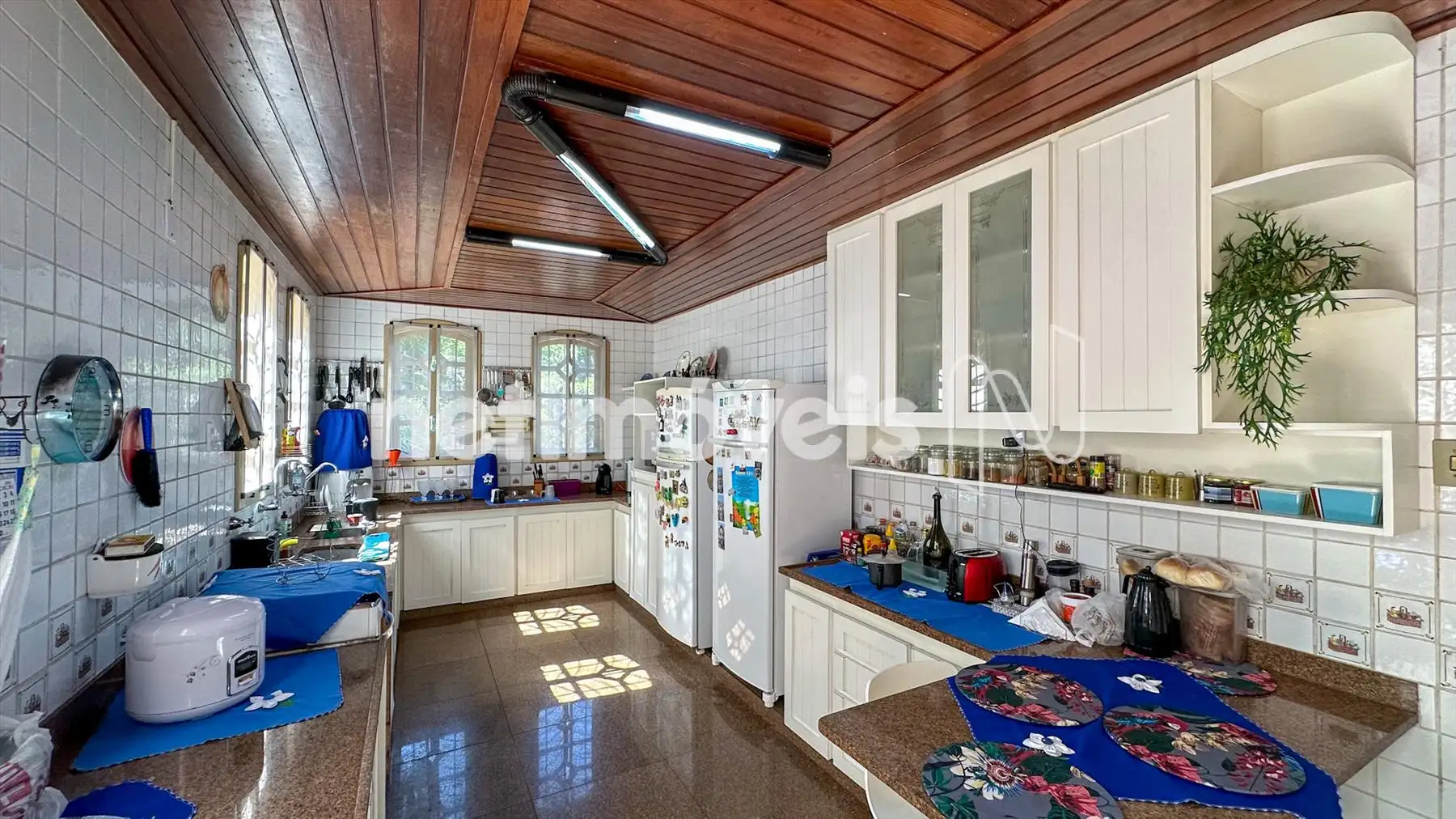 Cozinha grande c/ 2 pias, piso em granito, c armários embutidos e bancada em granito.