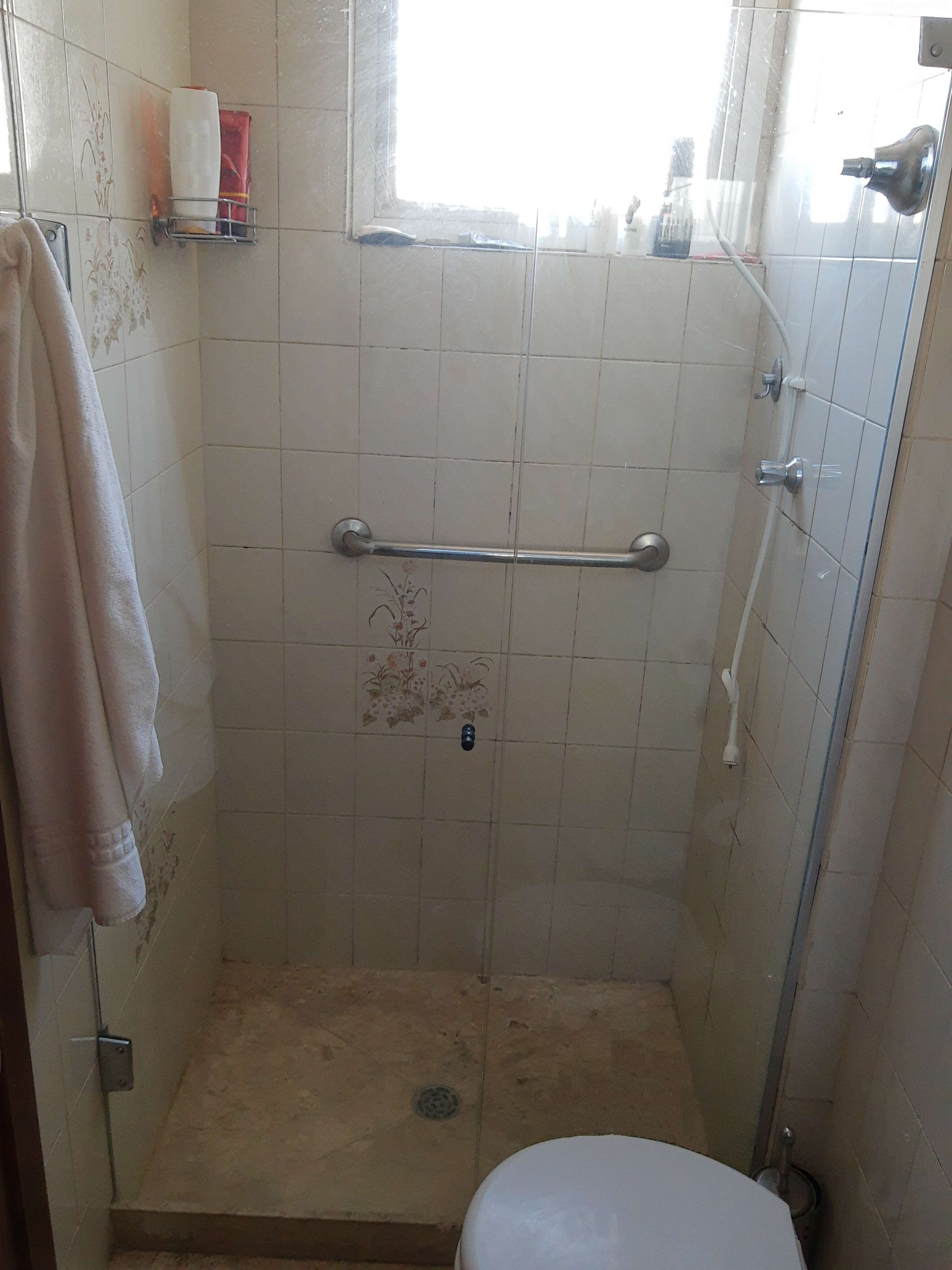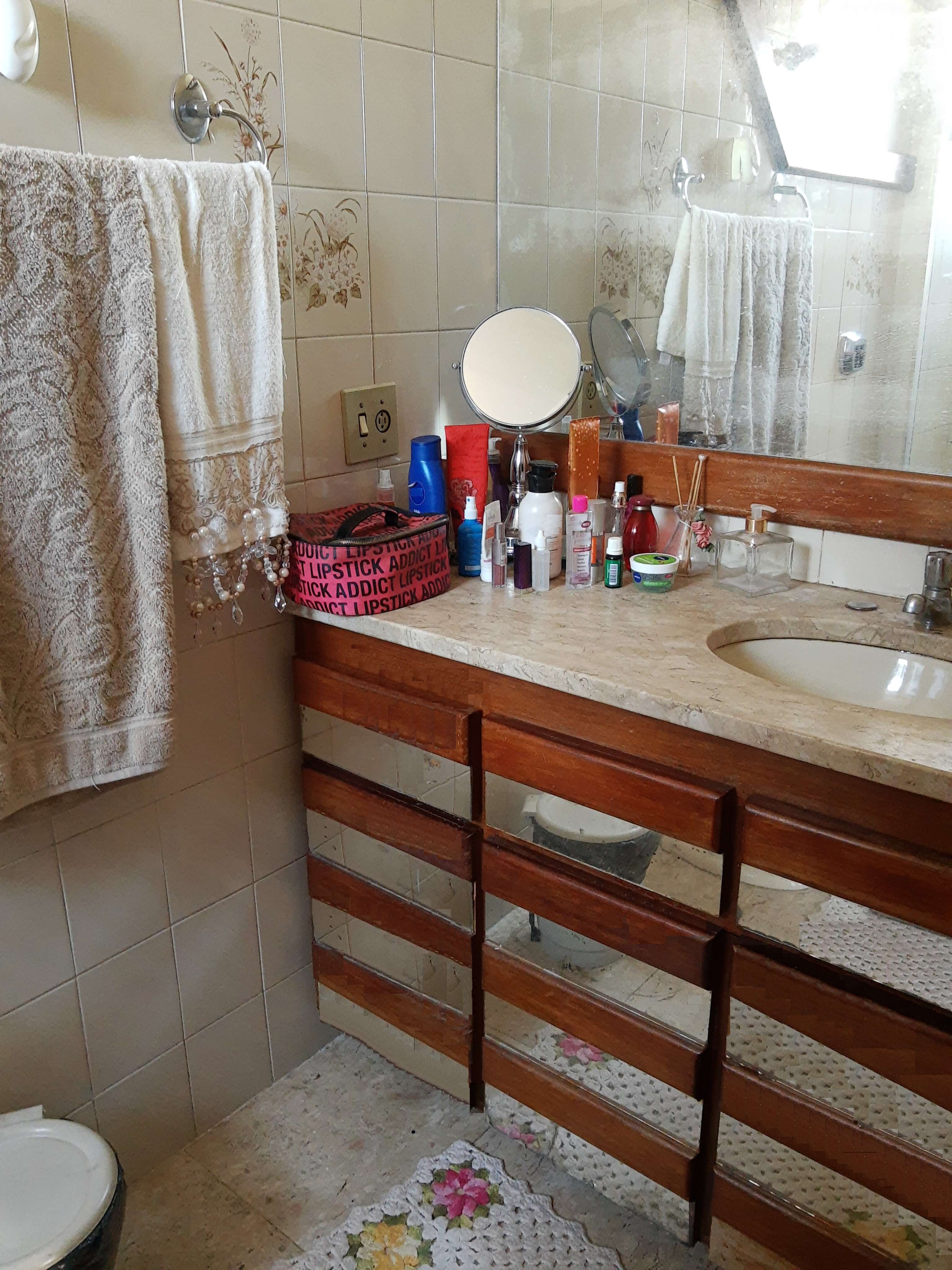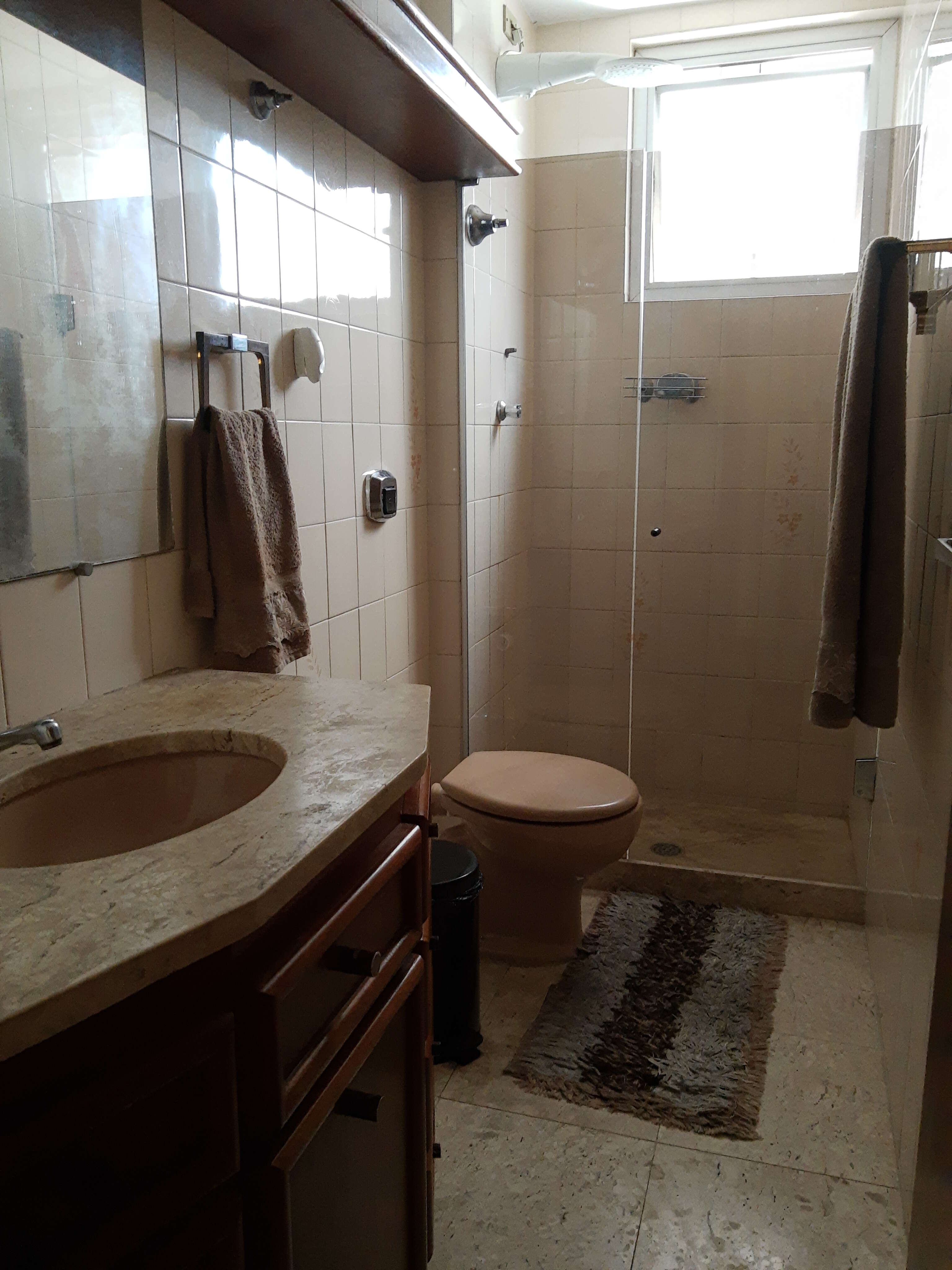 * 03 banhos (01 social, 01 suíte e 01 de empregada) sendo o suíte/social c/ bancada e piso em mármore nobre (Marta Rocha), box blindex, armários sob pia.