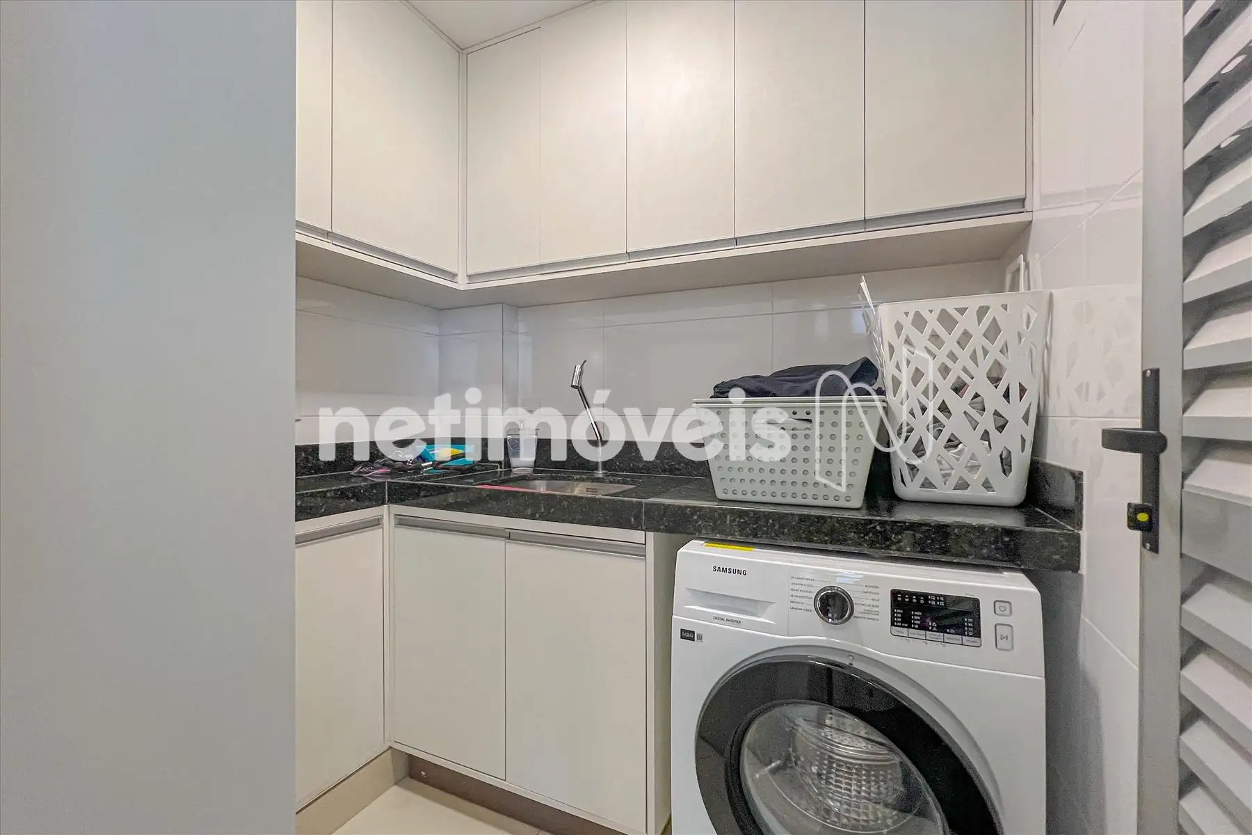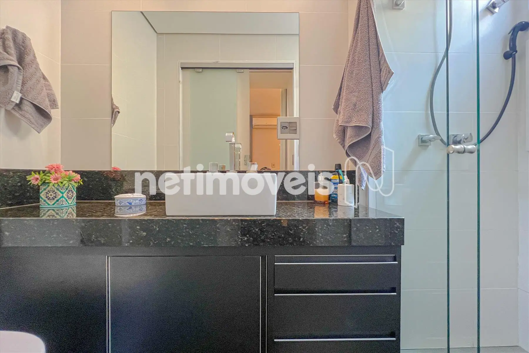 - Semi suíte com piso e bancada em granito, montada com armários, espelho e box em vidro temperado;