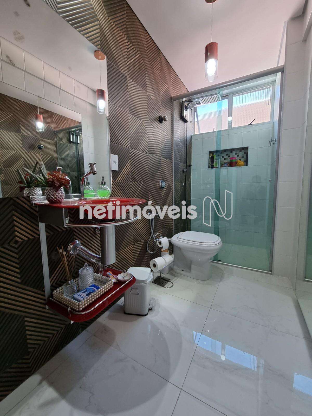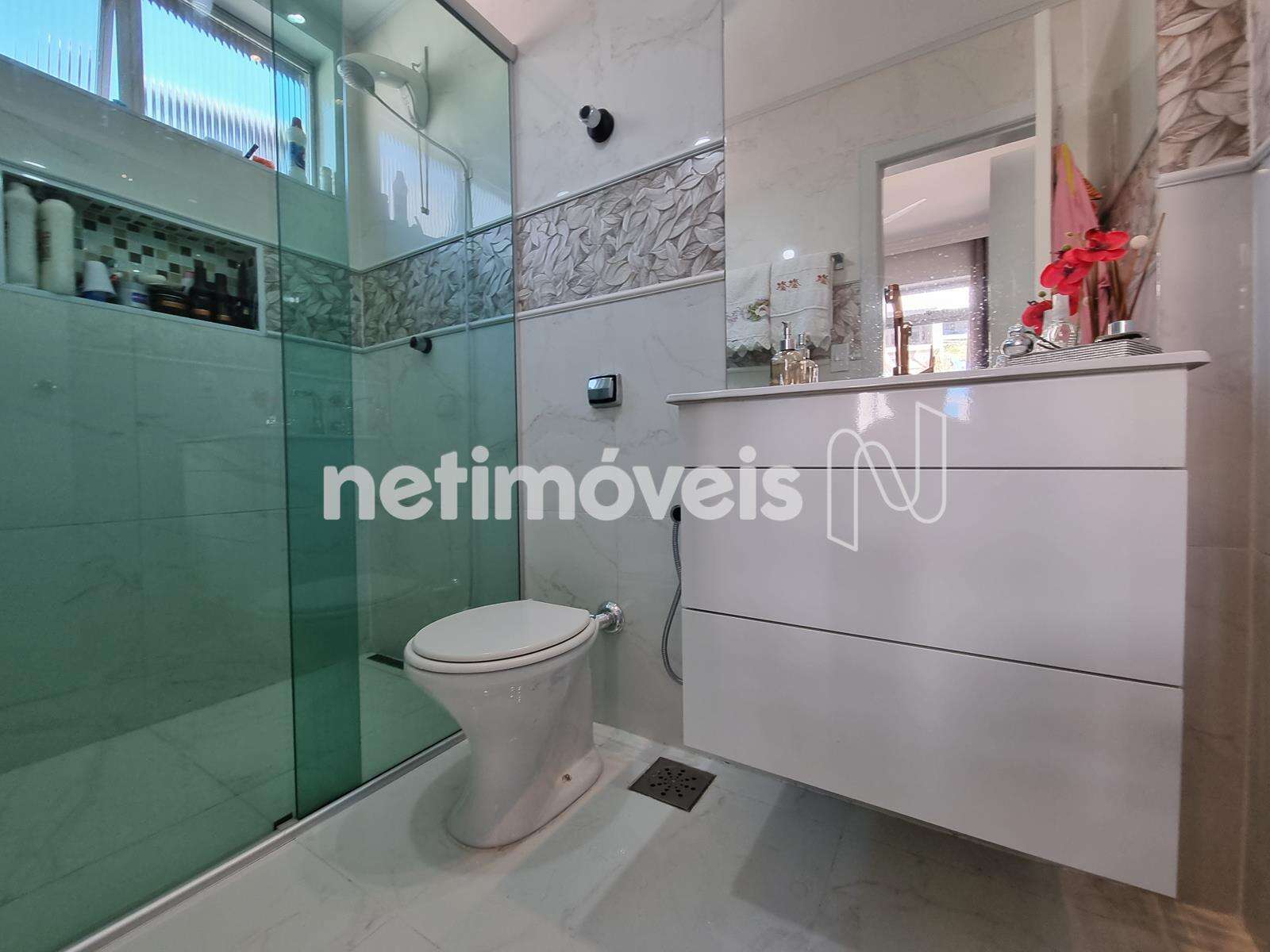 - Banho social com piso em porcelanato, espelho, armários, box