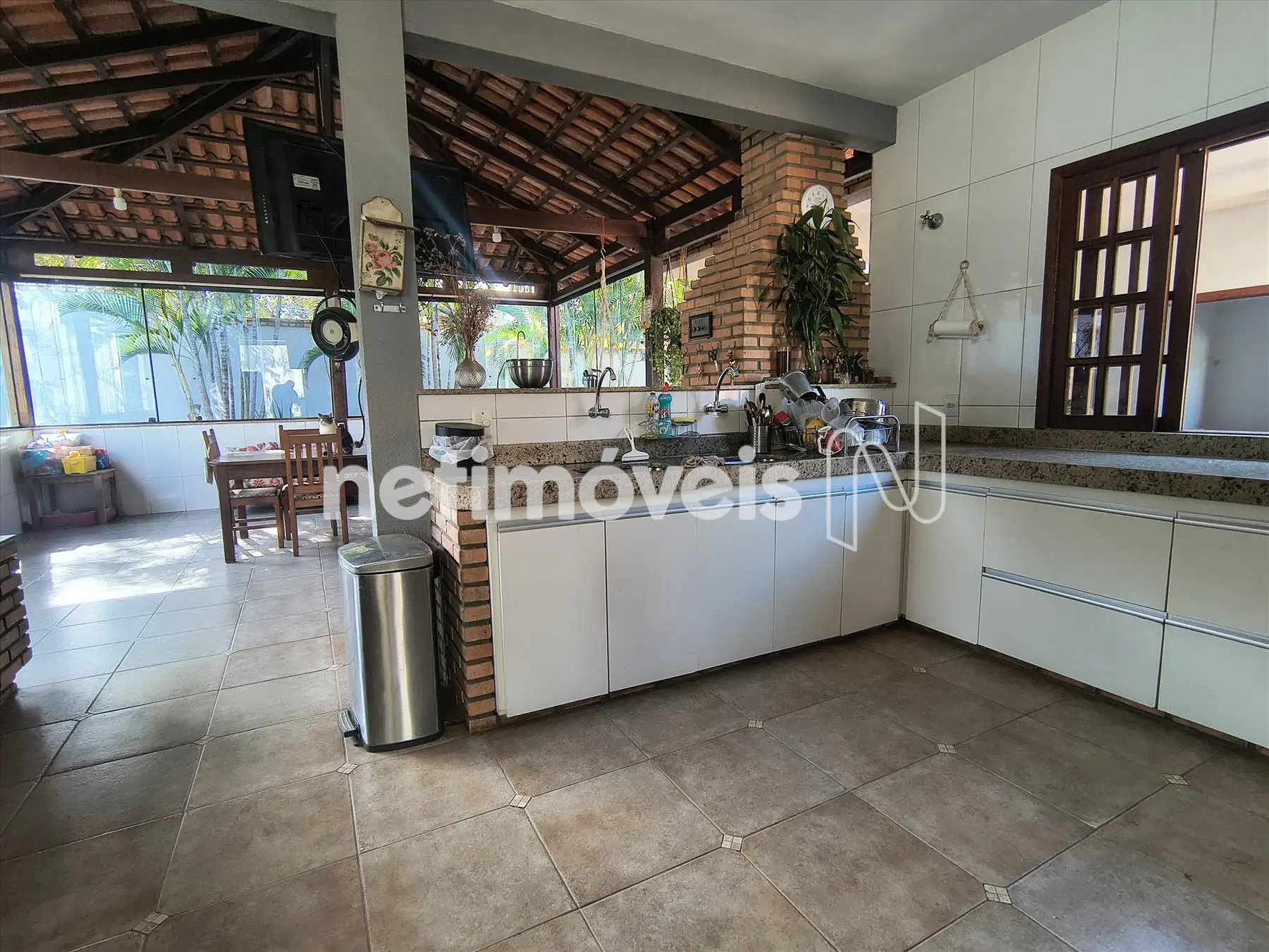 Churrasqueira e espaço para mesa de 10 lugares.