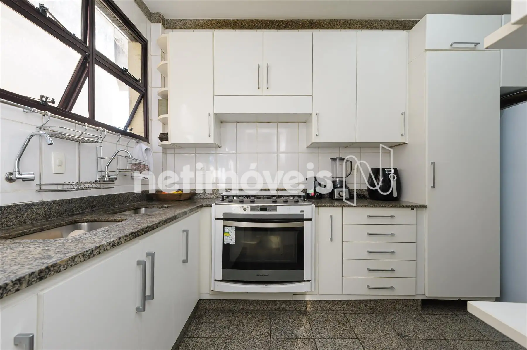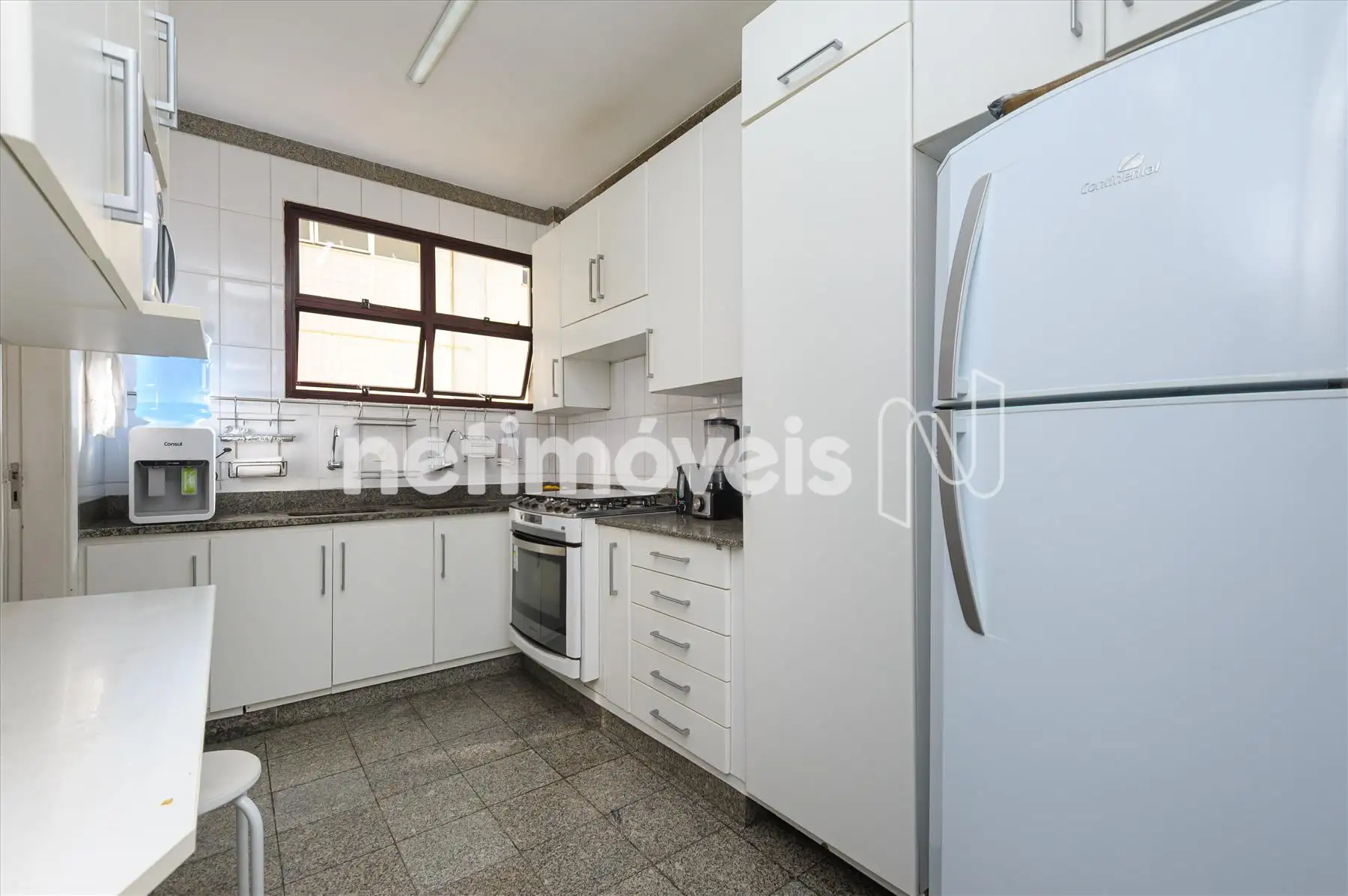- Cozinha muito ampla, clara e arejada ,revestida em mármore, rica em armários planejados sob e sobre bancadas, com àrea de serviço e DCE anexos.