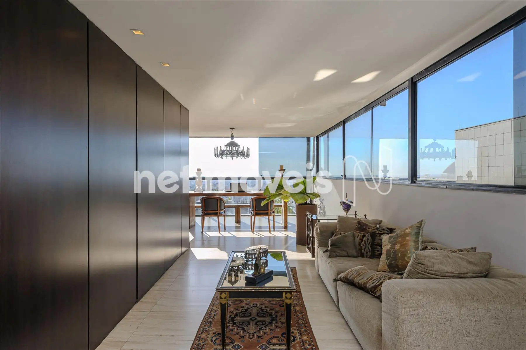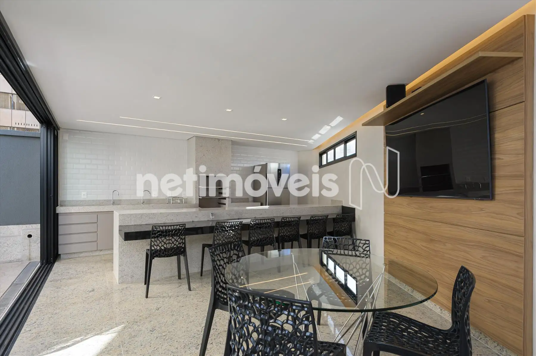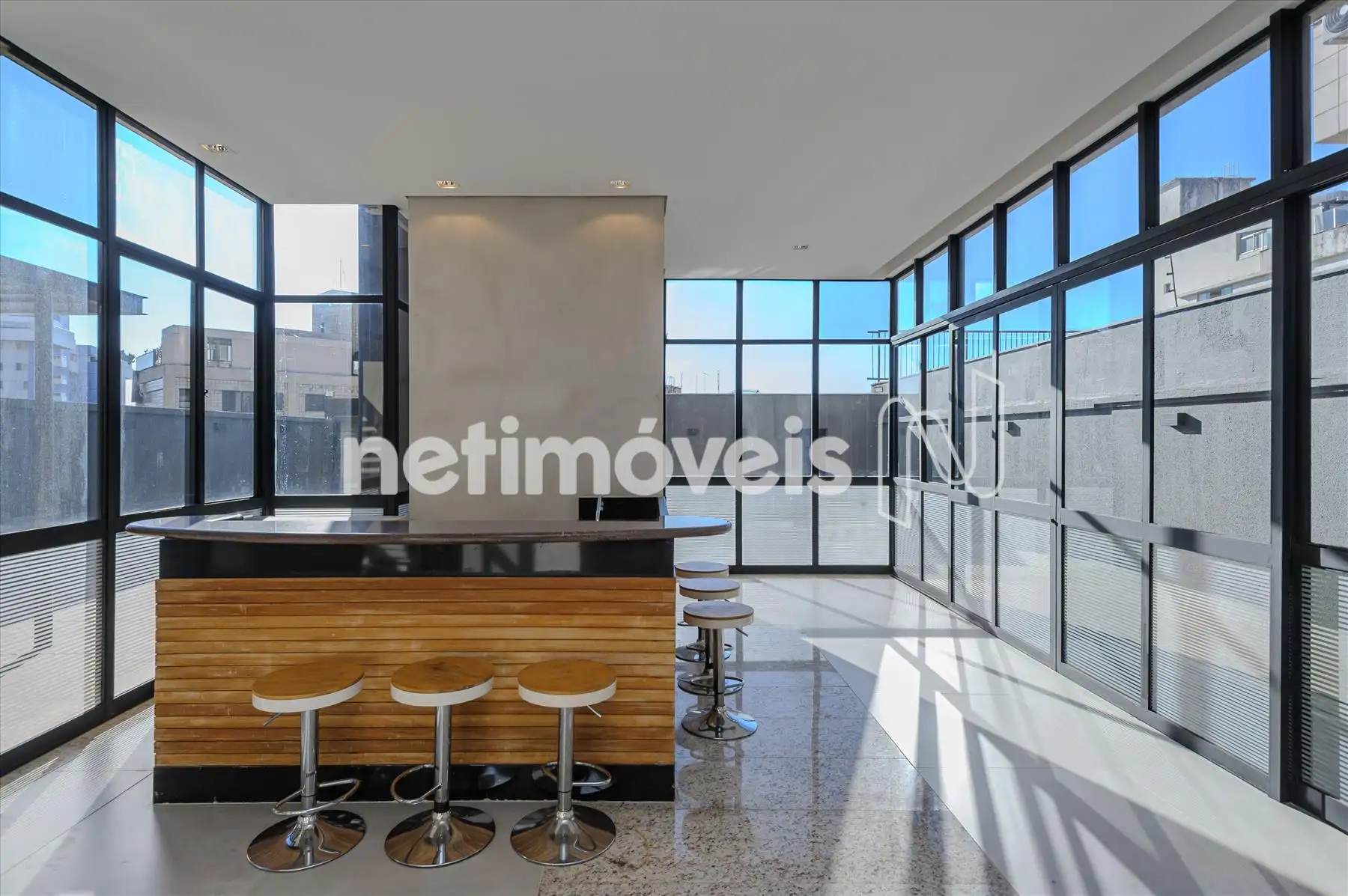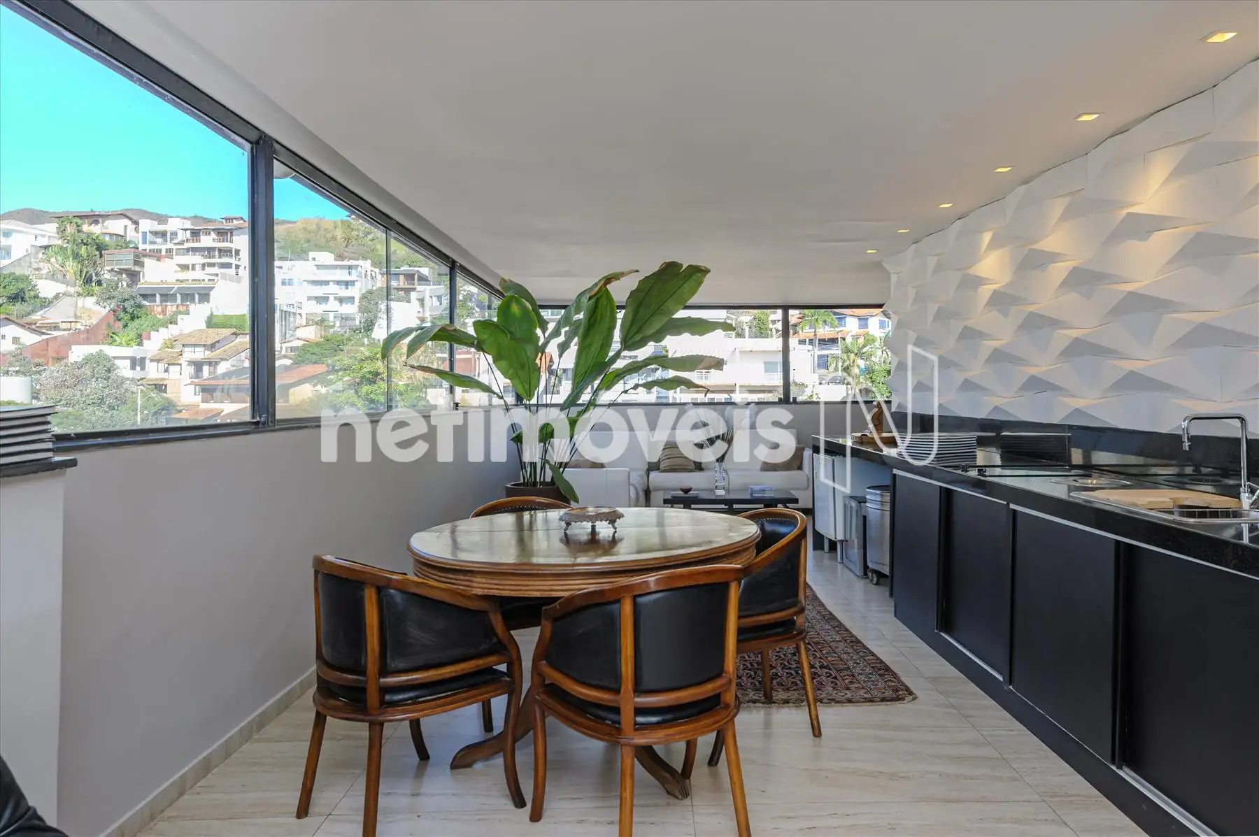 - Salão para festas com frente e lateral envidraçadas, proporcionando vista para a piscina , para a cidade e as montanhas. Painéis com armários por todo o ambiente. Espaço gourmet montado.