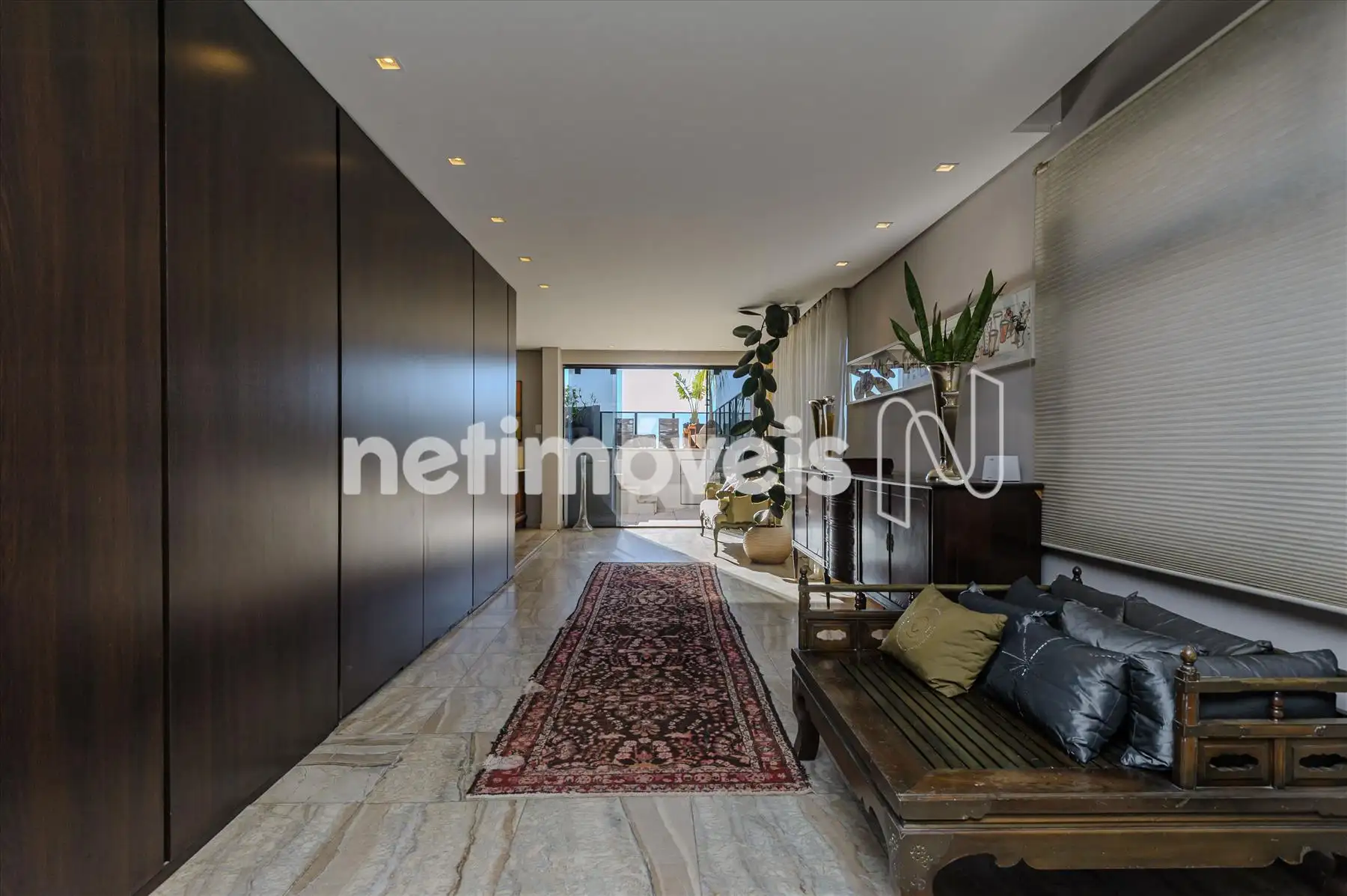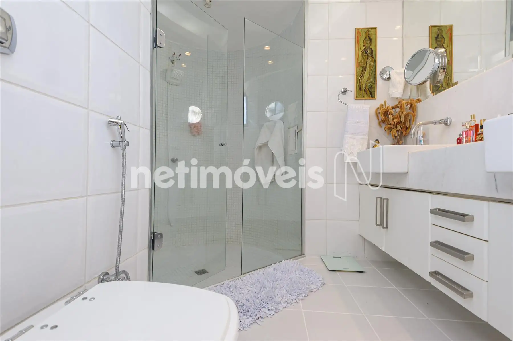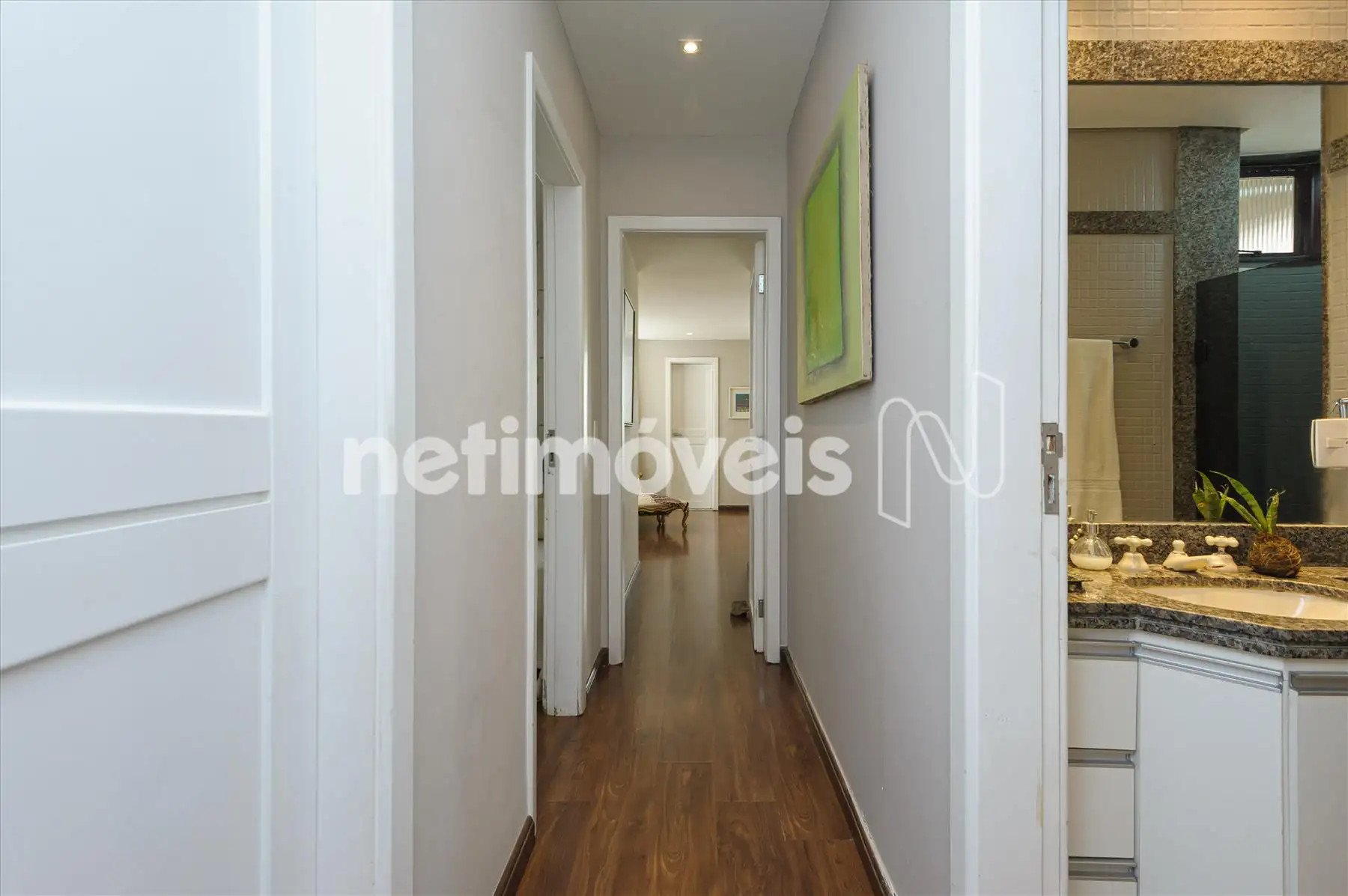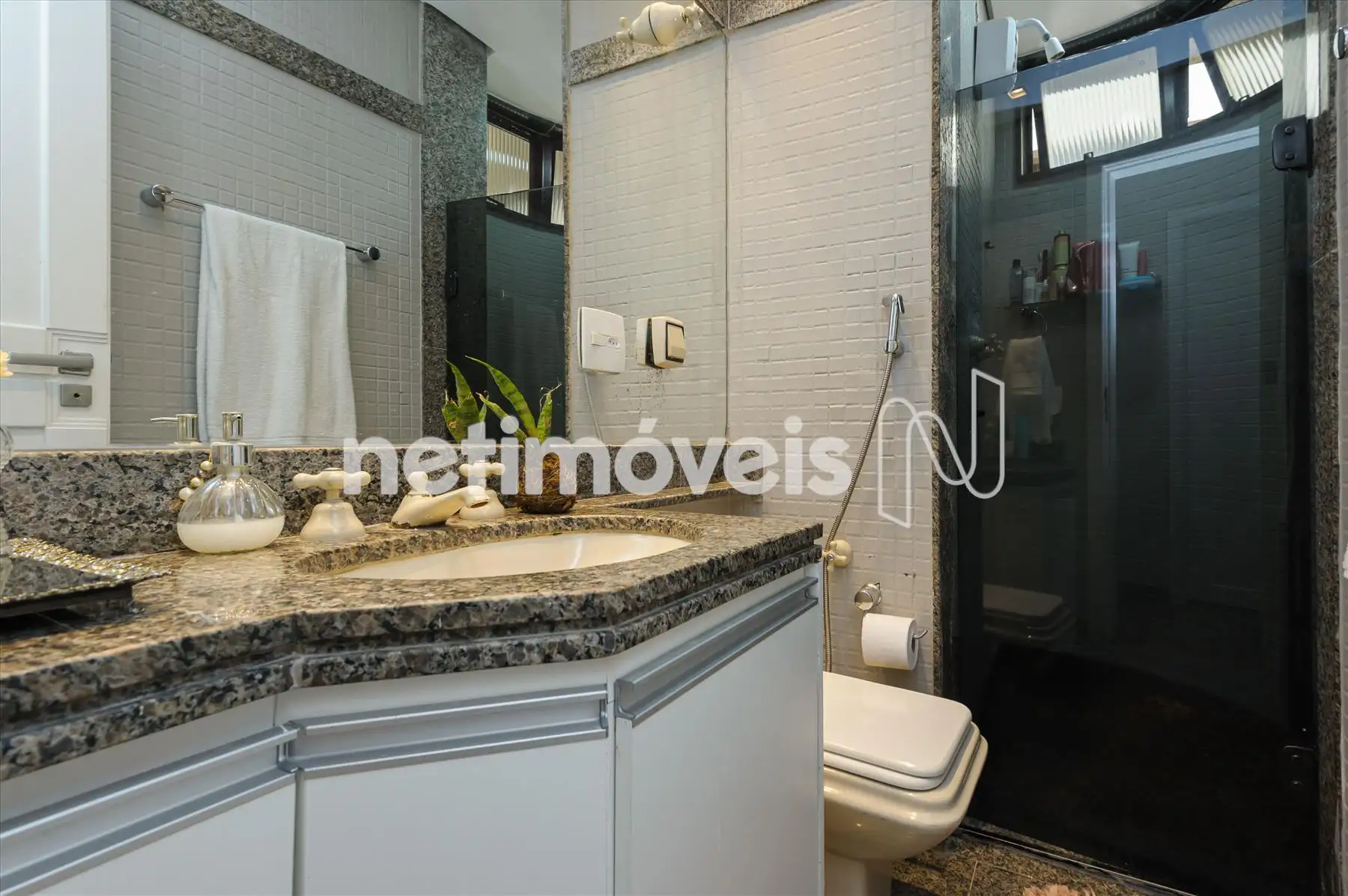 - Banhos social e suíte com bancadas em mármore, armários e box em vidro.