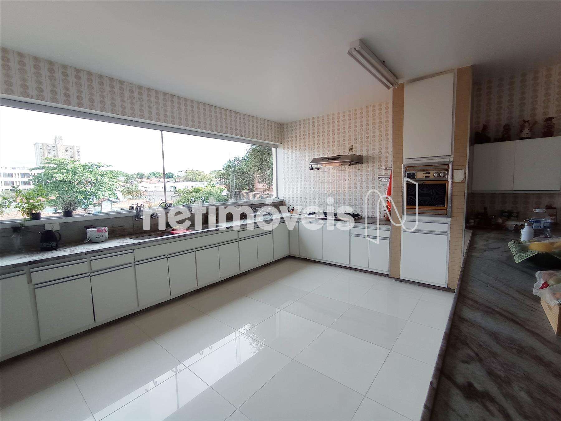 Cozinha decorada com piso em porcelanato, bancada em mármore com forno e fogão,
