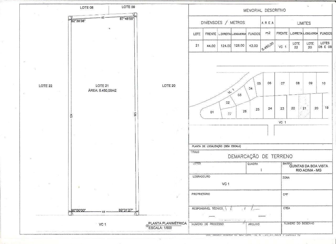 Lote com 5.450,00 m², sendo 44 metros de frente, 124 metros na lateral esquerda, 43 mtros de fundos e 126 metros de lateral direita. Topografia em declive.
