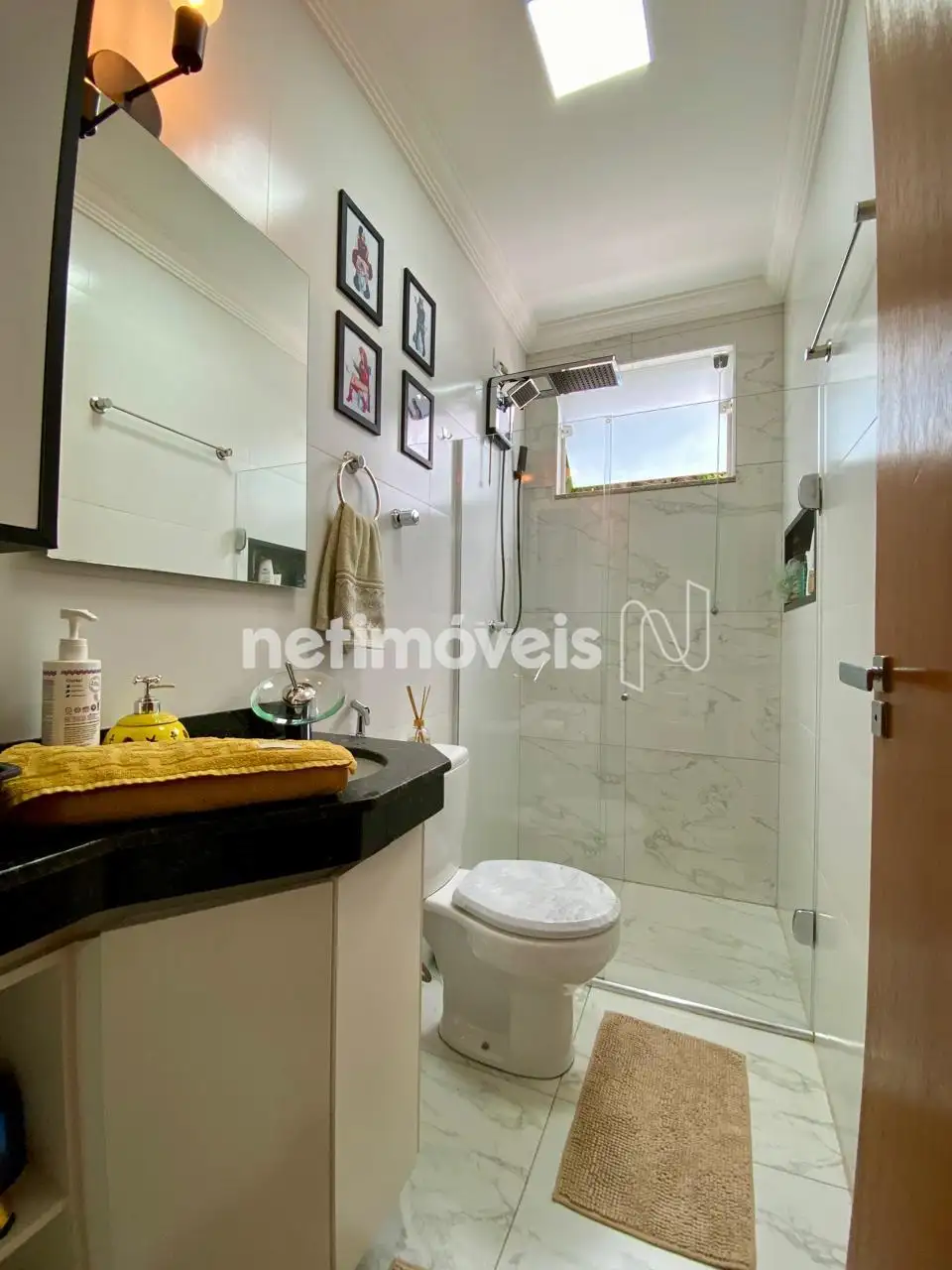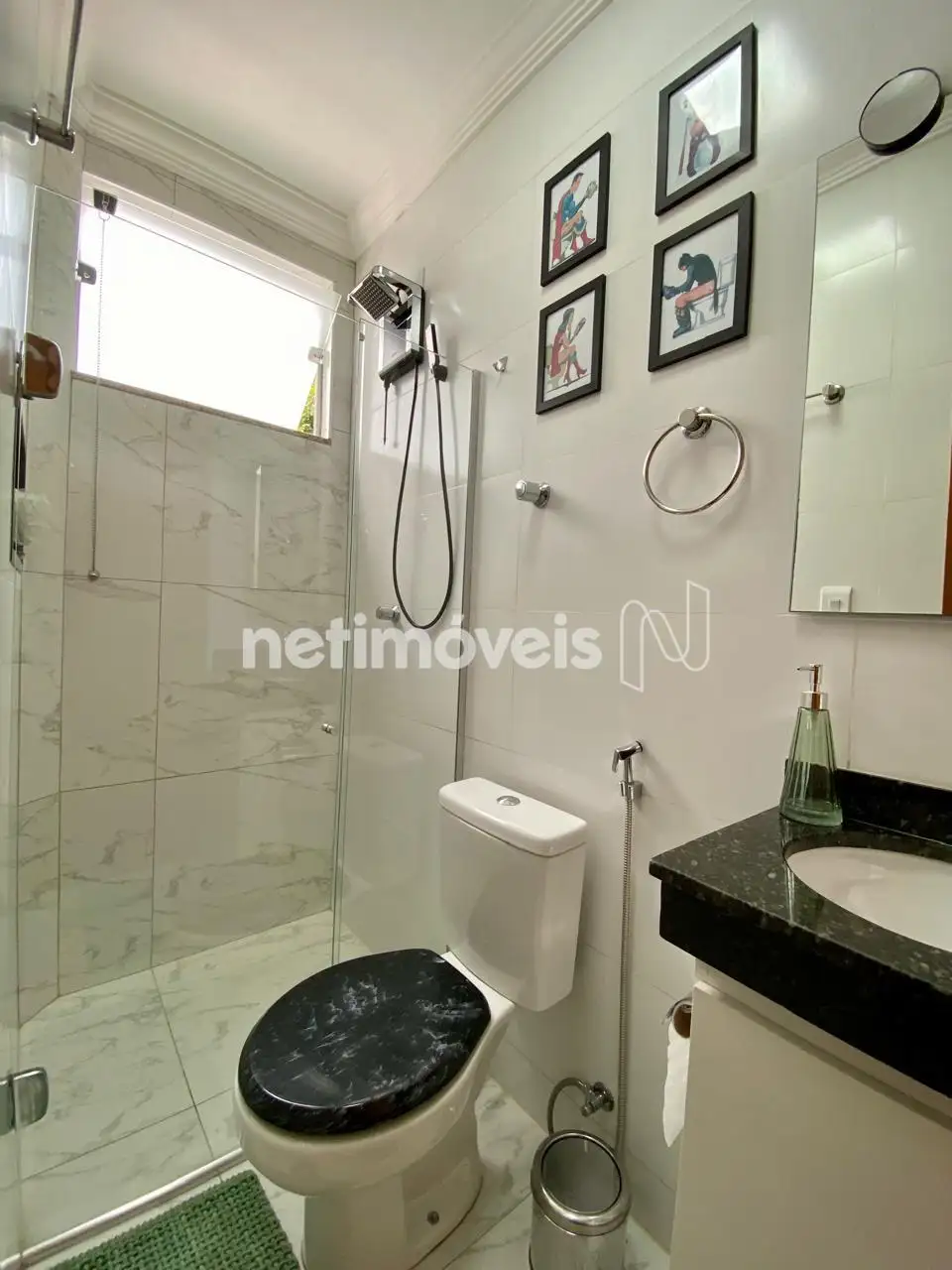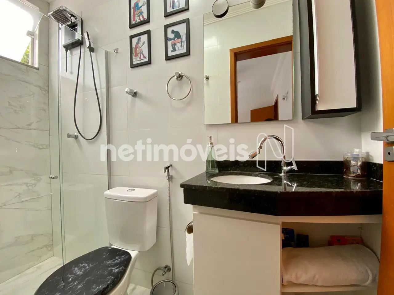 Banheiro Social: Acabamento moderno e box e armário instalado.