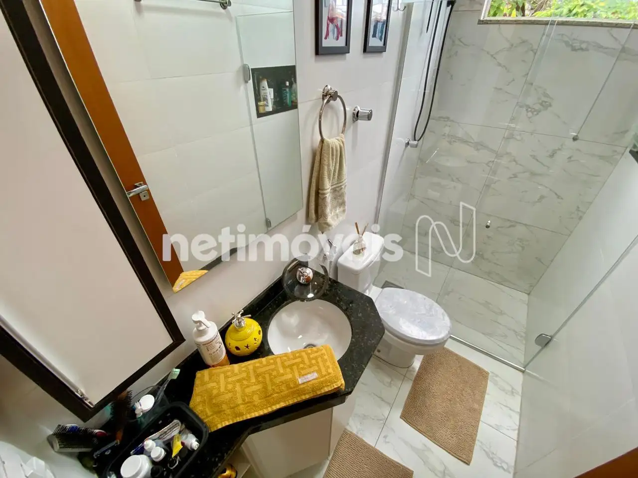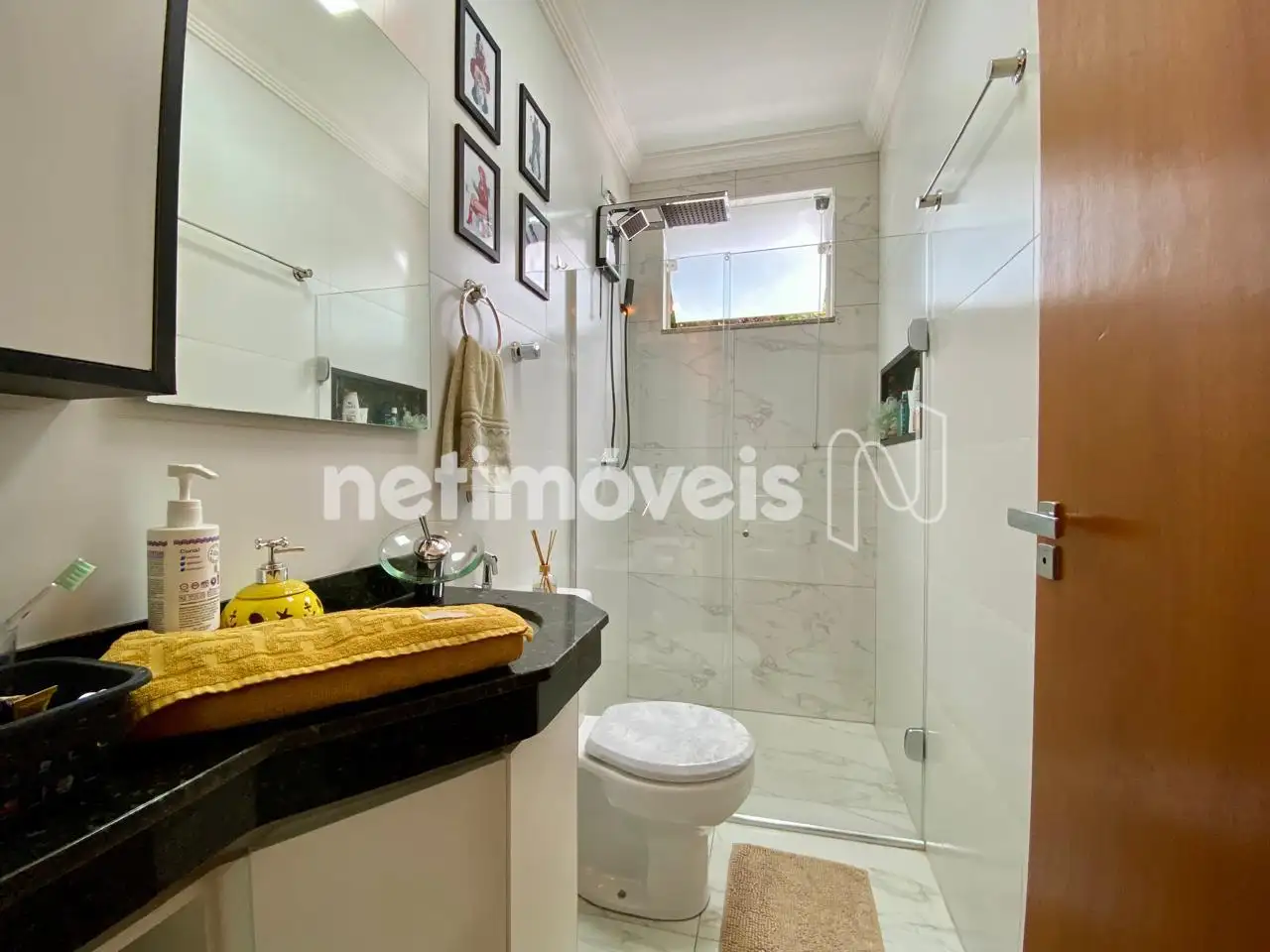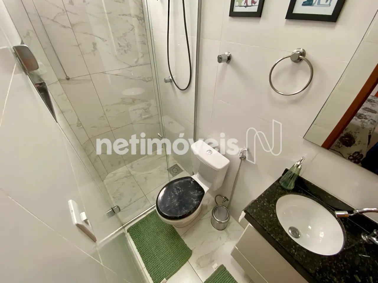 Banheiro Social: Acabamento moderno e box e armário instalado.