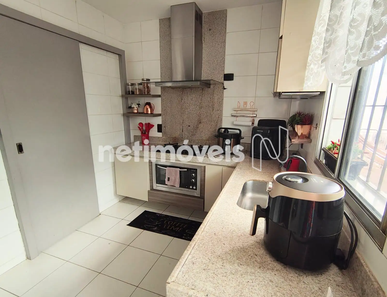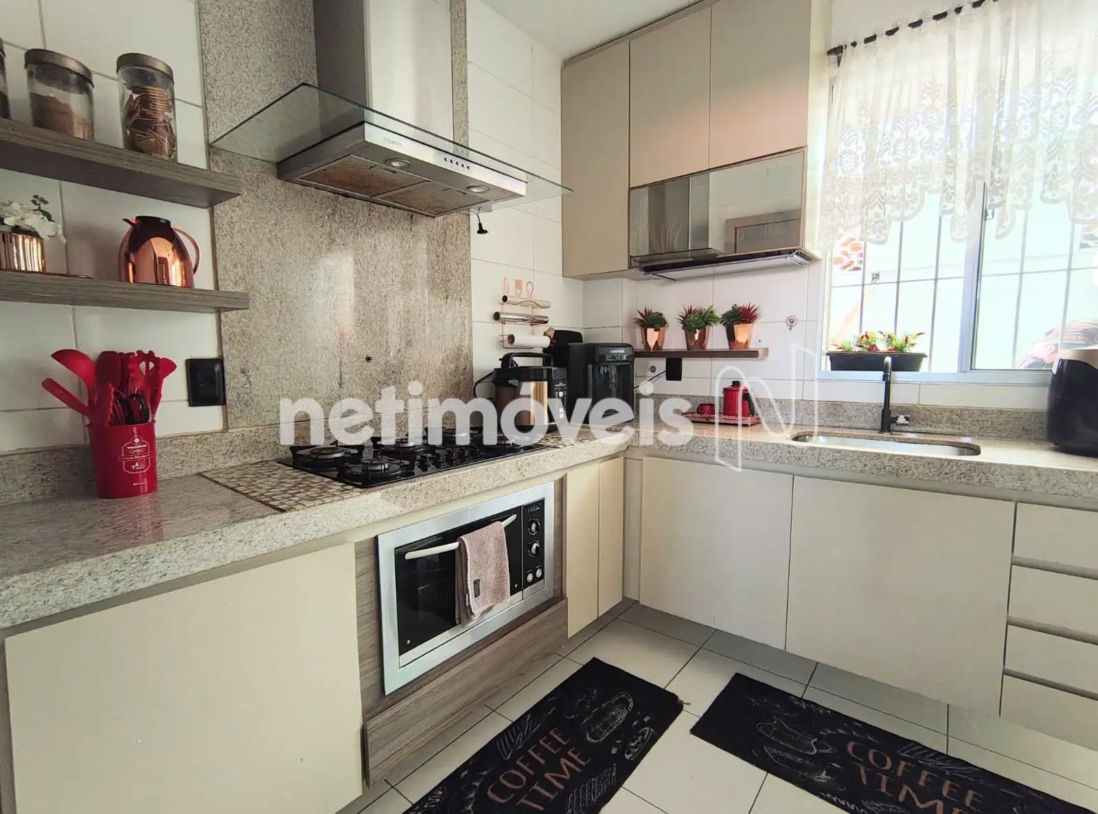 Cozinha montada com armários, fogão cooktop, forno embutido, coifa em inox.