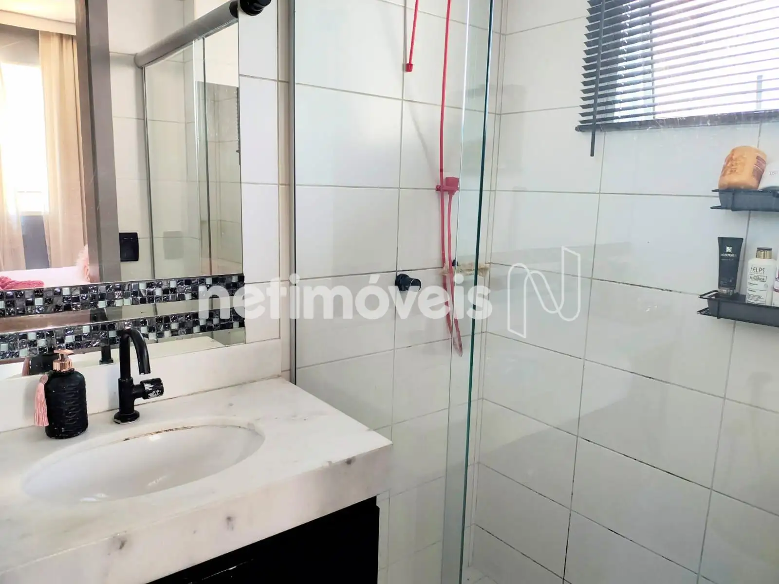 Banho social e suíte com armário e box em vidro temperado.