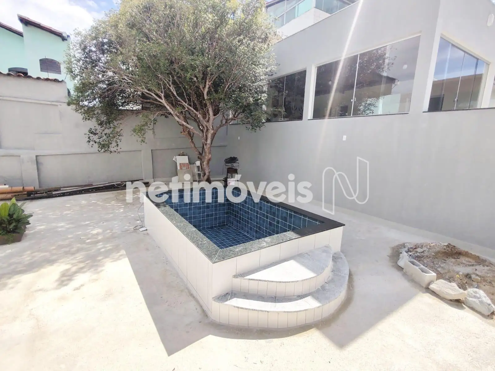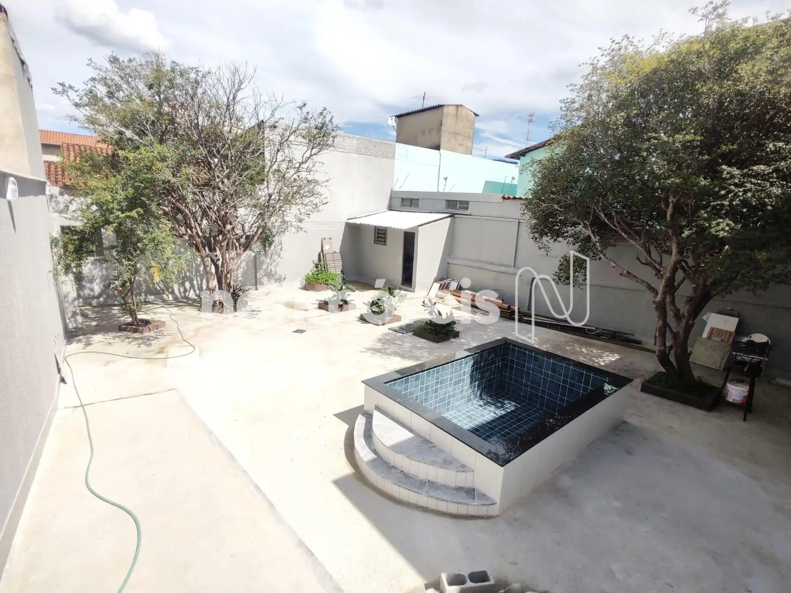 Área dos fundos com Piscina, varias árvores frutíferas, quartinho de despejo.