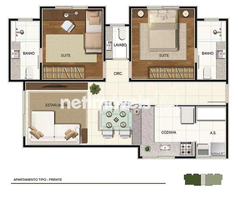 Possui uma sala para dois ambientes, lavabo, cozinha estilo americana com bancada em granito, dois quartos, sendo duas suítes e área de serviço.