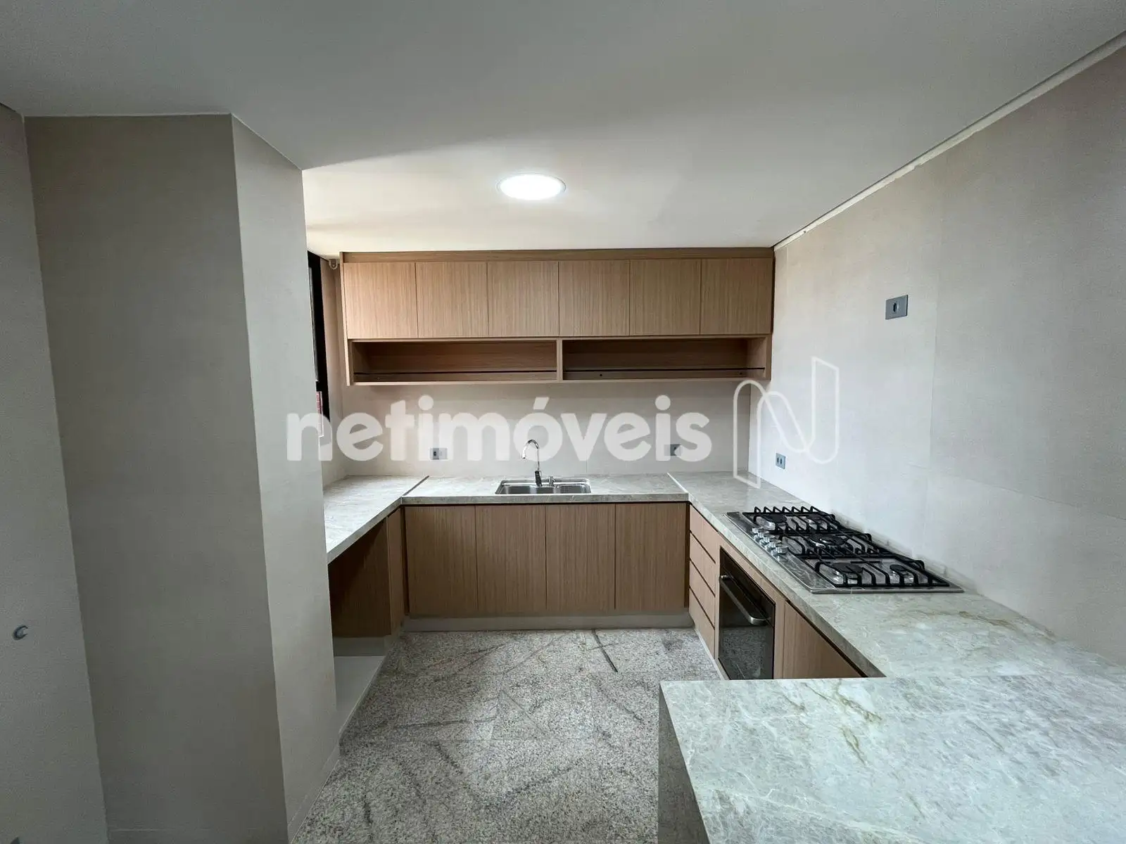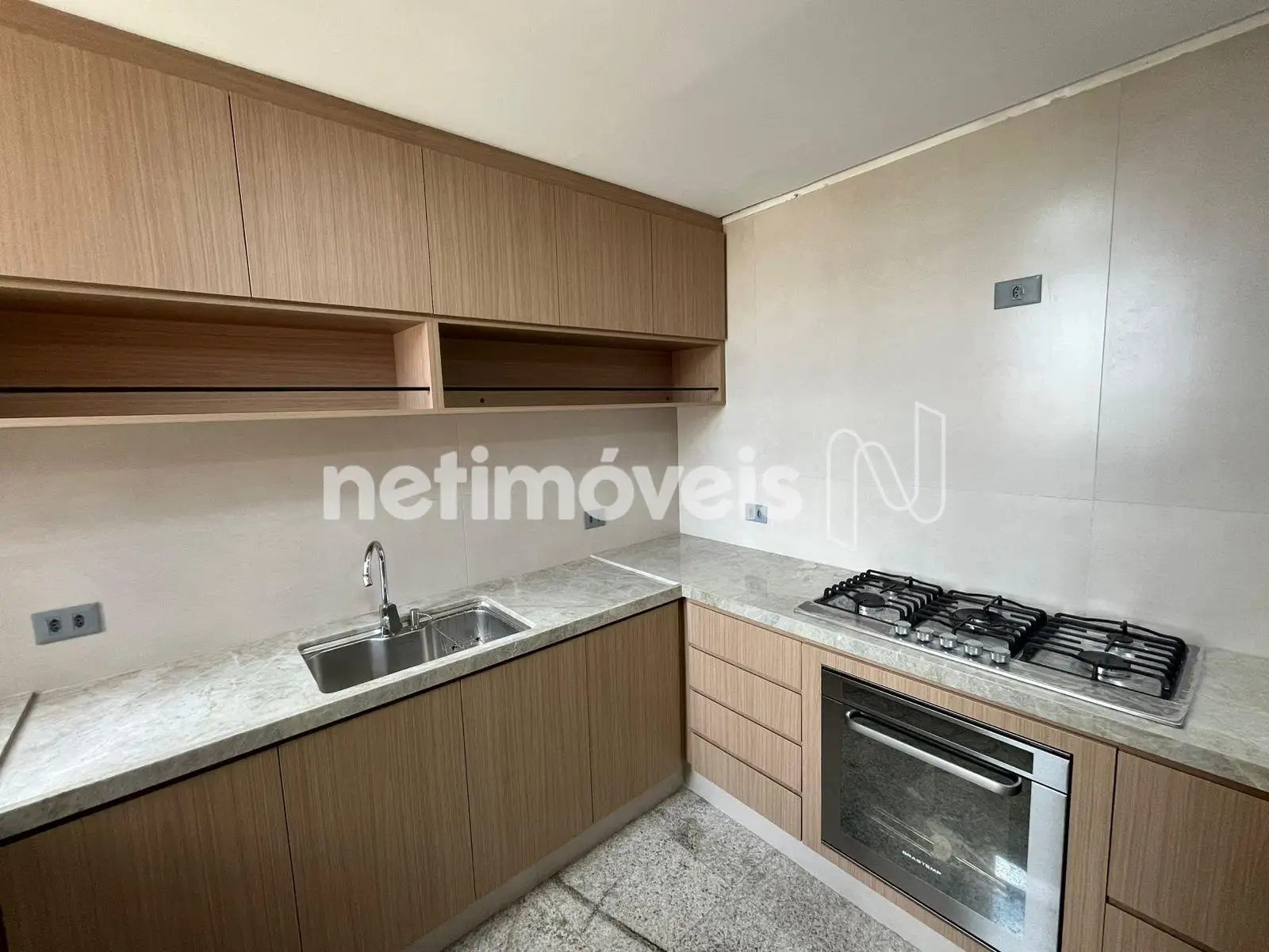 Cozinha com armários plnejados, piso e bancada em granito.
