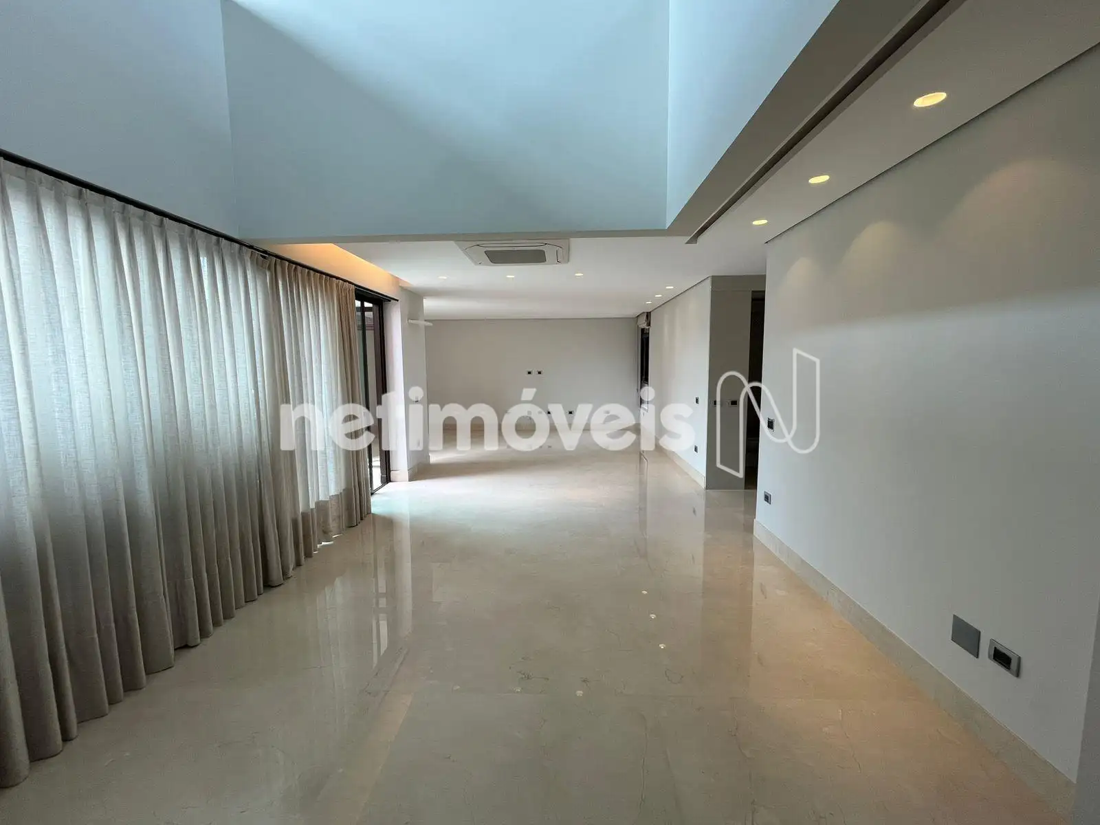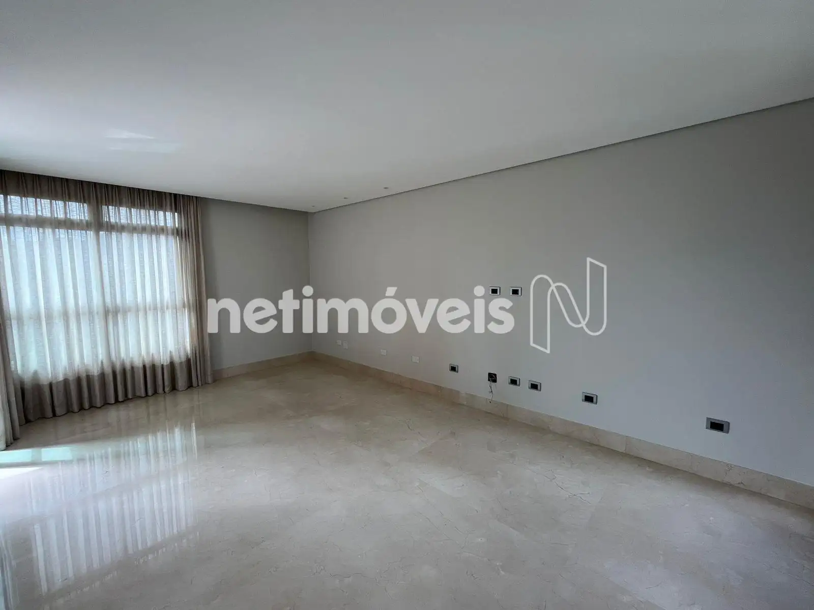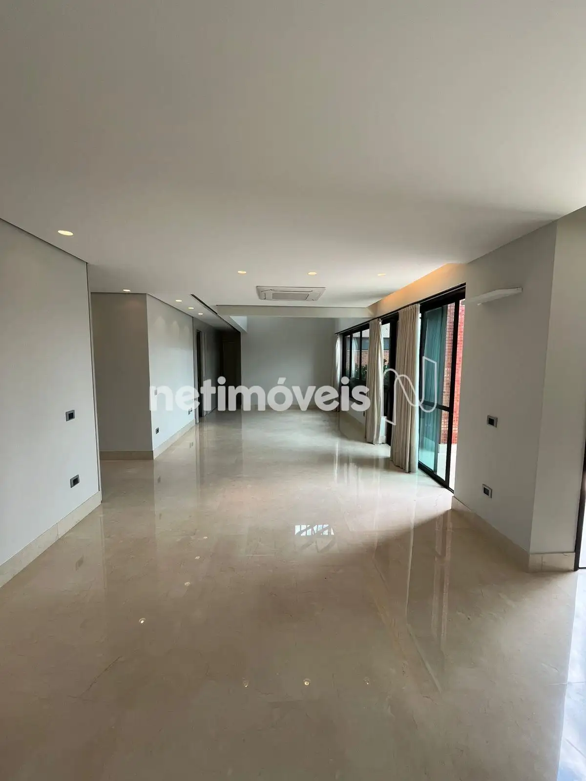 Sala para 3 ambientes com piso em mármore e varanda