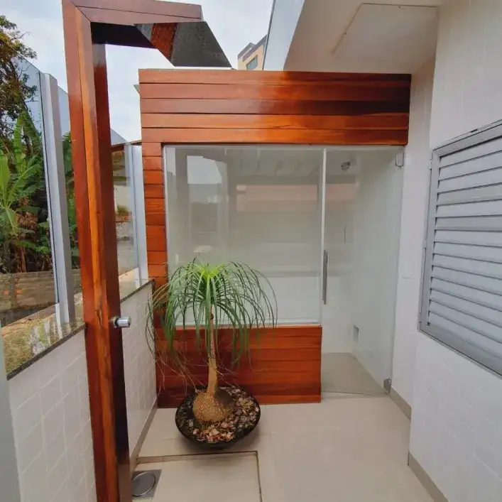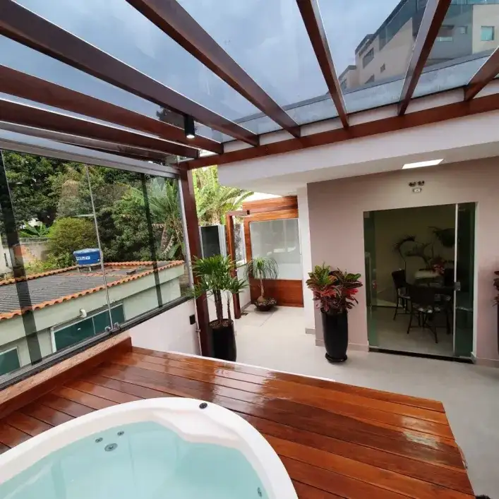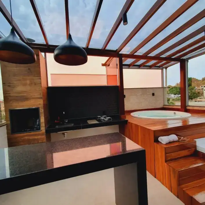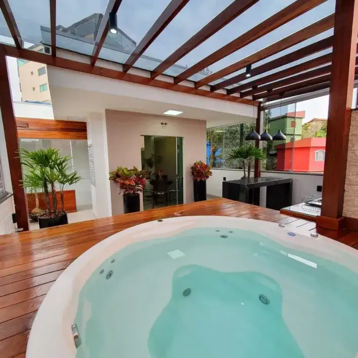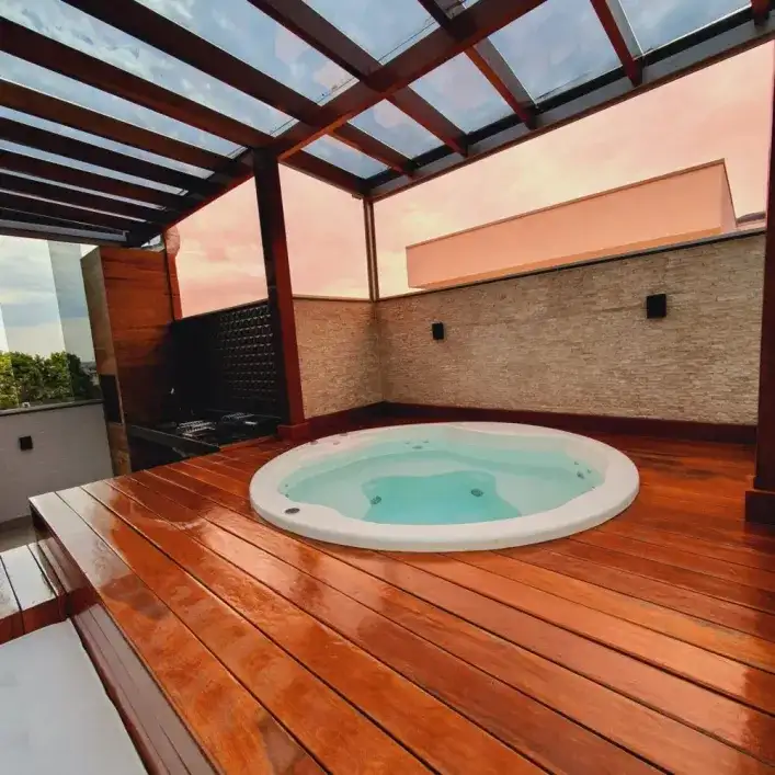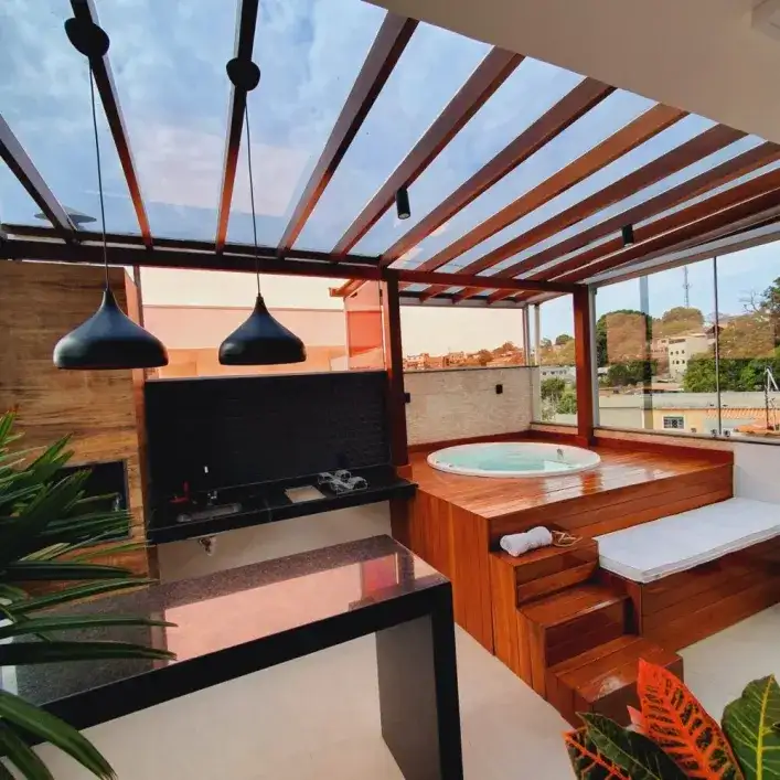 Área externa com espaço gourmet, jacuzzi e sauna.