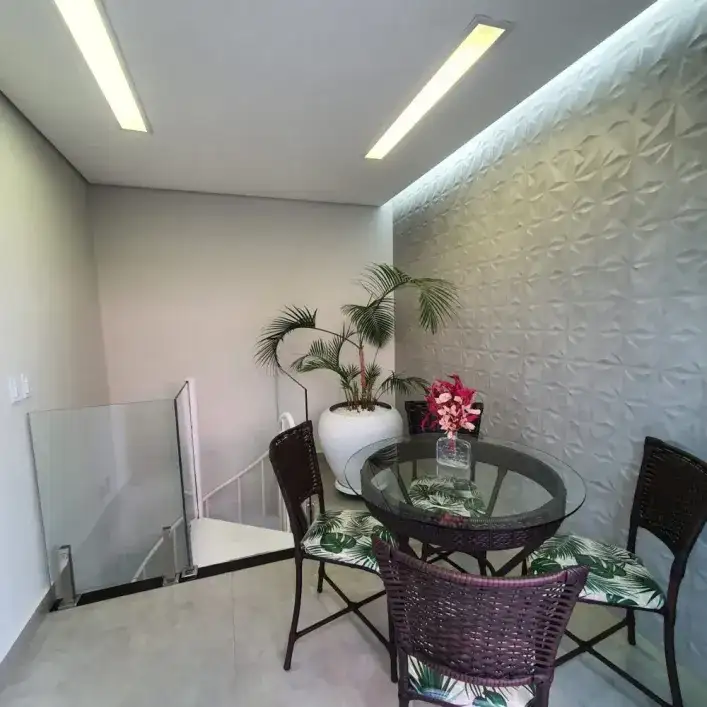 Sala para dois ambientes, teto com rebaixamento em gesso e sistema de iluminação planejada.