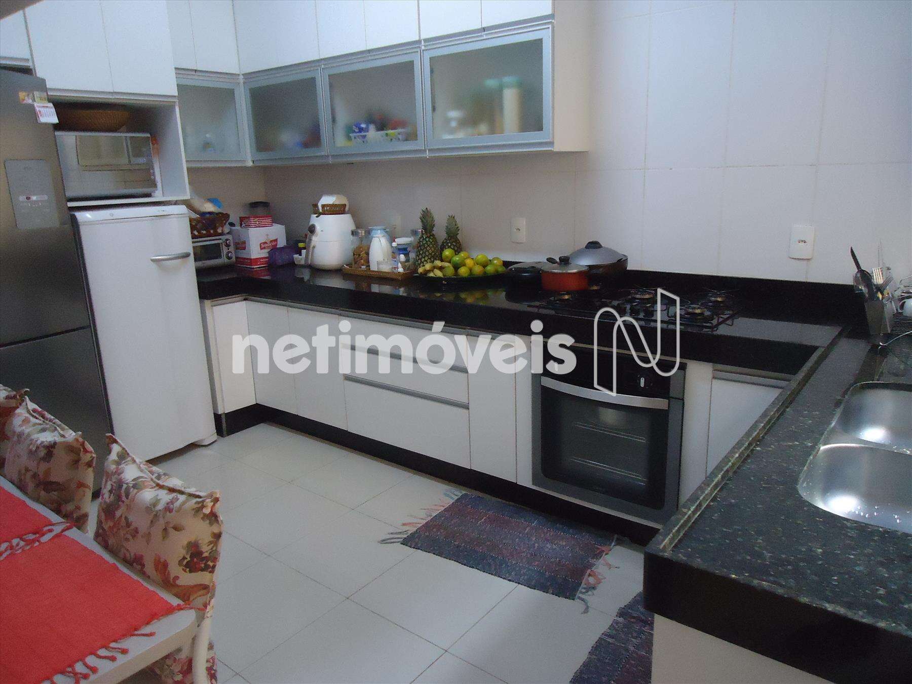Cozinha ampla com armários planejados, bancada em granito preto, piso em cerâmica, fogão cooktop e forno embutido.